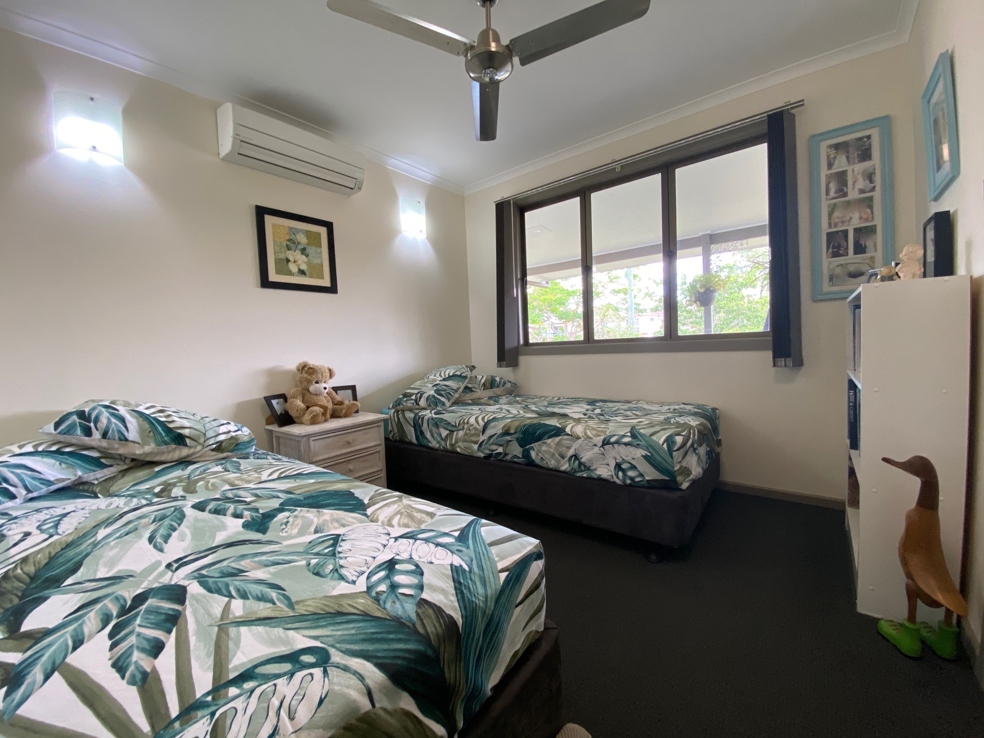 Additionally, upstairs are 3 carpeted bedrooms, each with built in wardrobes, split system air cons and ceiling fans. The upstairs bathroom features a vanity, toilet and shower over bath.