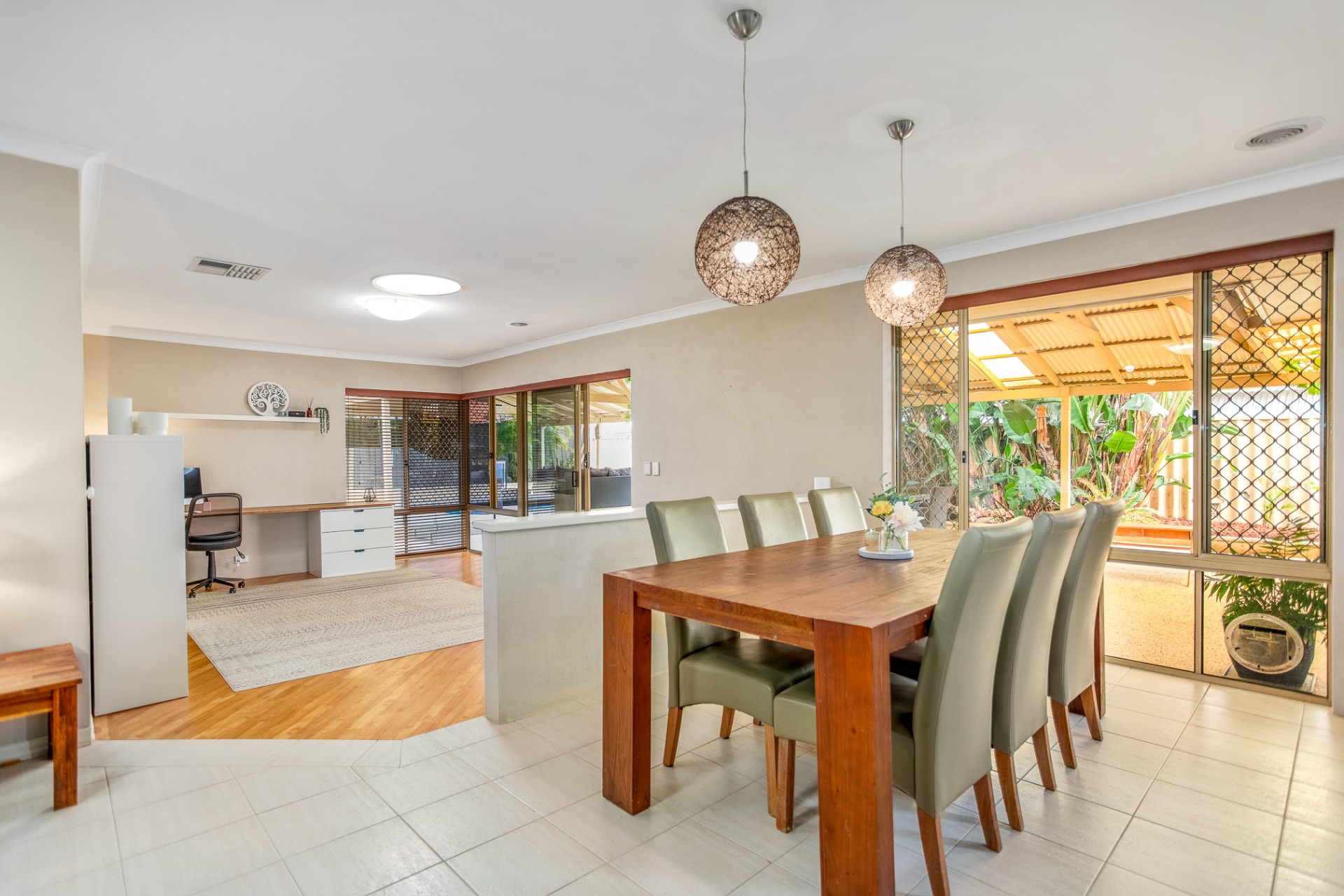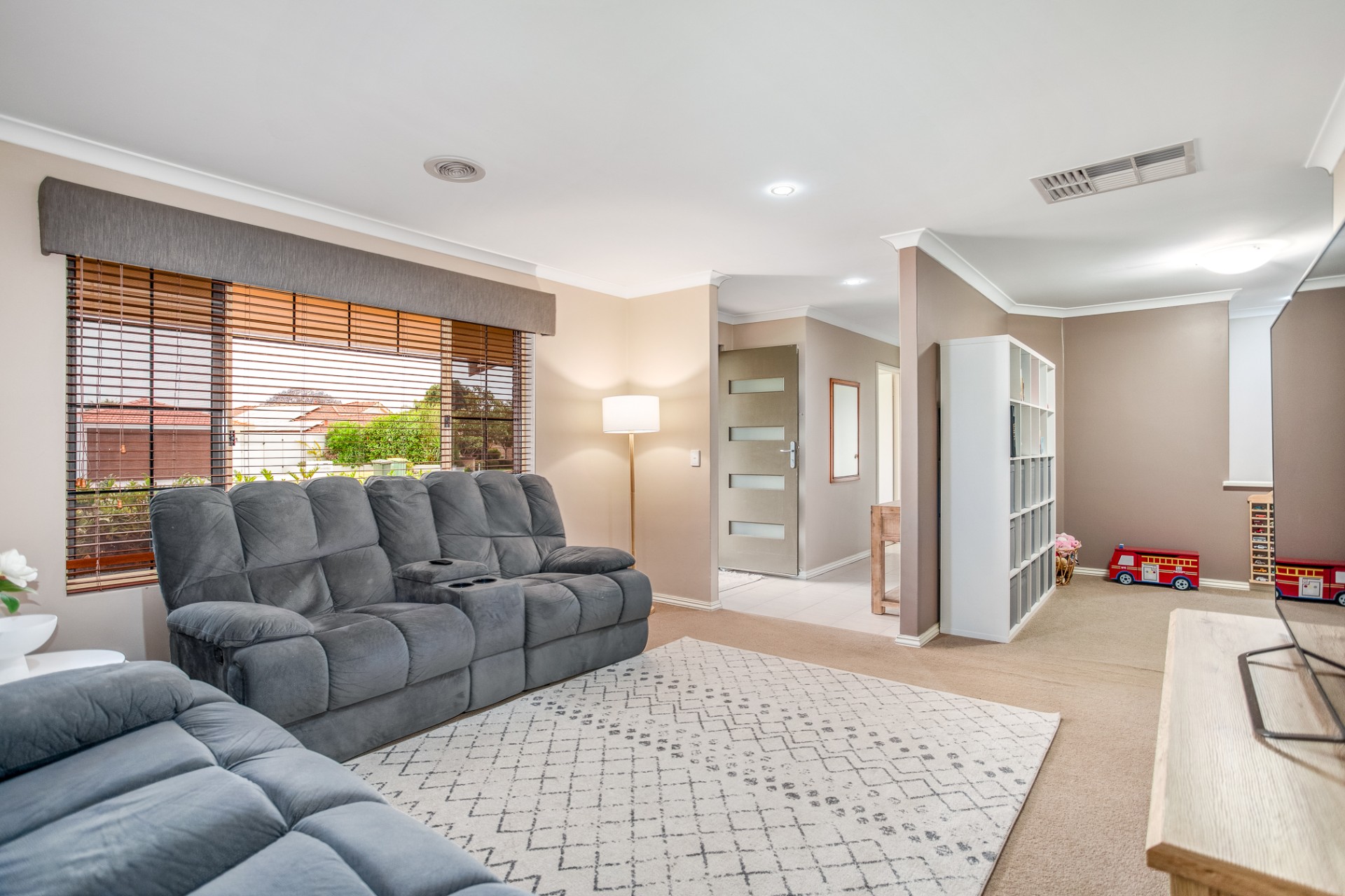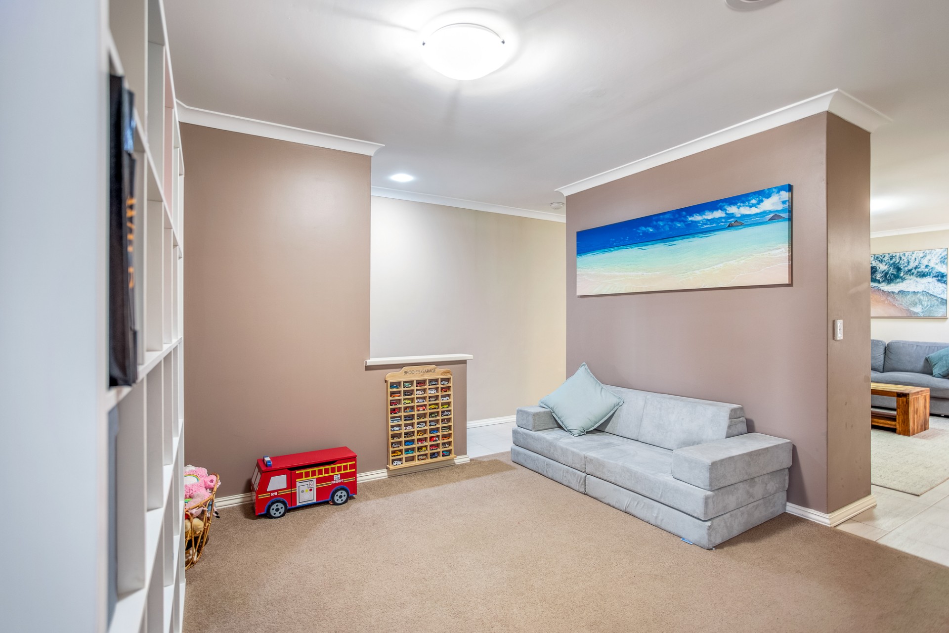 The large open plan kitchen and dining area leads into a sunken games/activity space, and main living/lounge area. A formal dining room (currently utilised as a toy room) separates the main living space from an additional lounge space at the front of the home.