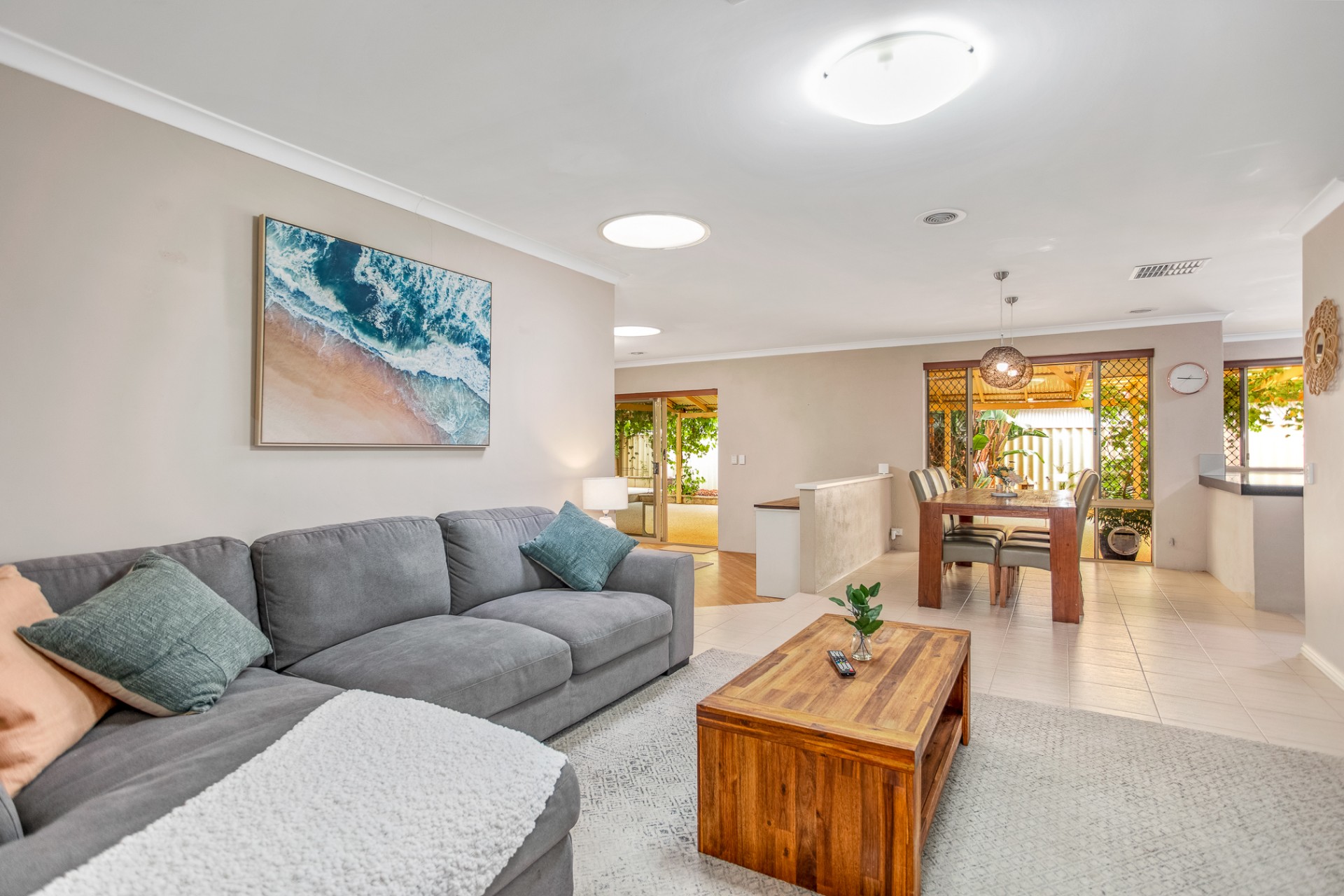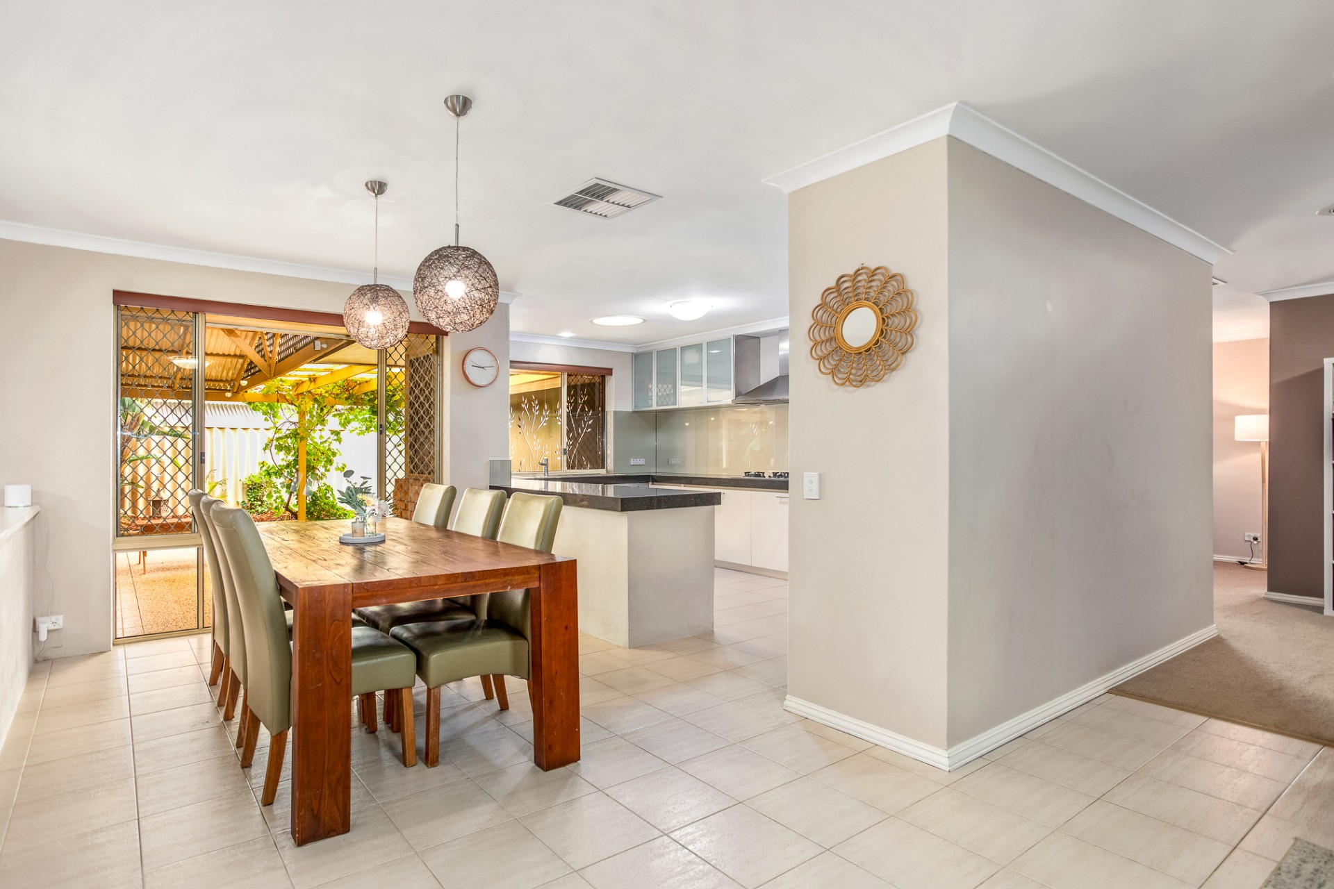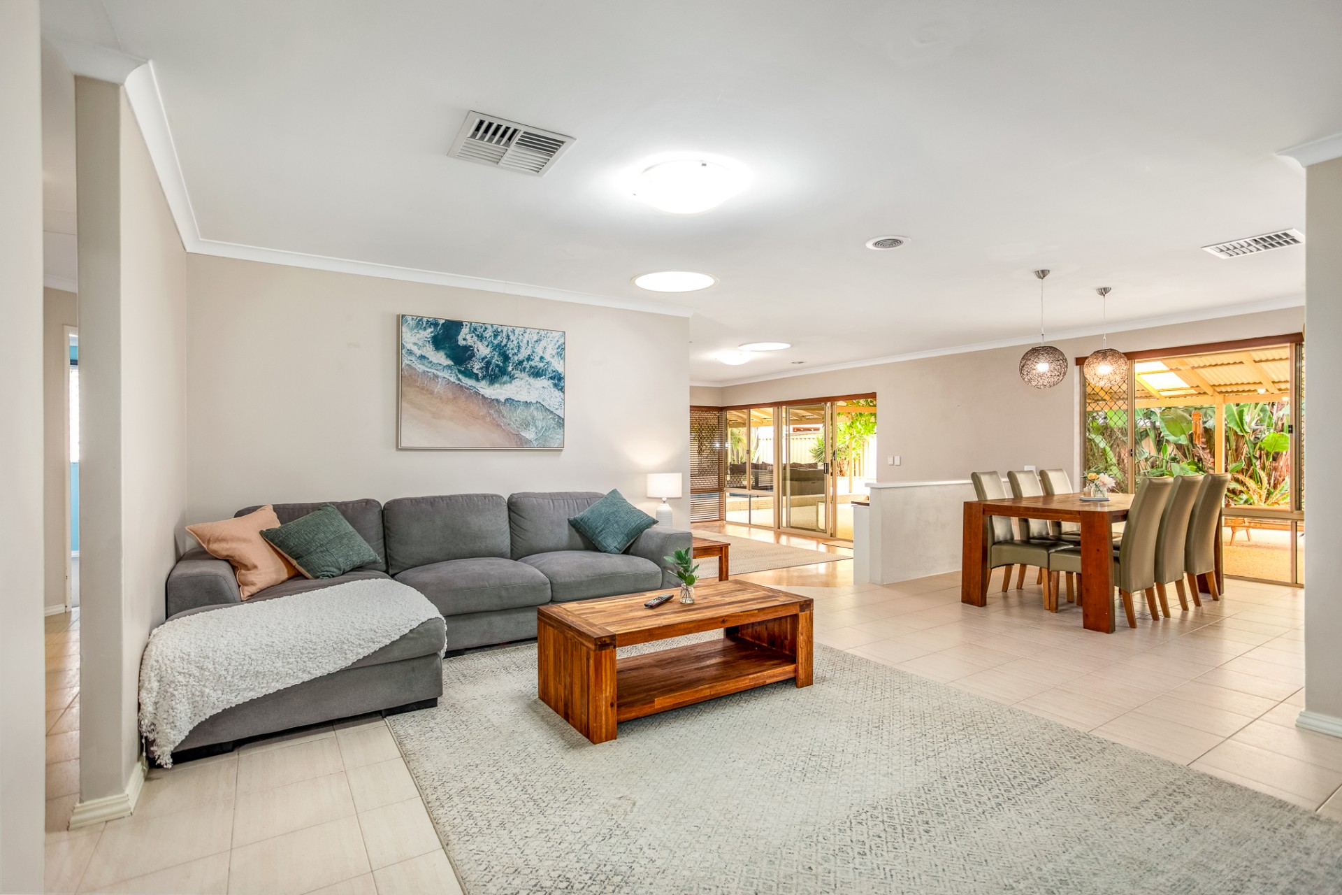 The large open plan kitchen and dining area leads into a sunken games/activity space, and main living/lounge area. A formal dining room (currently utilised as a toy room) separates the main living space from an additional lounge space at the front of the home.