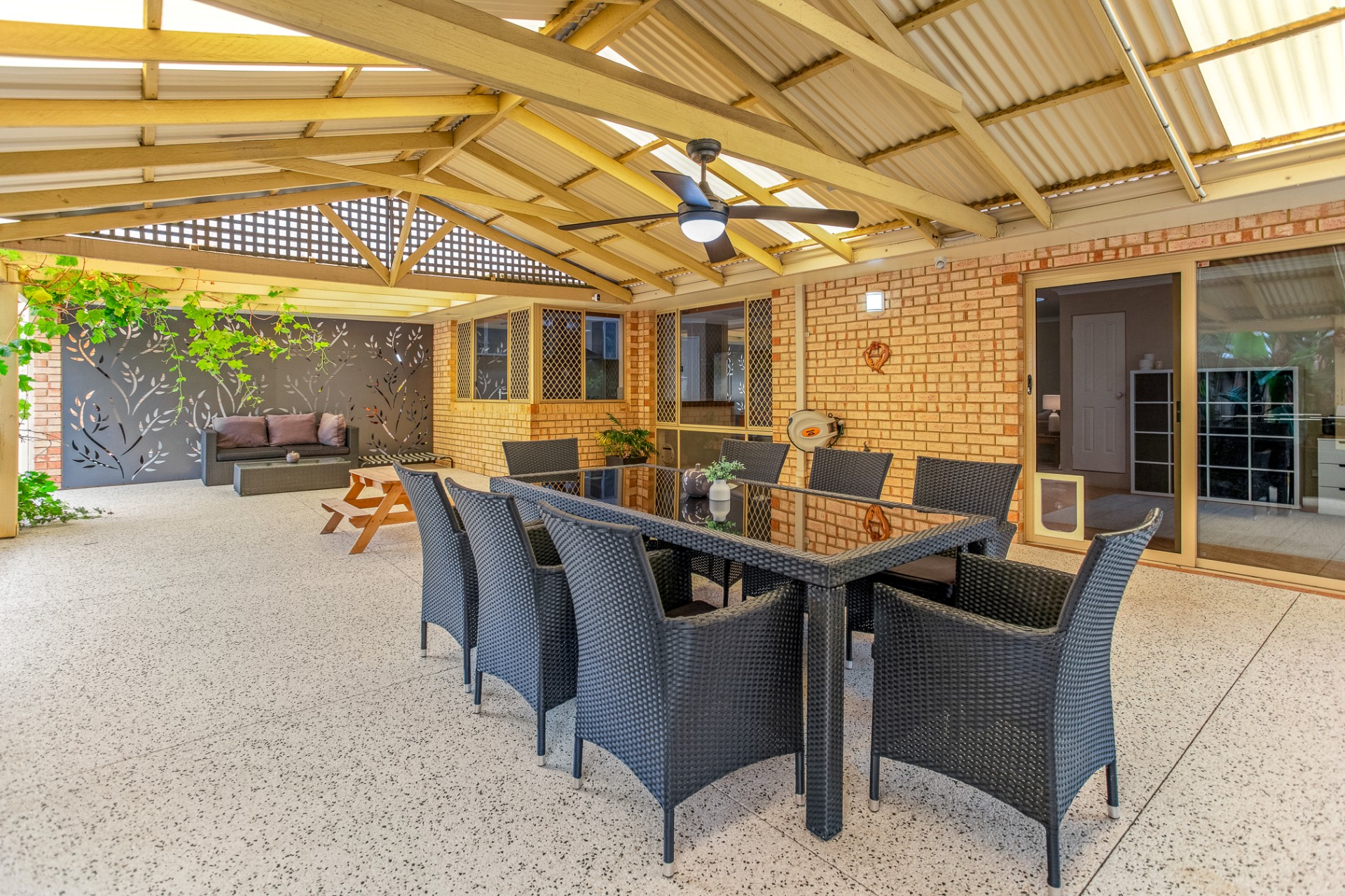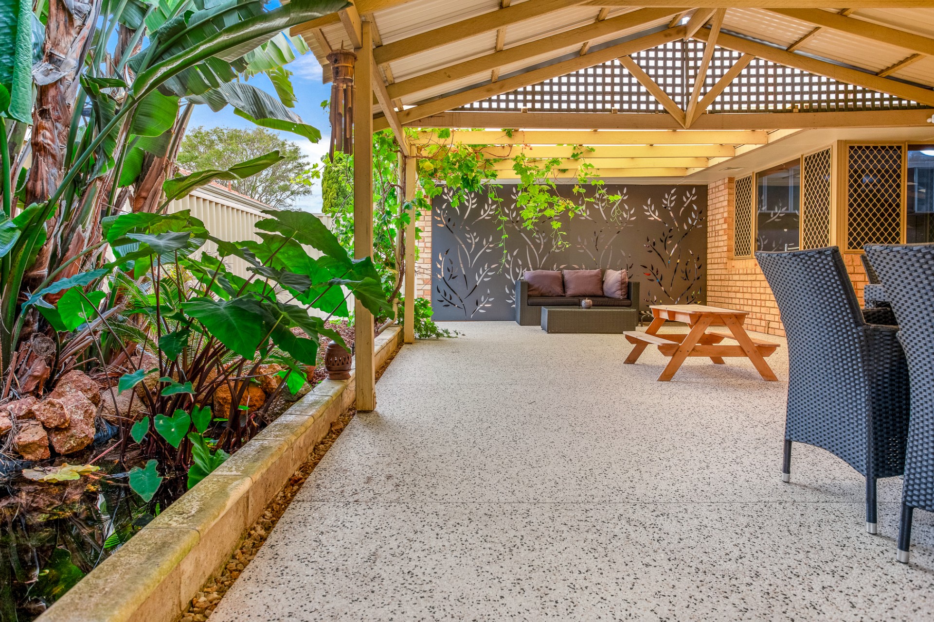 Grapevines and a well-established mango tree provide endless fruit throughout summer. Garden beds are reticulated with well-established plants.