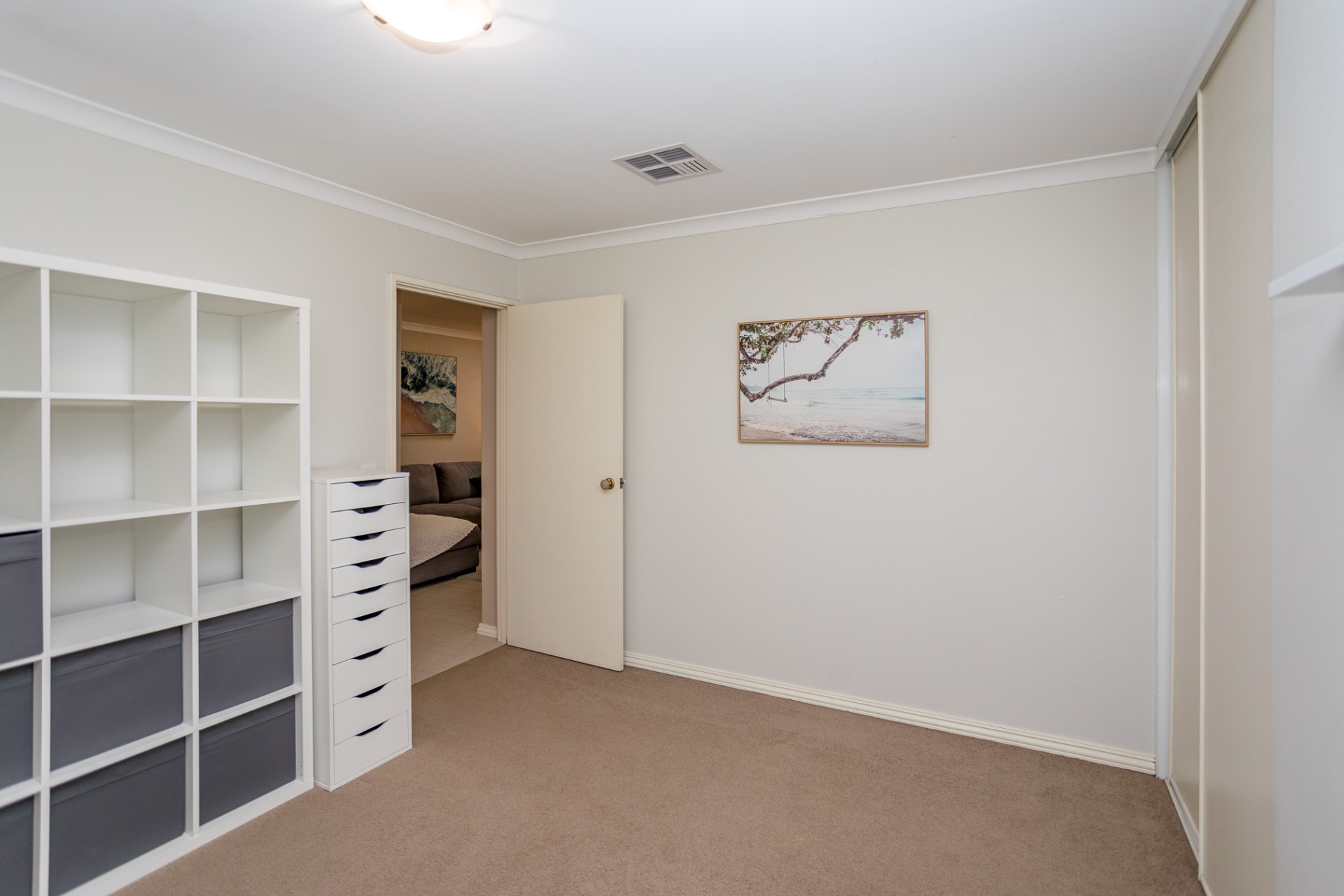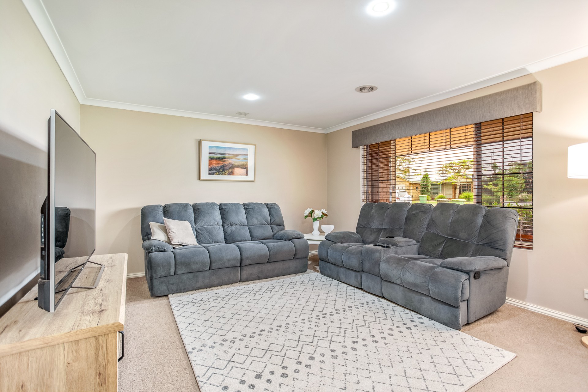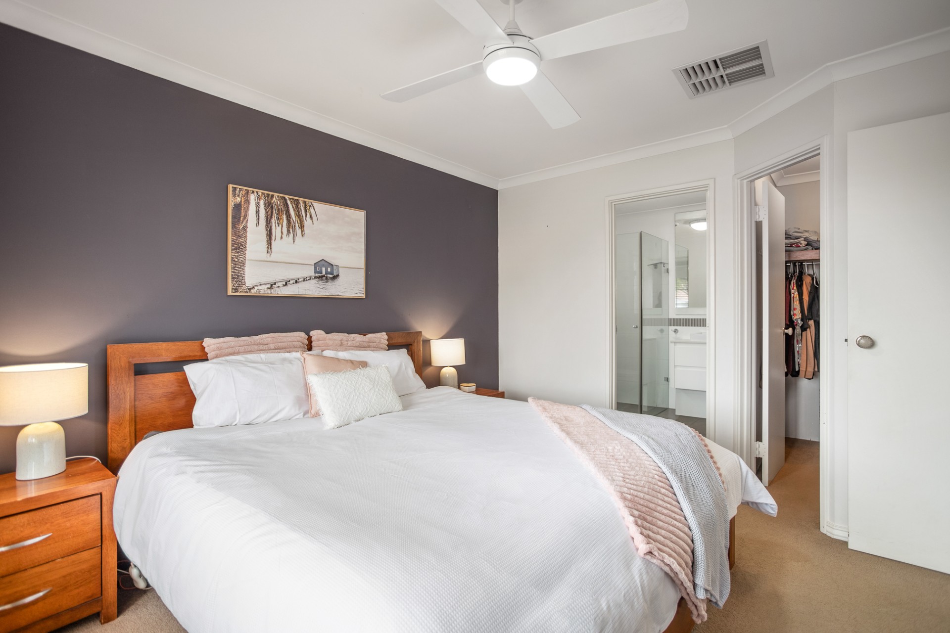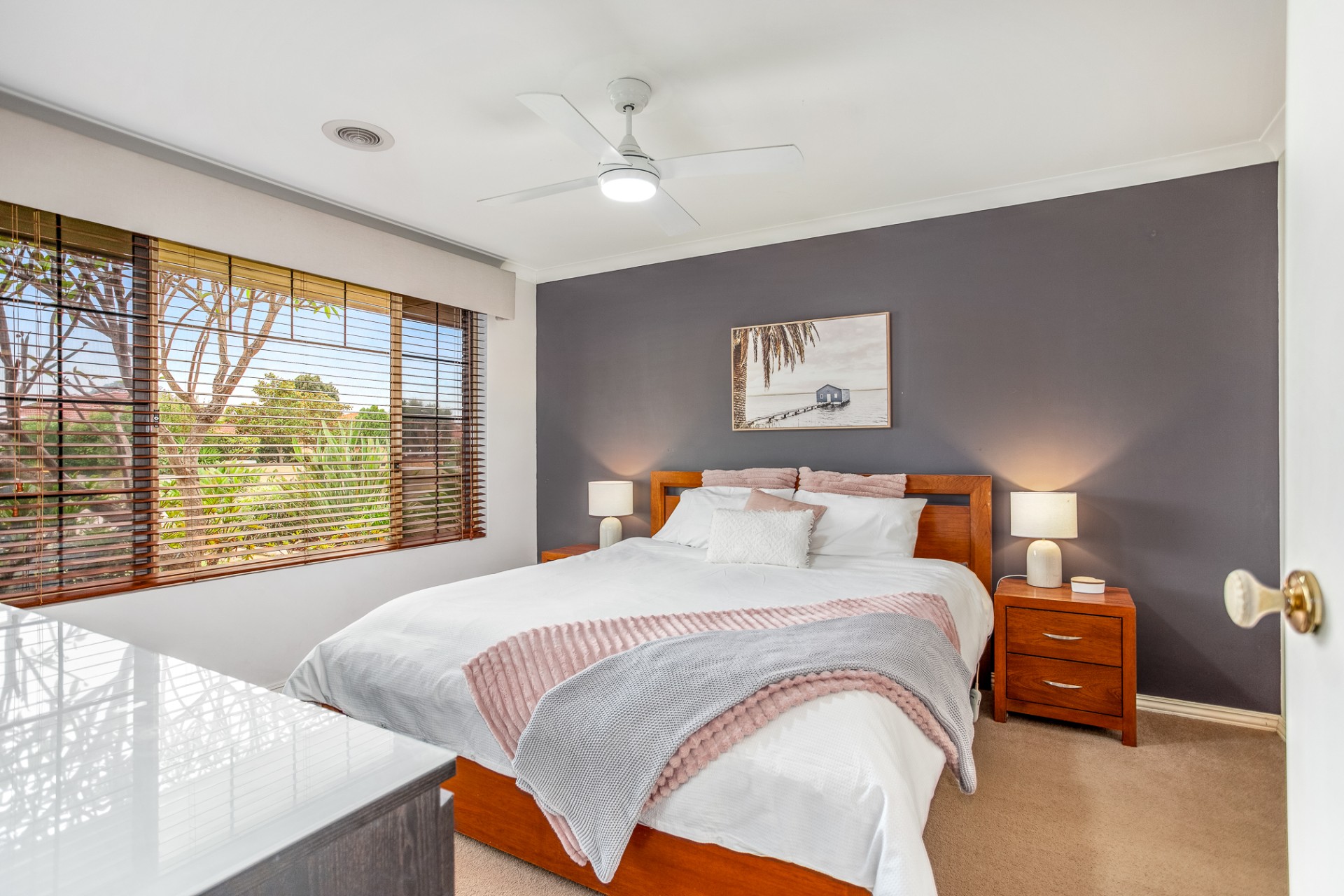 The master bedroom is king sized, with a large walk-in robe, carpet and venetian blinds.