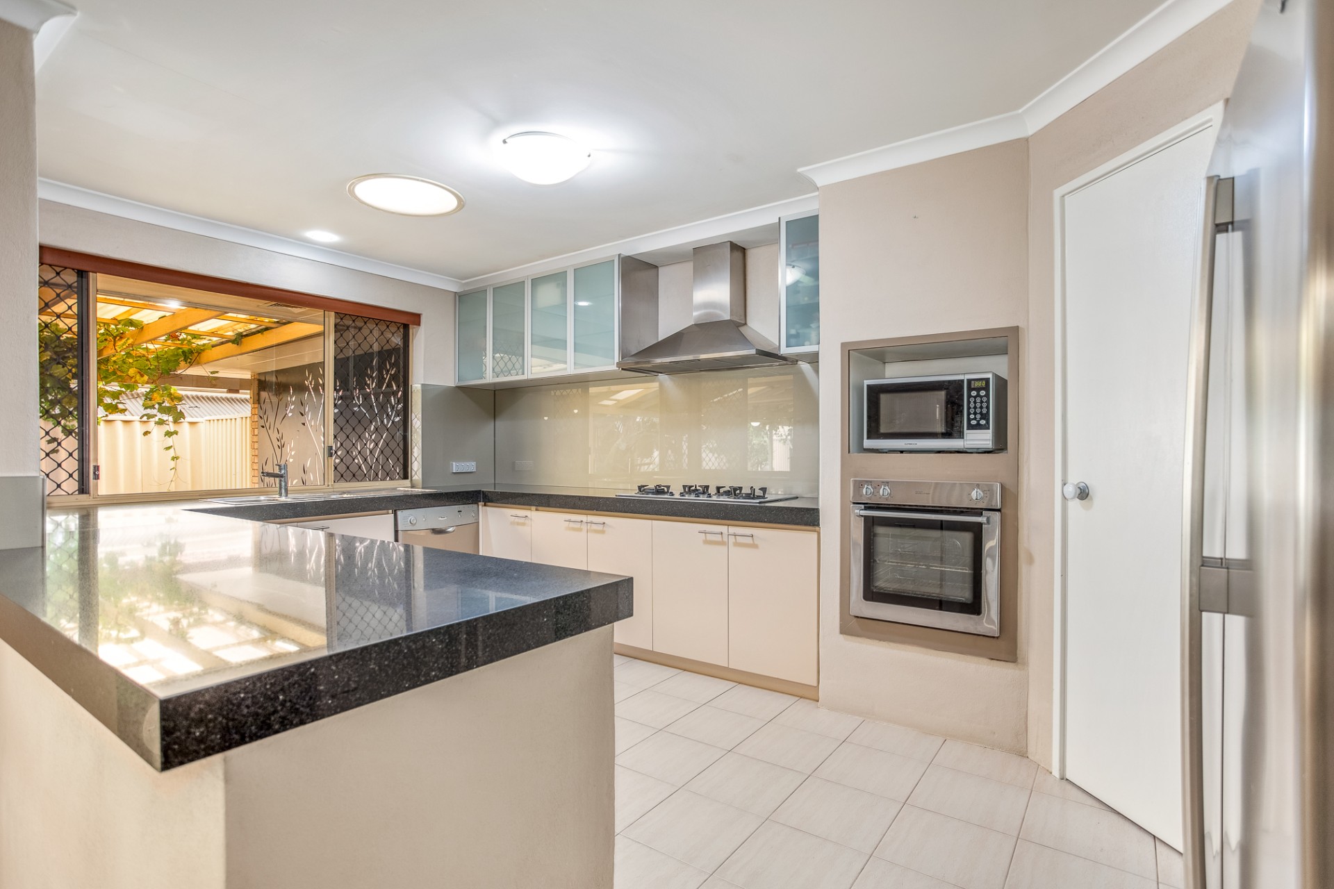 - Modern kitchen with plenty of storage and bench space. Walk-in pantry, stone benchtops, gas 5 burner stainless cooktop and rangehood, electric oven, and dishwasher included. Large fridge recess and microwave nook.
