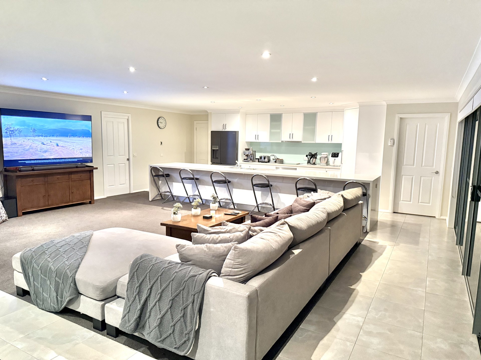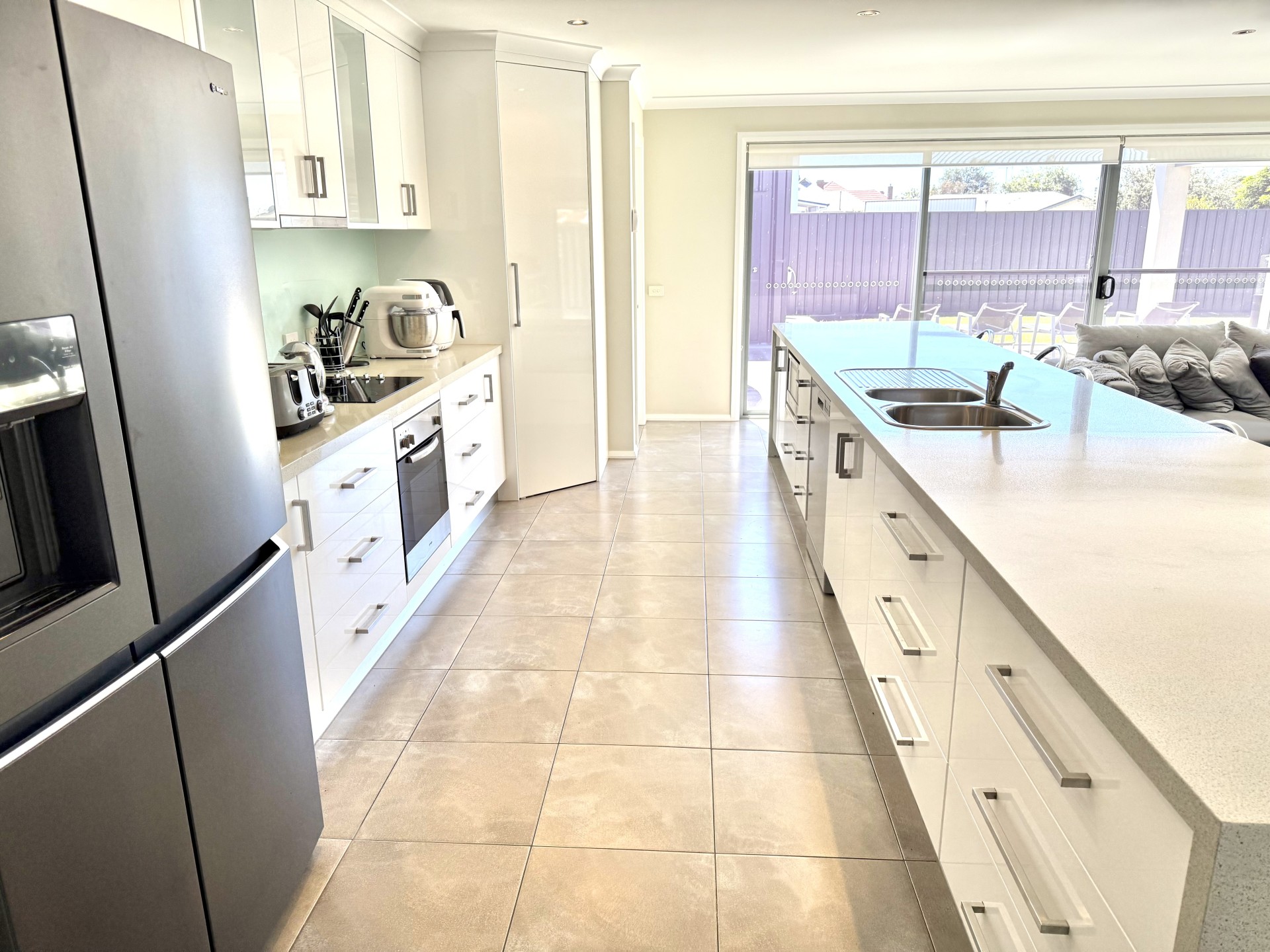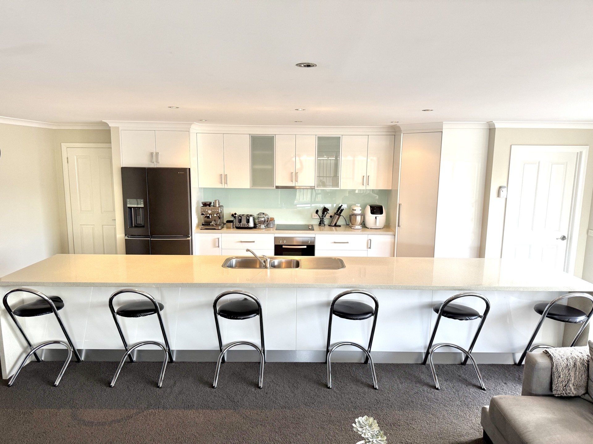The heart of the home is a sleek, modern kitchen tailored for any occasion. It boasts a generous island bench that doubles as a casual dining area, complemented by abundant storage solutions. Large glass sliding doors effortlessly connect the open-plan kitchen, living, and dining space to an inviting outdoor alfresco zone, making it a perfect setting for gatherings with family and friends.