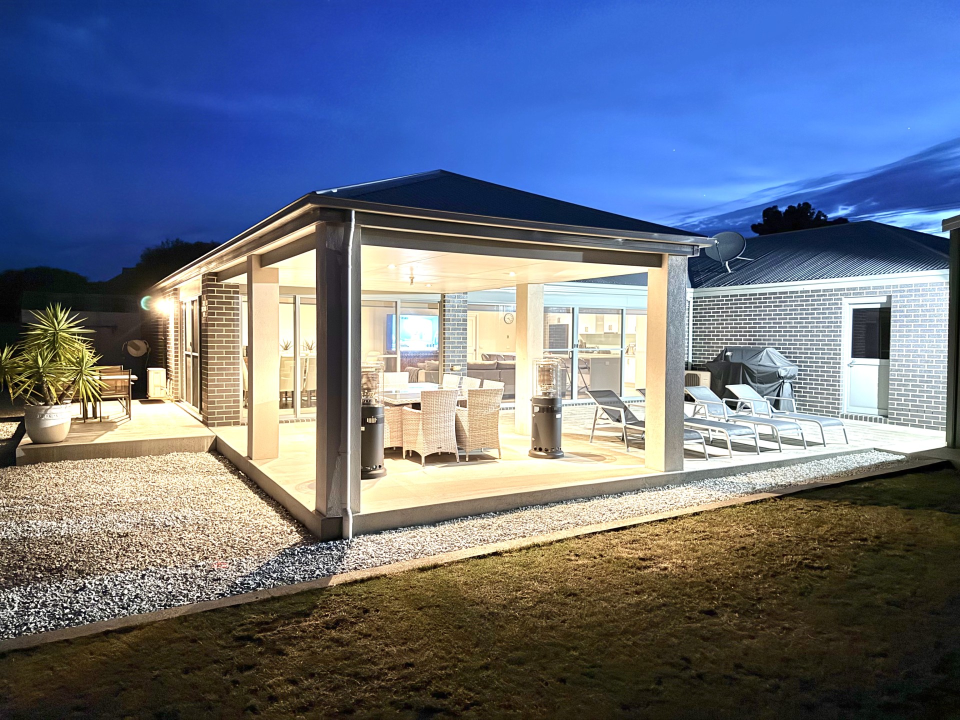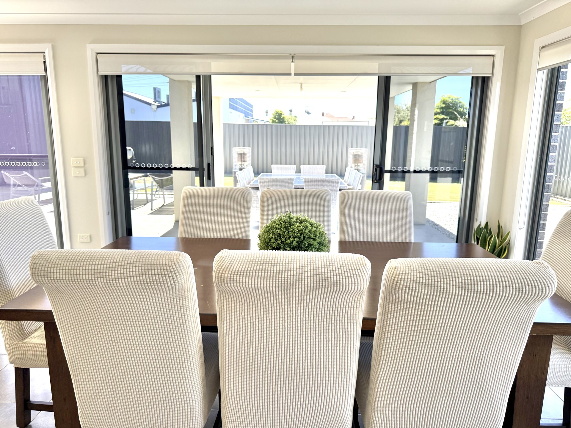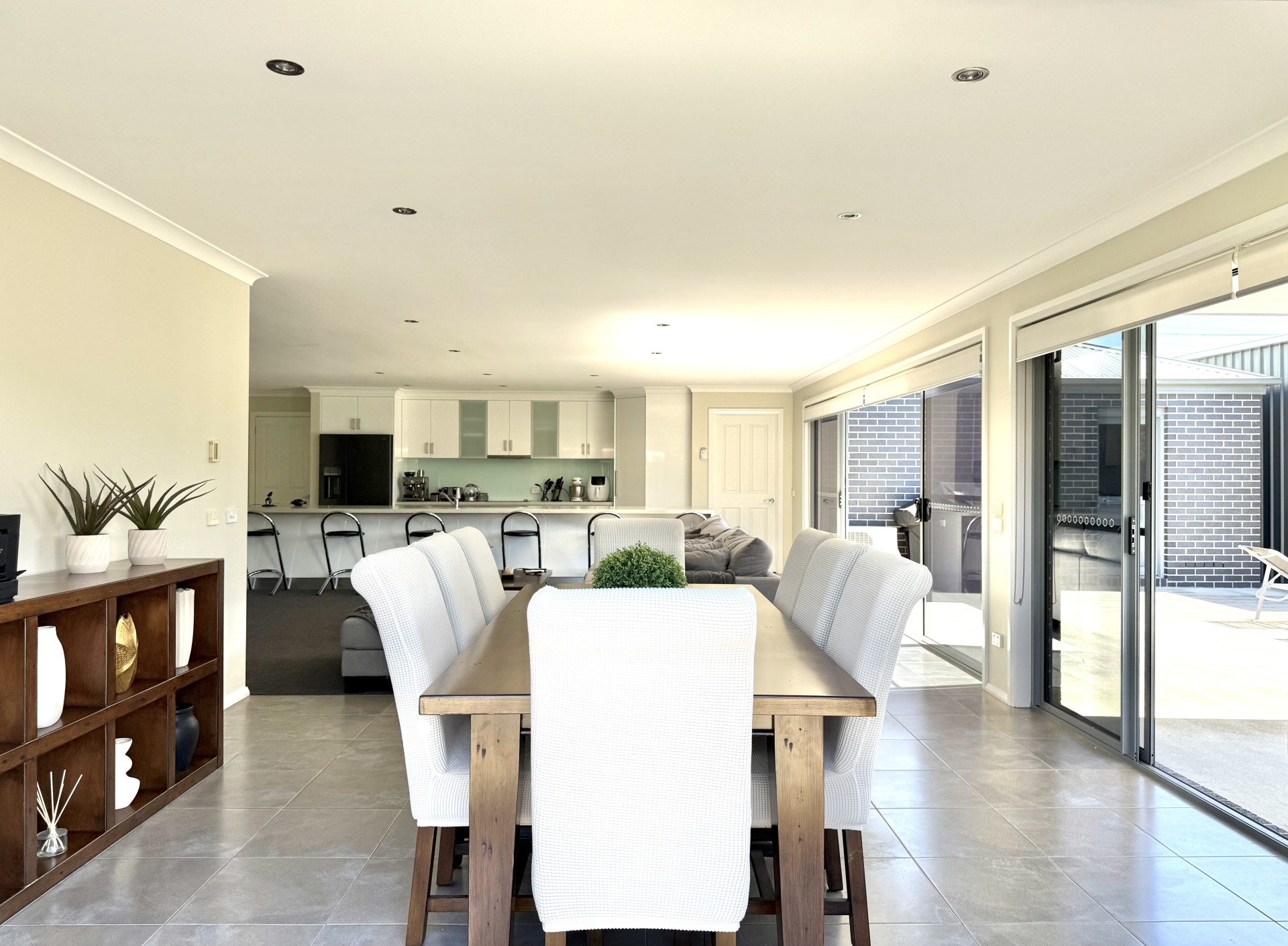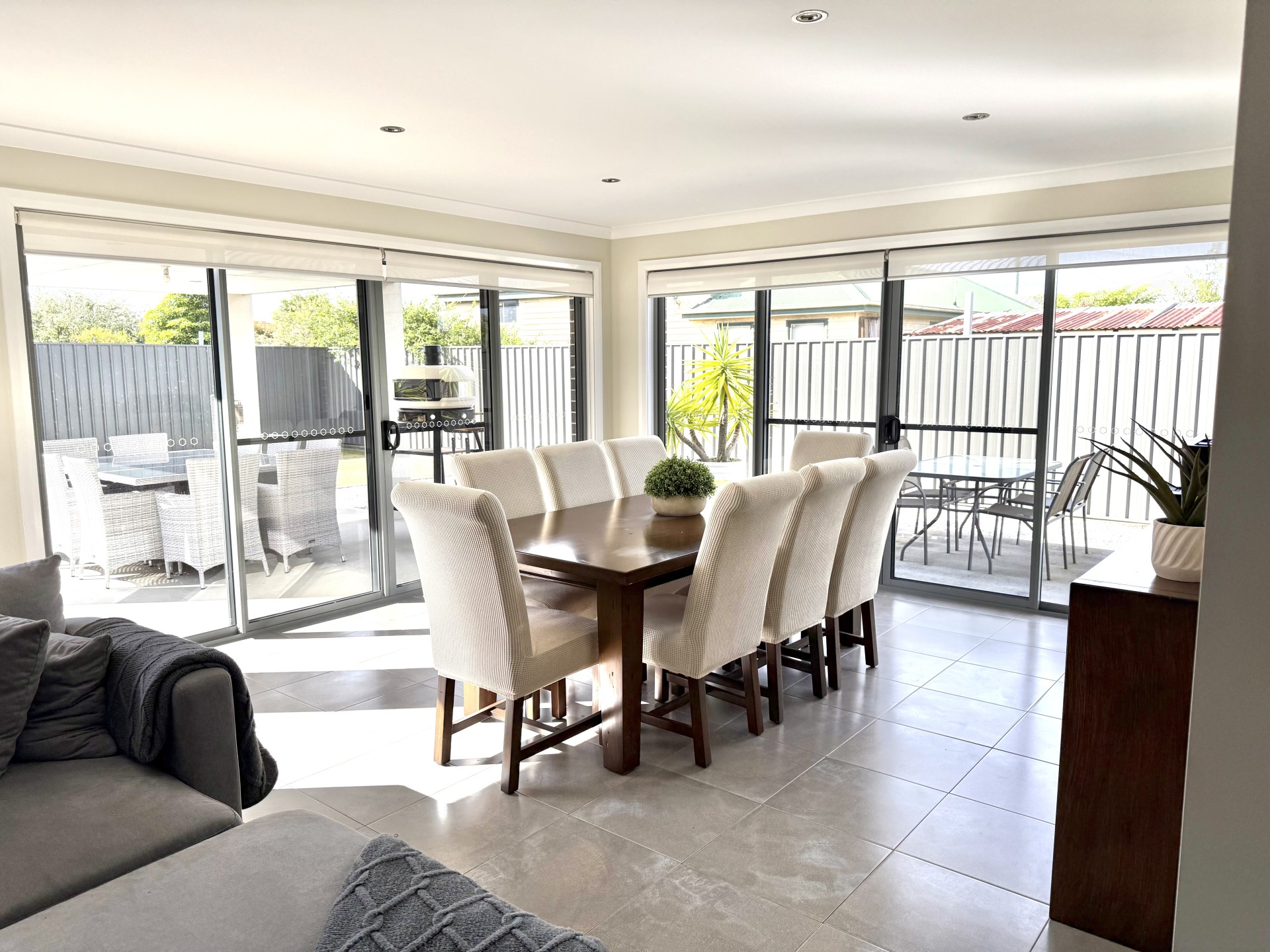The heart of the home is a sleek, modern kitchen tailored for any occasion. It boasts a generous island bench that doubles as a casual dining area, complemented by abundant storage solutions. Large glass sliding doors effortlessly connect the open-plan kitchen, living, and dining space to an inviting outdoor alfresco zone, making it a perfect setting for gatherings with family and friends.