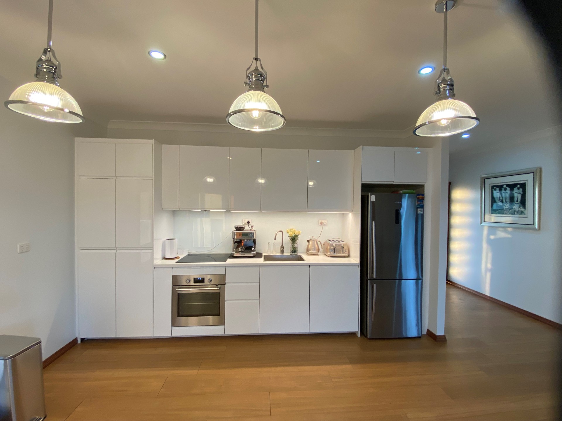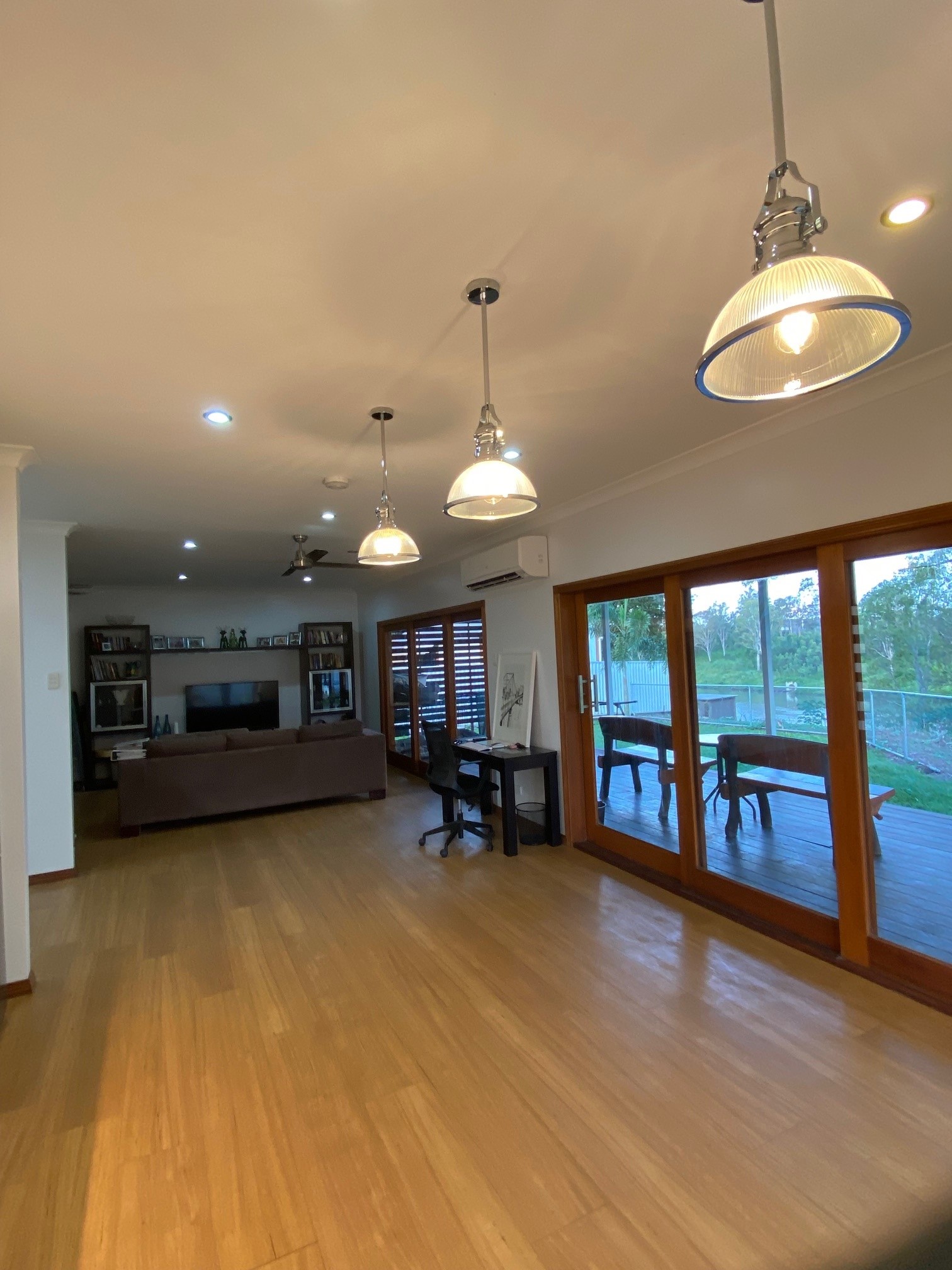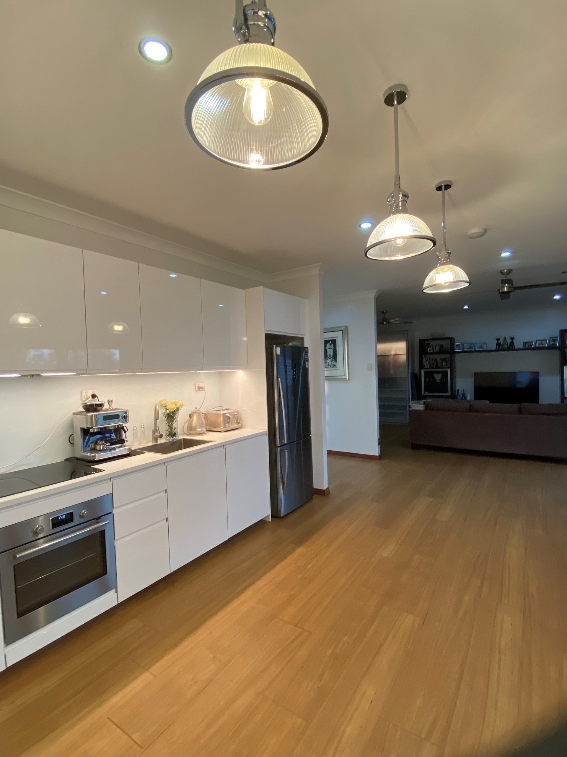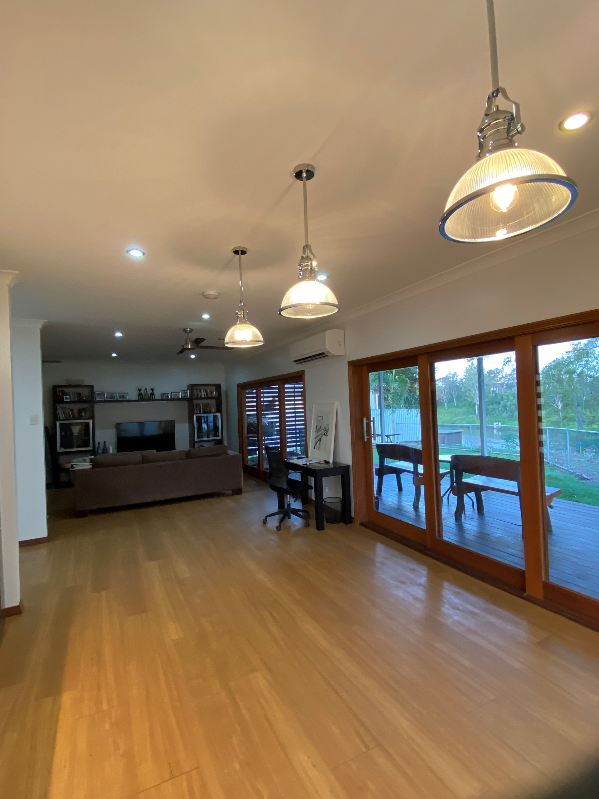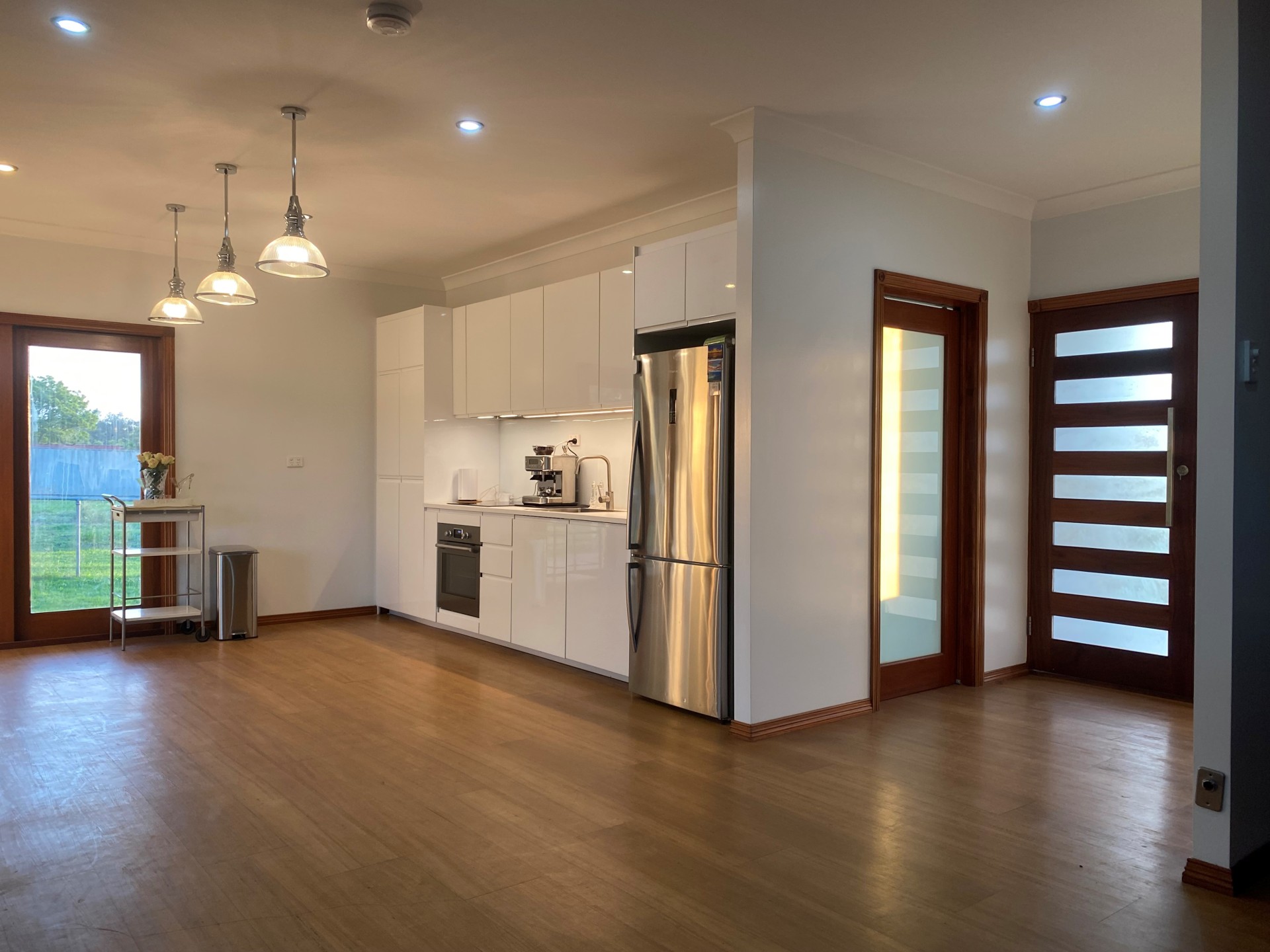 The brand new, spacious kitchen combines as a dining room and also has beautiful views of the river and greenery. Ample cupboard space, dishwasher, stunning glass/silver hanging pendant lights. The home features ample windows throughout which spoils with light and views of both the water and the green paddocks from all rooms.