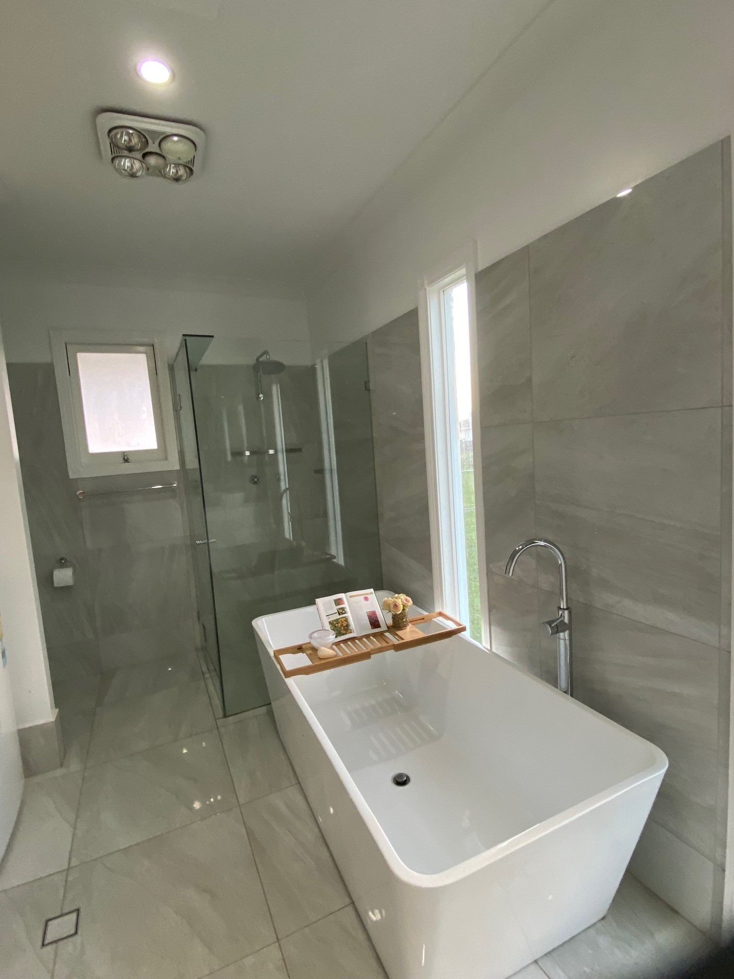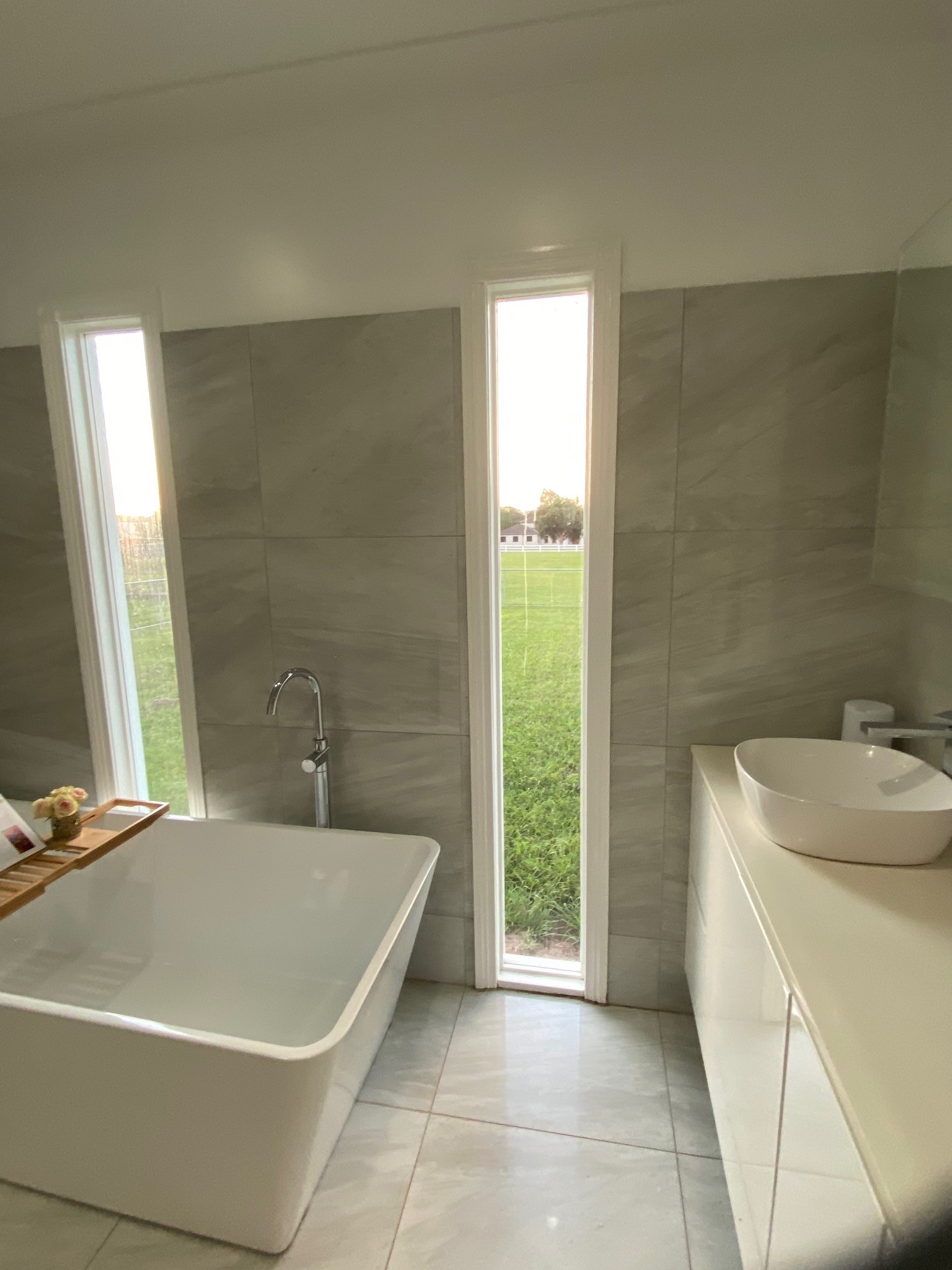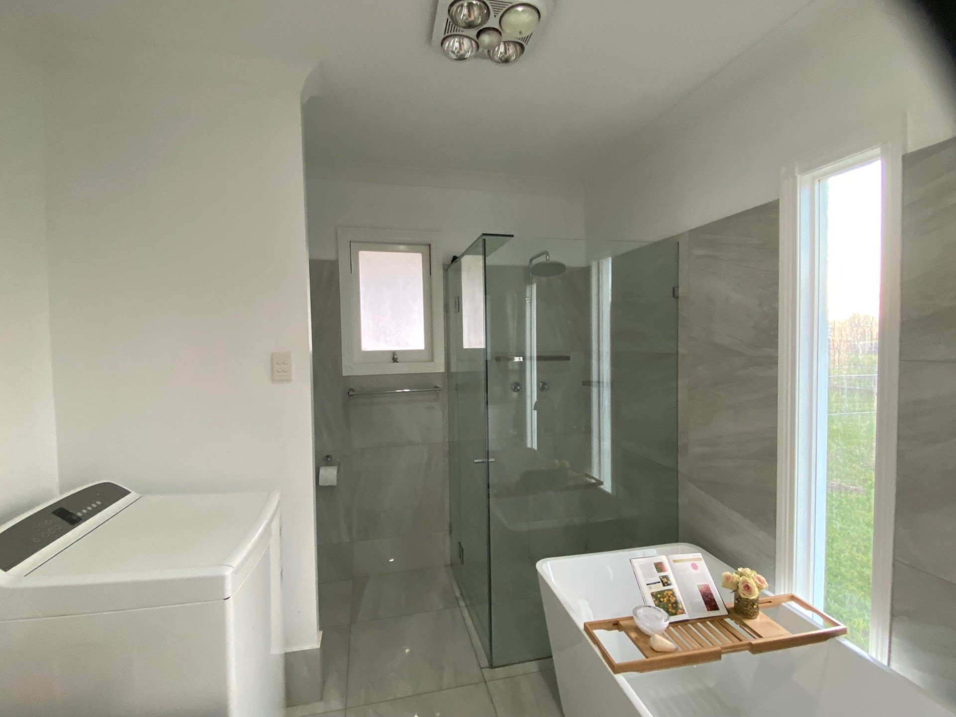 The large modern bathroom has an over-sized shower and huge modern bathtub, combined laundry, with beautiful tall windows that look out over the lush green paddocks.
