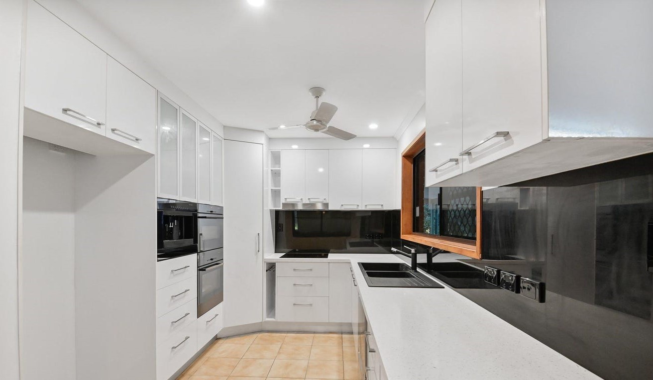 - Modern custom built kitchen with high end appliances such as a built-in coffee machine, oven, dishwasher, and induction stovetop