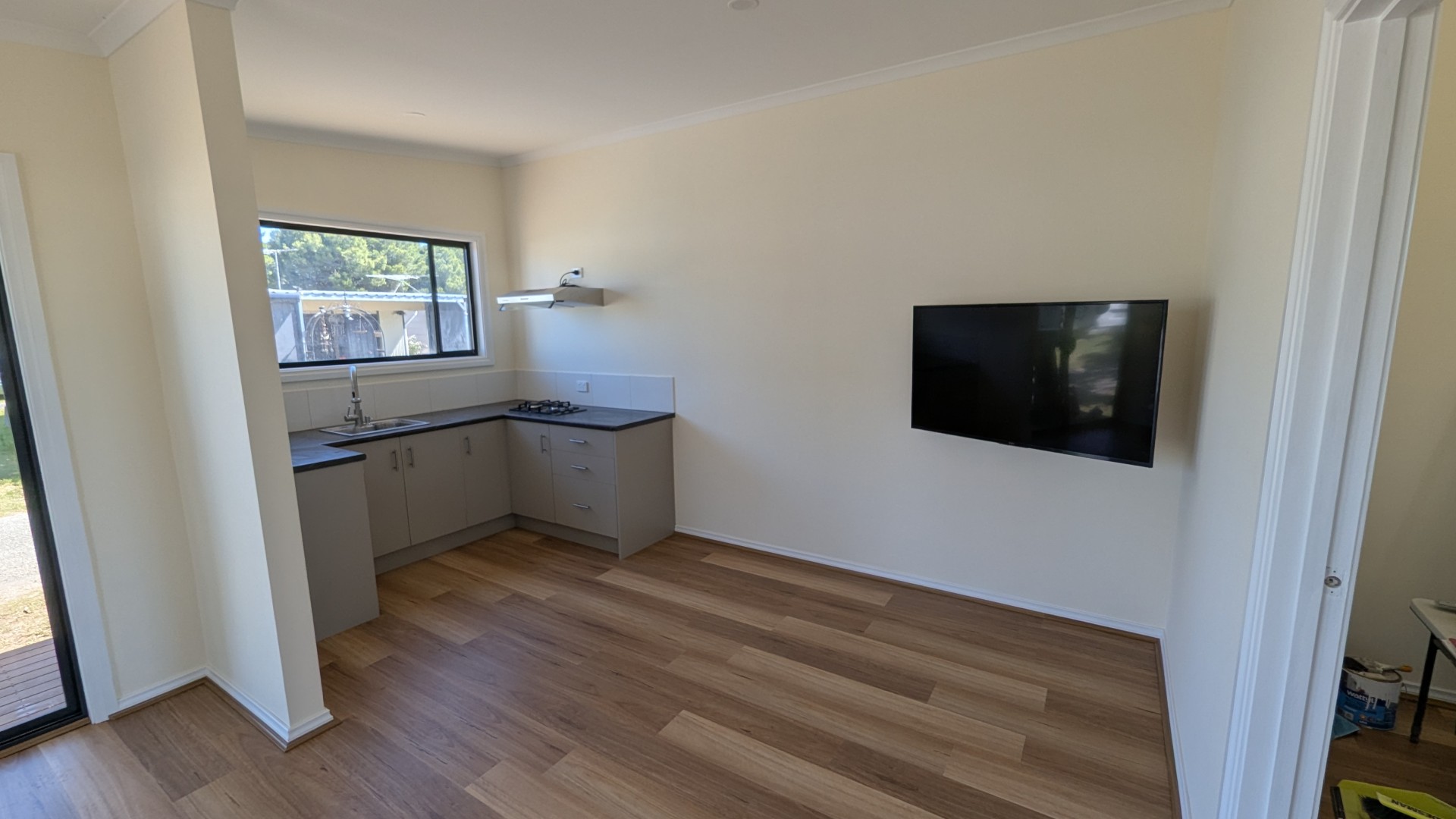 Just completed full fitout including : new walls, floors and floating floor, ceilings (all fully insulated), reverse cycle airconditioner, kitchen, bedroom with ceiling fan. Also included wall mounted Sony 48" smart TV.
