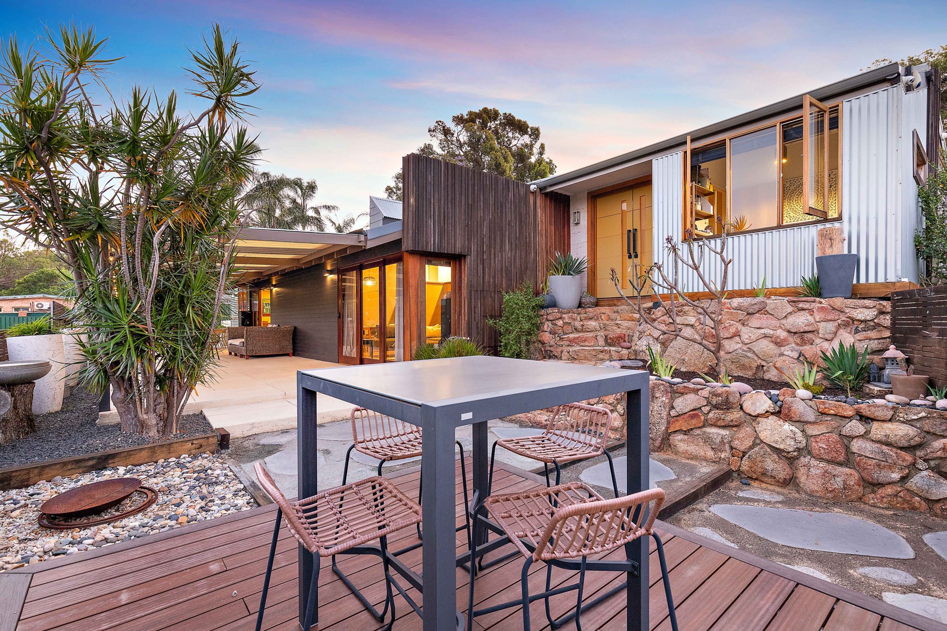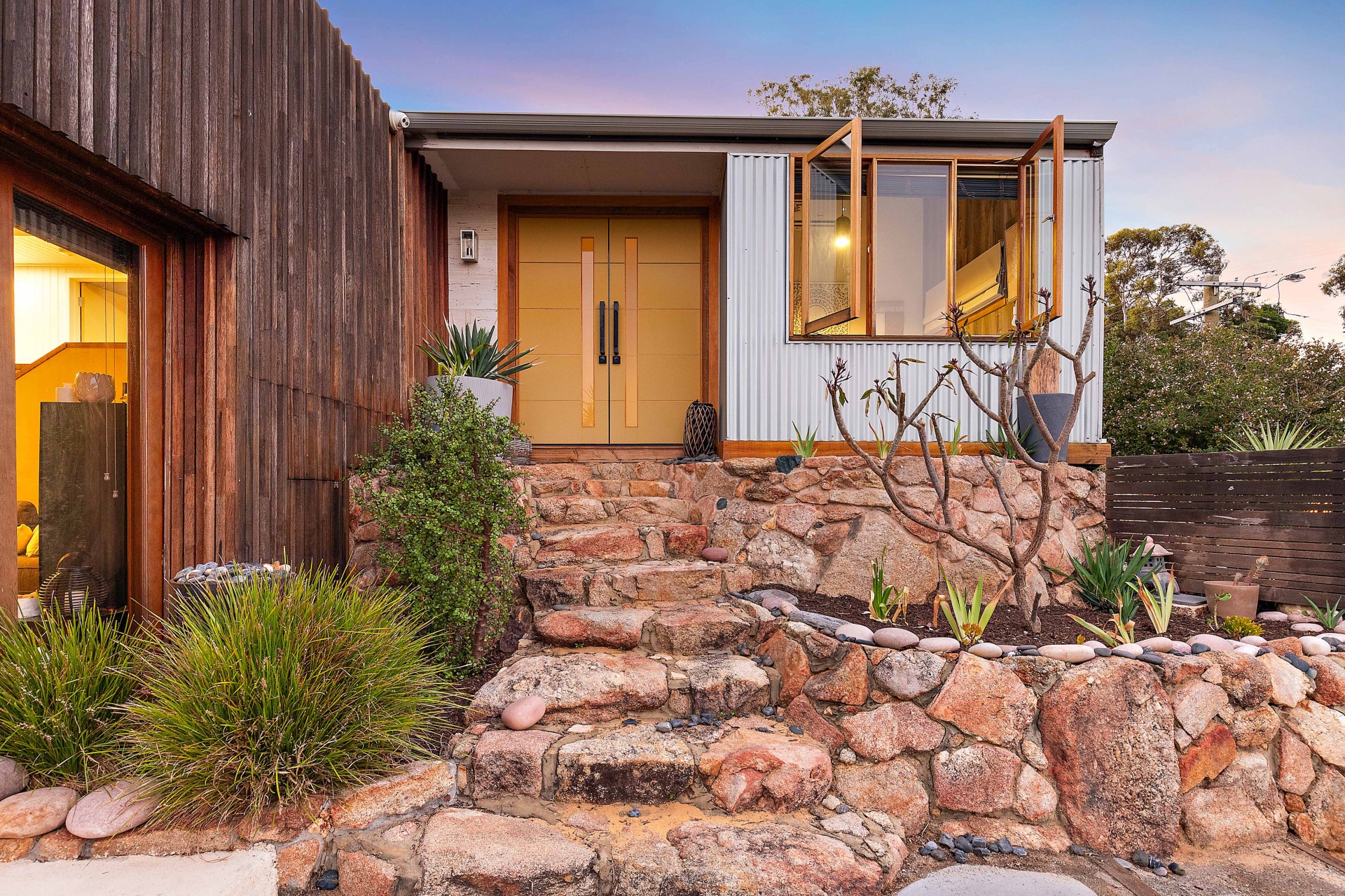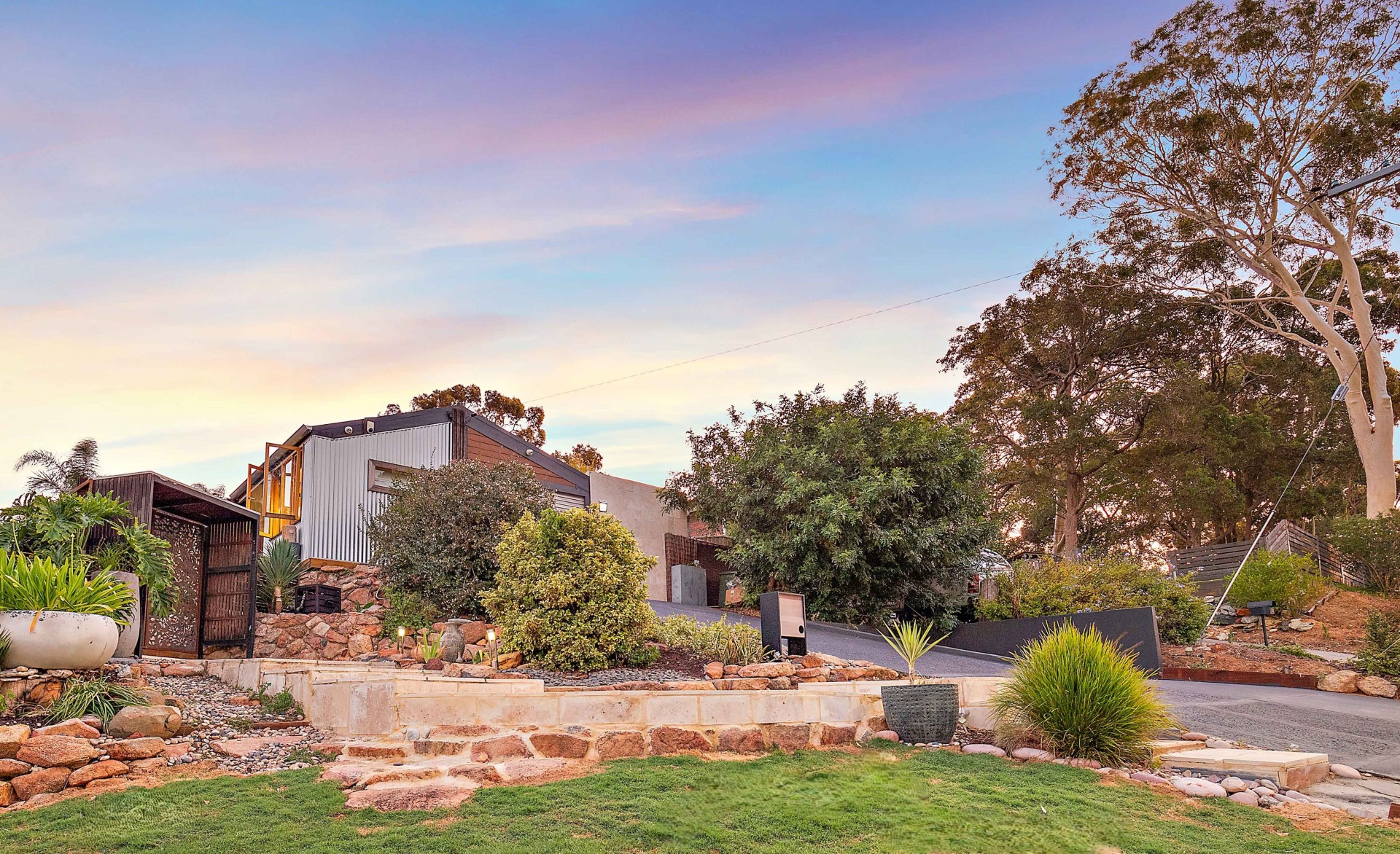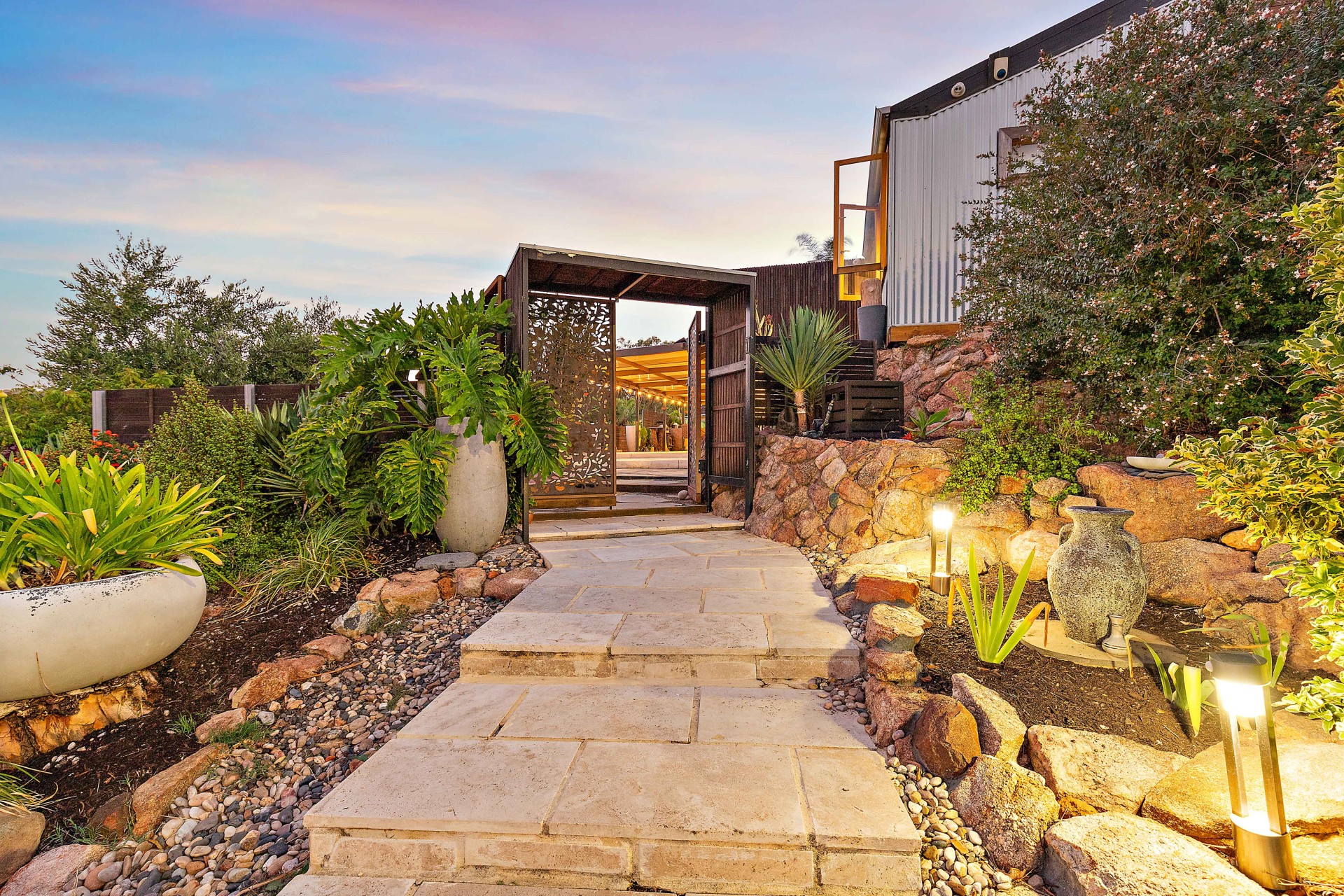 - Landscaped garden with succulents and water-wise plants.