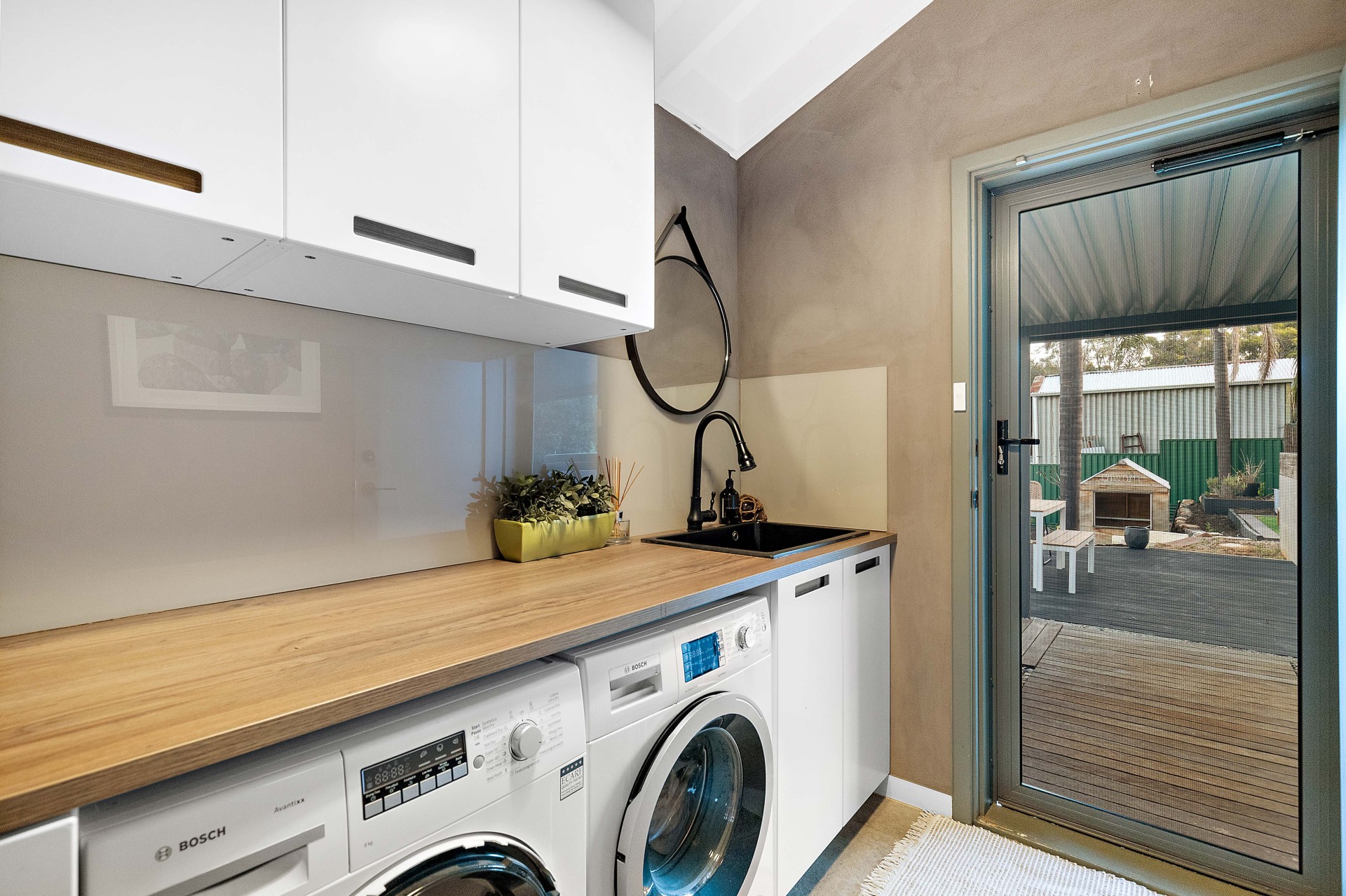 - Renovated Laundry with abundant storage, a frosted glass door feature to allow natural light to flow through, and a Invisi-guard security door.