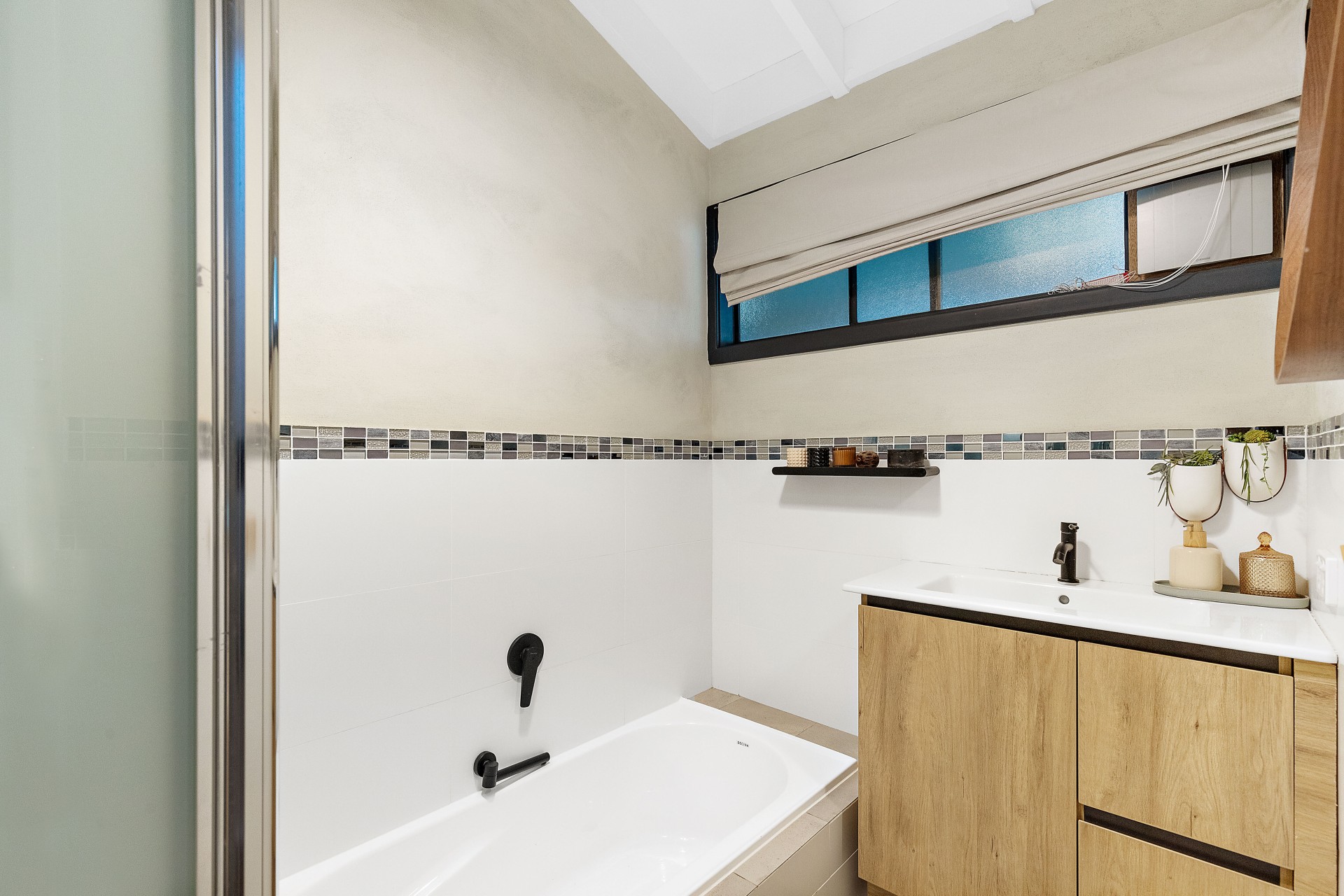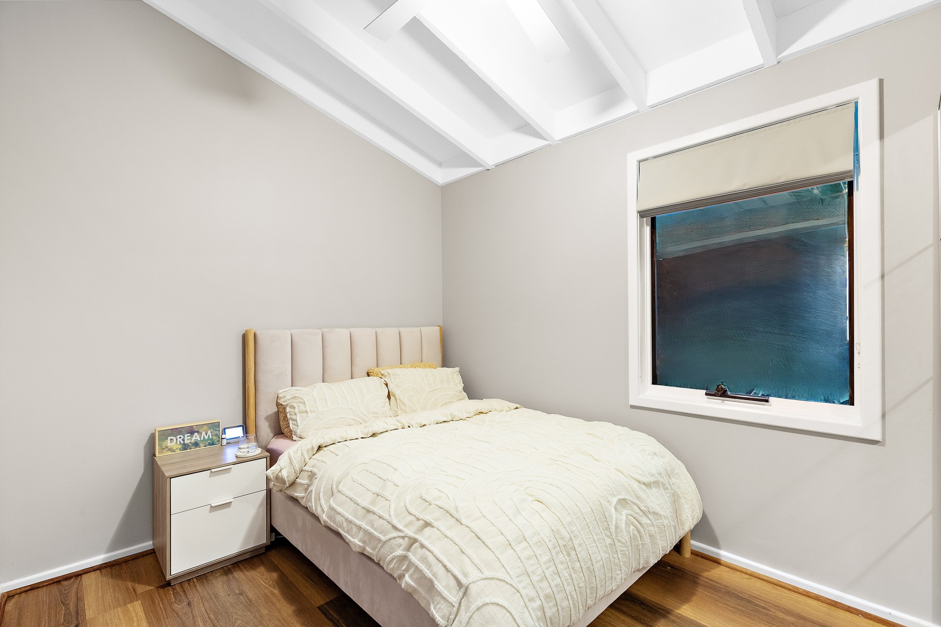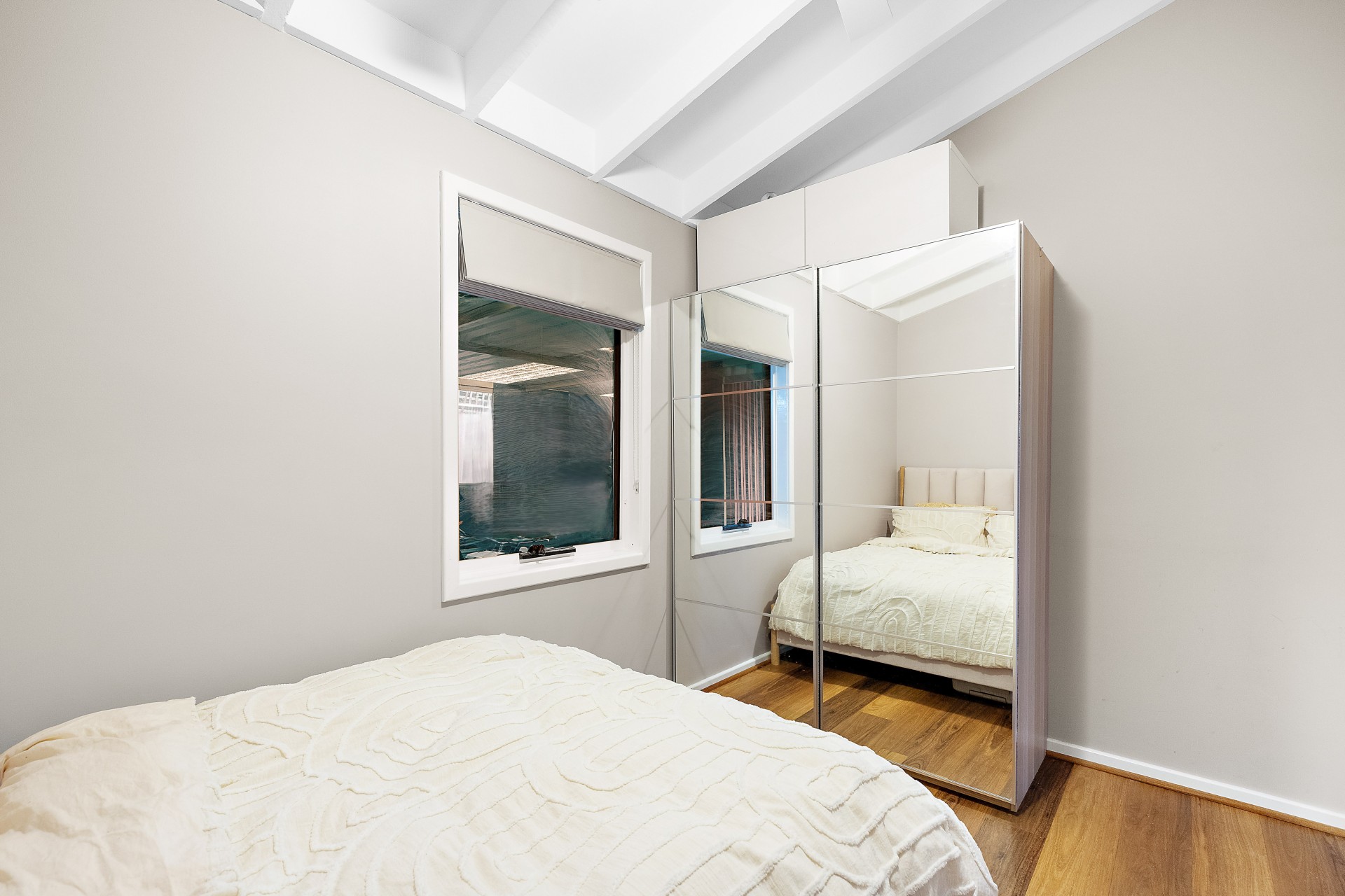 - Master bed prepared with a frosted glass door opening out to outdoor living space, and ideal for future ensuite additions.
