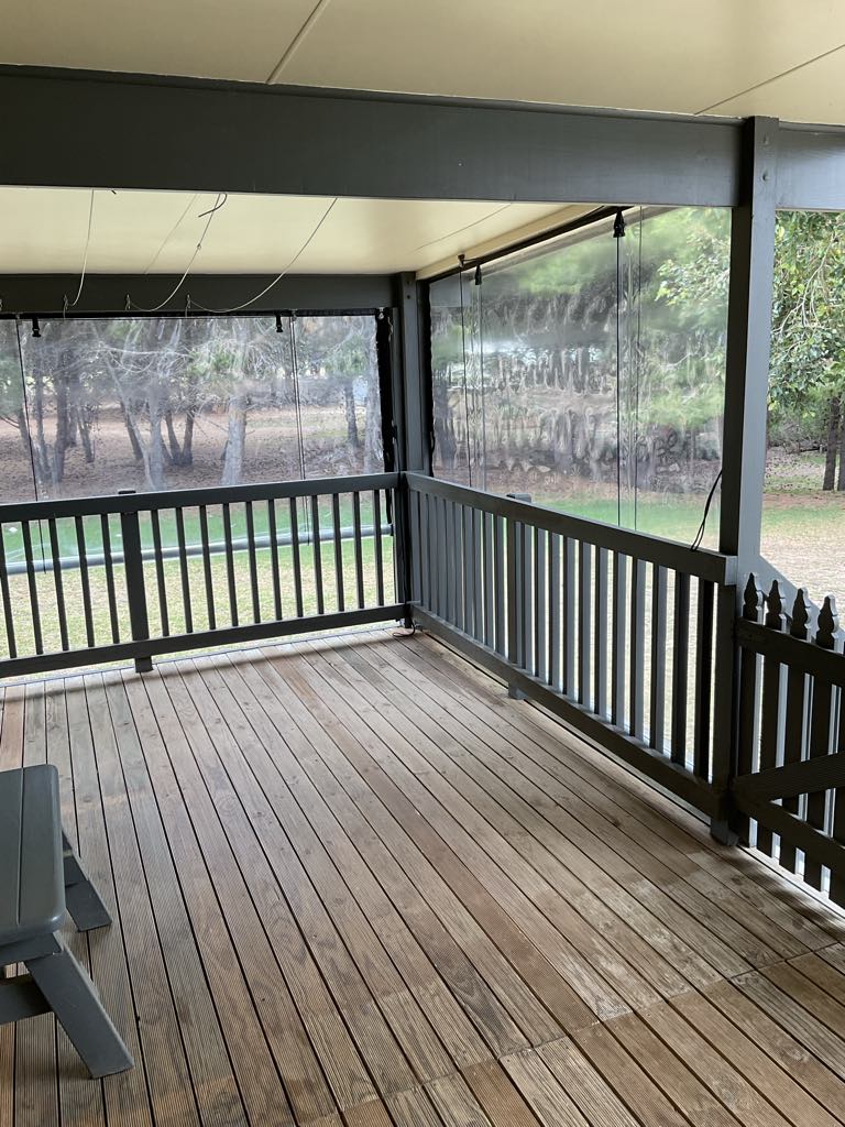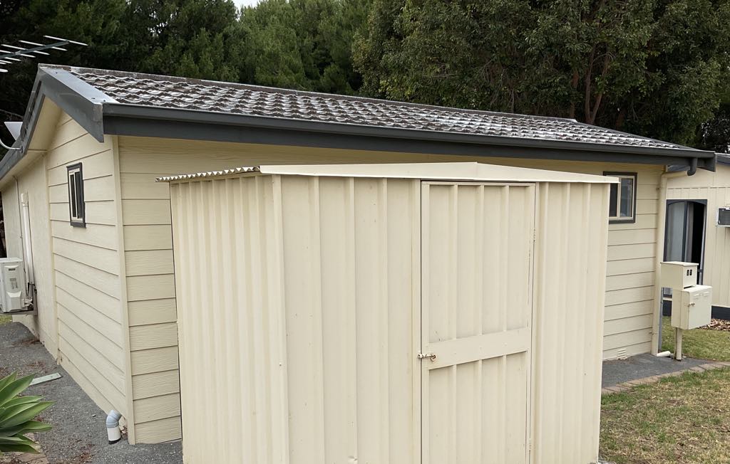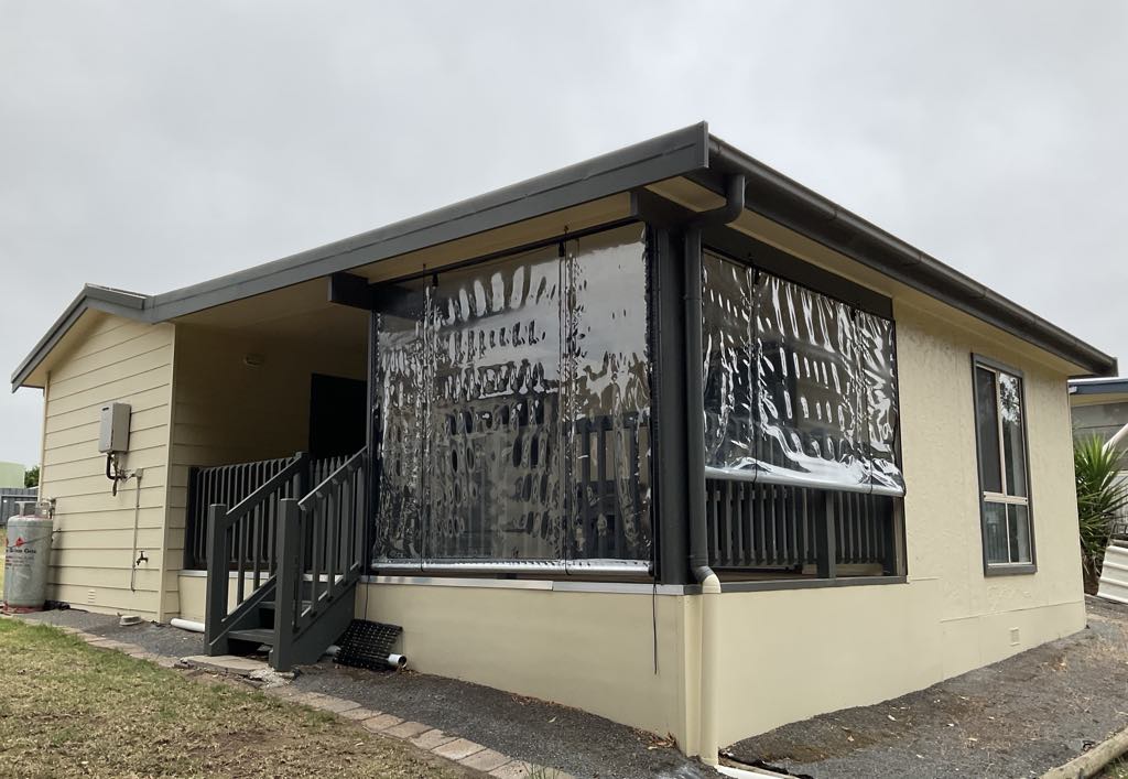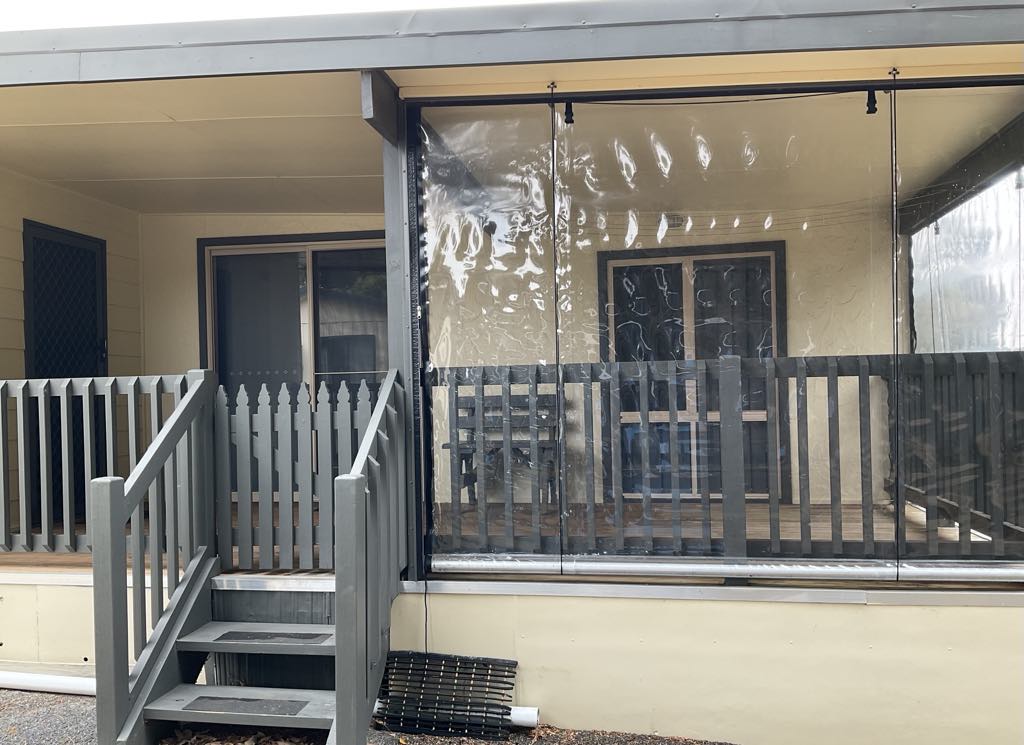 One large bedroom, separate lounge room, open plan kitchen/dining with walk-in pantry or storage space, wet area with huge shower, toilet and laundry, Daikin split system heating/cooling, an outside deck area under the main roof with roll-down clear blinds plus a handy garden shed with a paved floor.