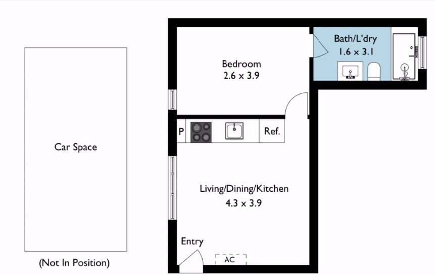 - Kitchen with gas cooktop (+ room for single fridge to right of kitchen bench)