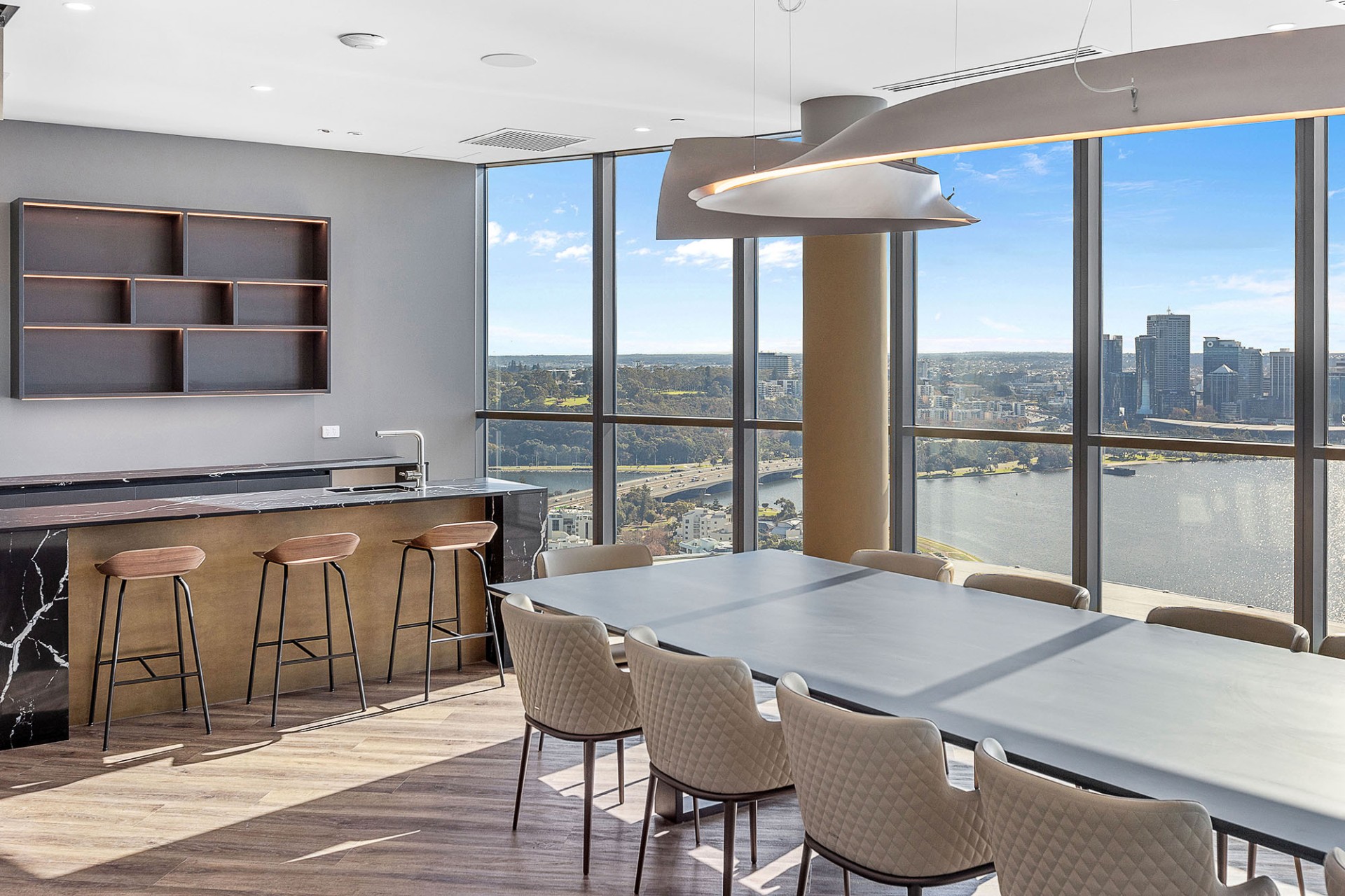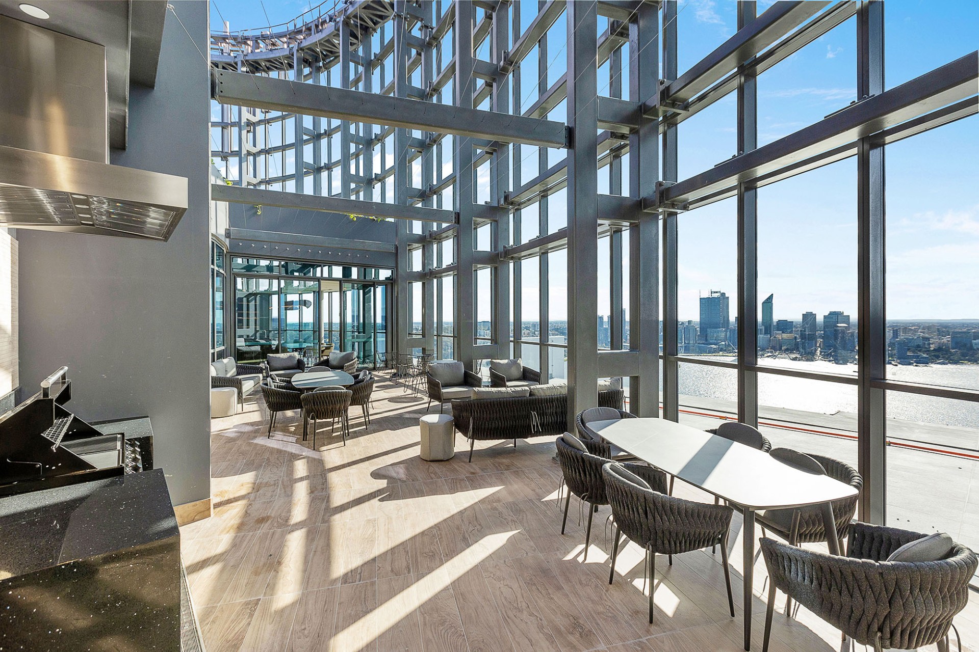 On level 37, sitting atop the Mill Point tower, is the South Perth Sky Deck, available for all residents to use featuring two private dining rooms with adjoining kitchens & roof terraces.
