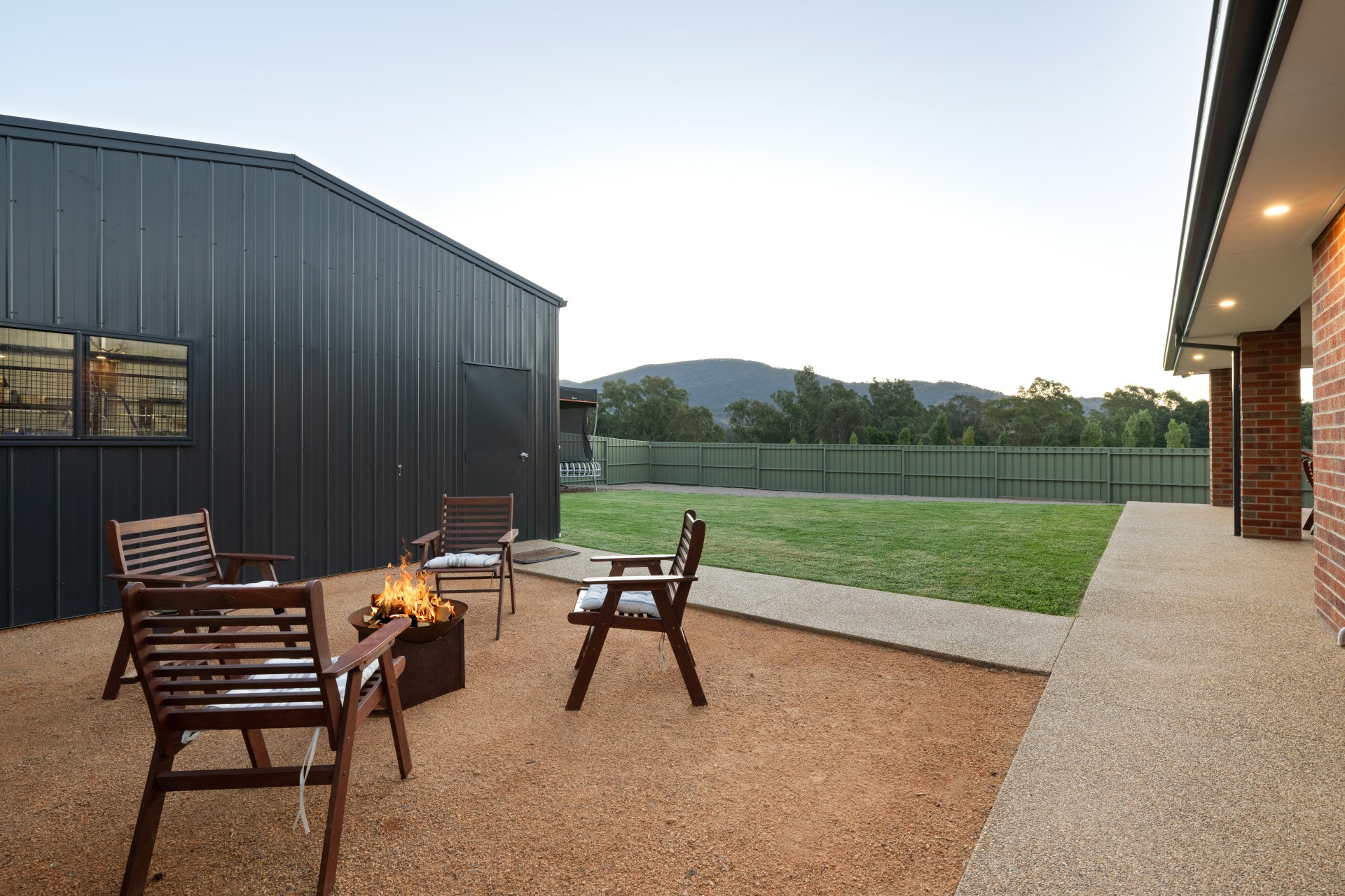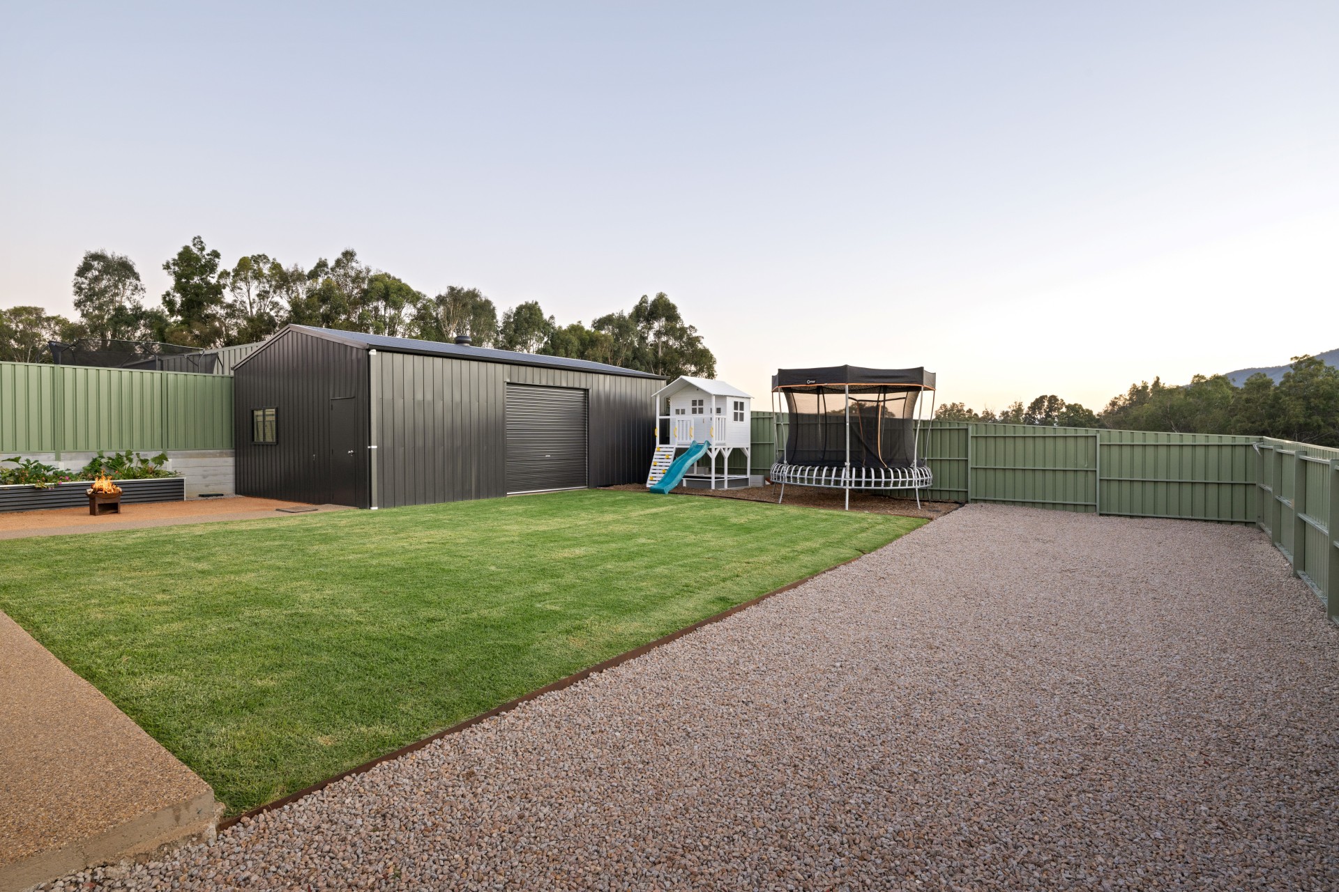 Step outside to discover fully landscaped grounds with an irrigation system, ensuring your outdoor spaces remain lush and vibrant. The exposed aggregate area is perfect for alfresco dining, while the dedicated kids' play area provides a secure, fun space for children to enjoy the outdoors. A 9x6m powered shed offers ample room for storage, hobbies, or a workshop, and the double gate side access makes it easy to store boats, trailers, or additional vehicles.