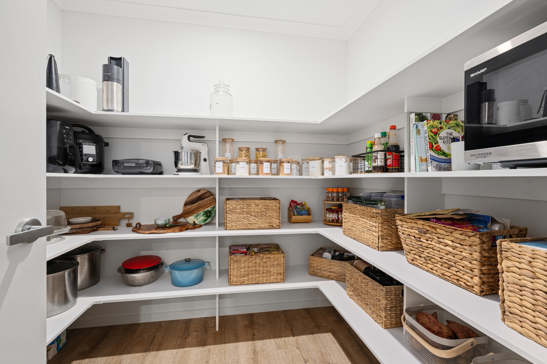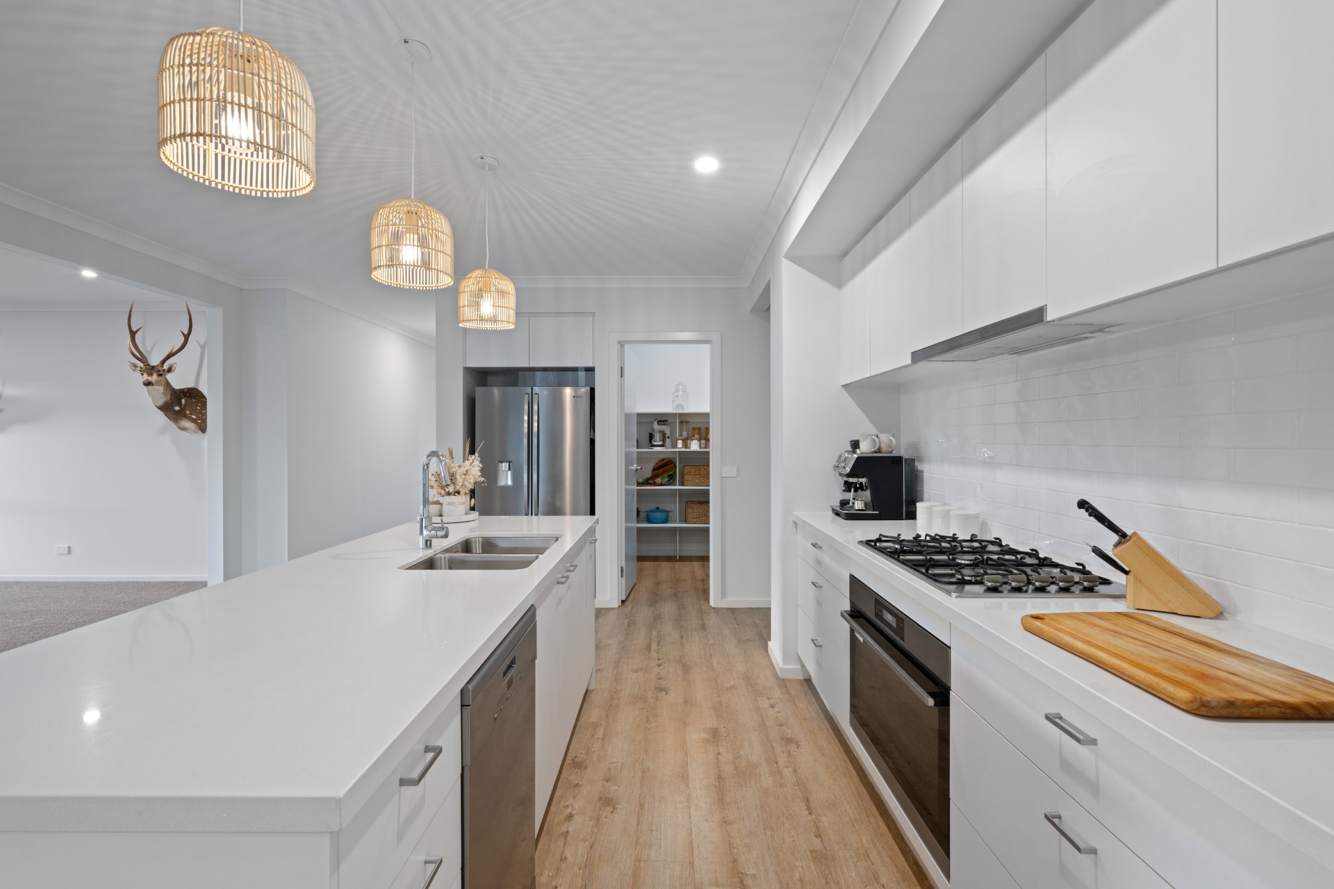 The heart of the home is the expansive open-plan living area, where the kitchen, dining, and lounge seamlessly come together to create an inviting and functional space for everyday living and entertaining. The gourmet kitchen features sleek Caesarstone benchtops, undermount sink, premium appliances, and a generous walk-in pantry, making it a dream for home chefs. The living and dining areas, with their abundant natural light, create a warm and welcoming atmosphere that flows effortlessly to the outdoor spaces.