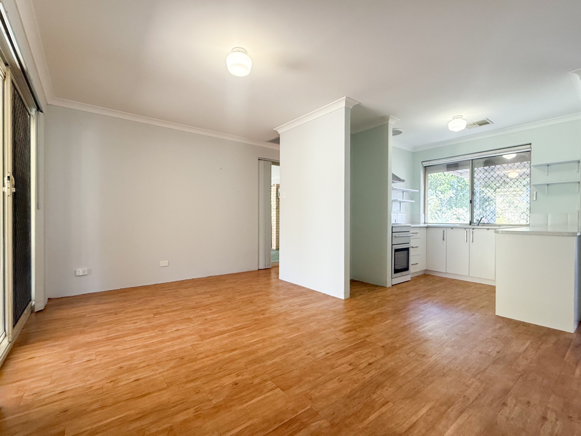 The kitchen flows into another living area, with plenty of room for a dining table.