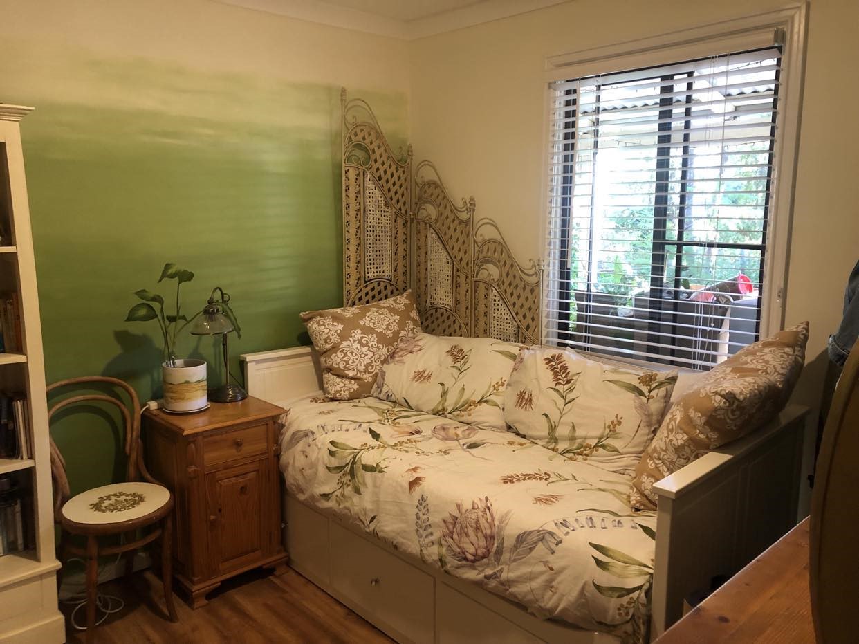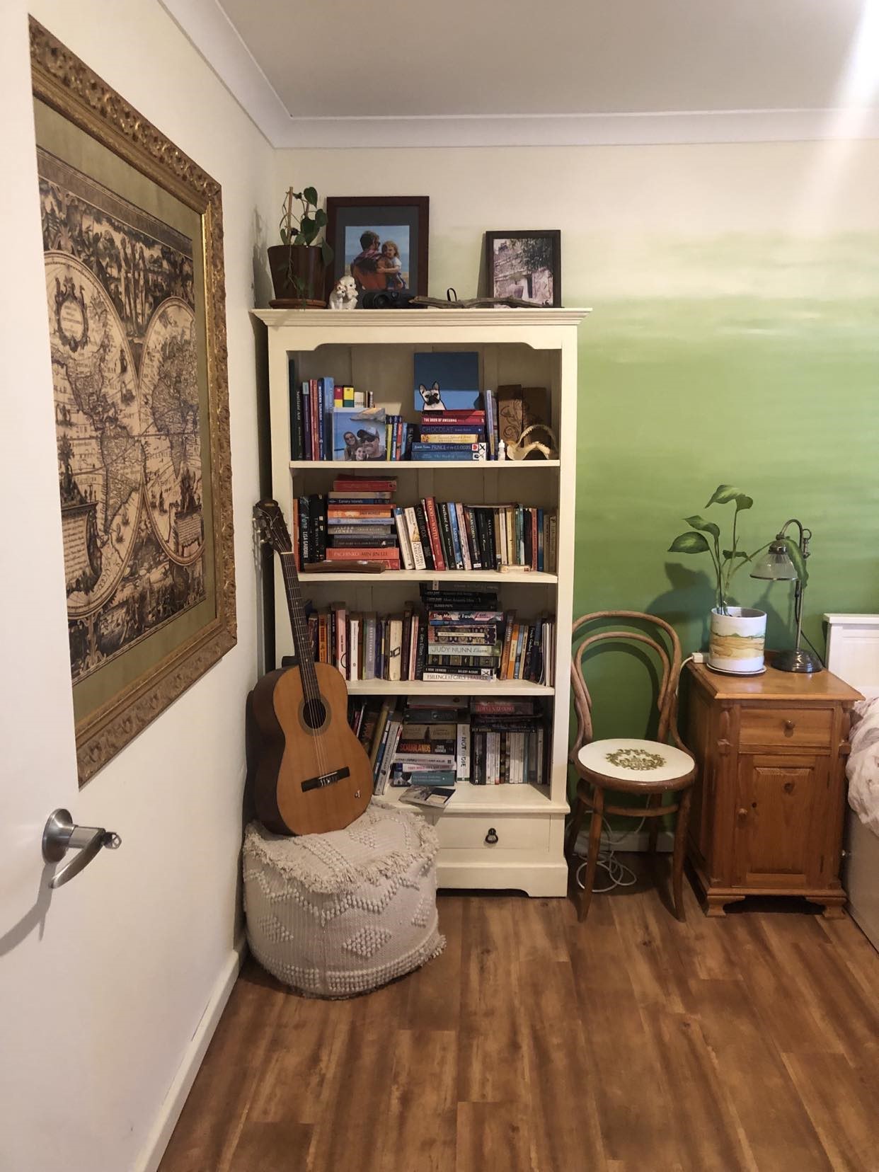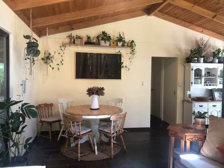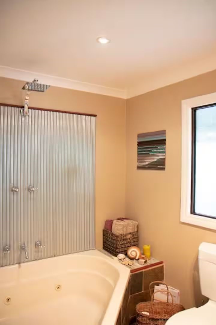 The bathroom, conveniently combined with the laundry, features a large corner spa bath and showcases a rural rustic aesthetic, complete with mini orb and pressed tin details, plus a striking jarrah raw-edged benchtop. This attention to detail carries through the home, from the bespoke built-in furniture to the high-quality tap fittings.