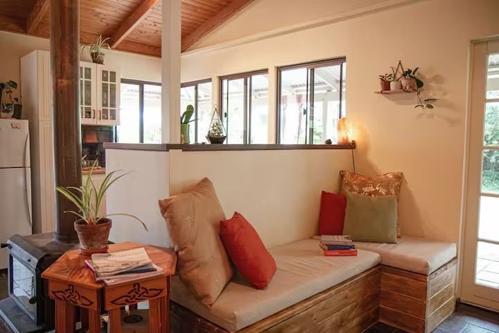 Step inside to discover raked ceilings in the open-plan kitchen, living, and dining area, creating an airy sense of space. Highlight windows frame the natural beauty outside, bringing the outdoors in. The home features durable slate flooring in the living and wet areas, complemented by easy-care vinyl in the bedrooms. Two of the three bedrooms are cleverly designed with built-in open storage, and all have stunning feature walls that add a touch of character.