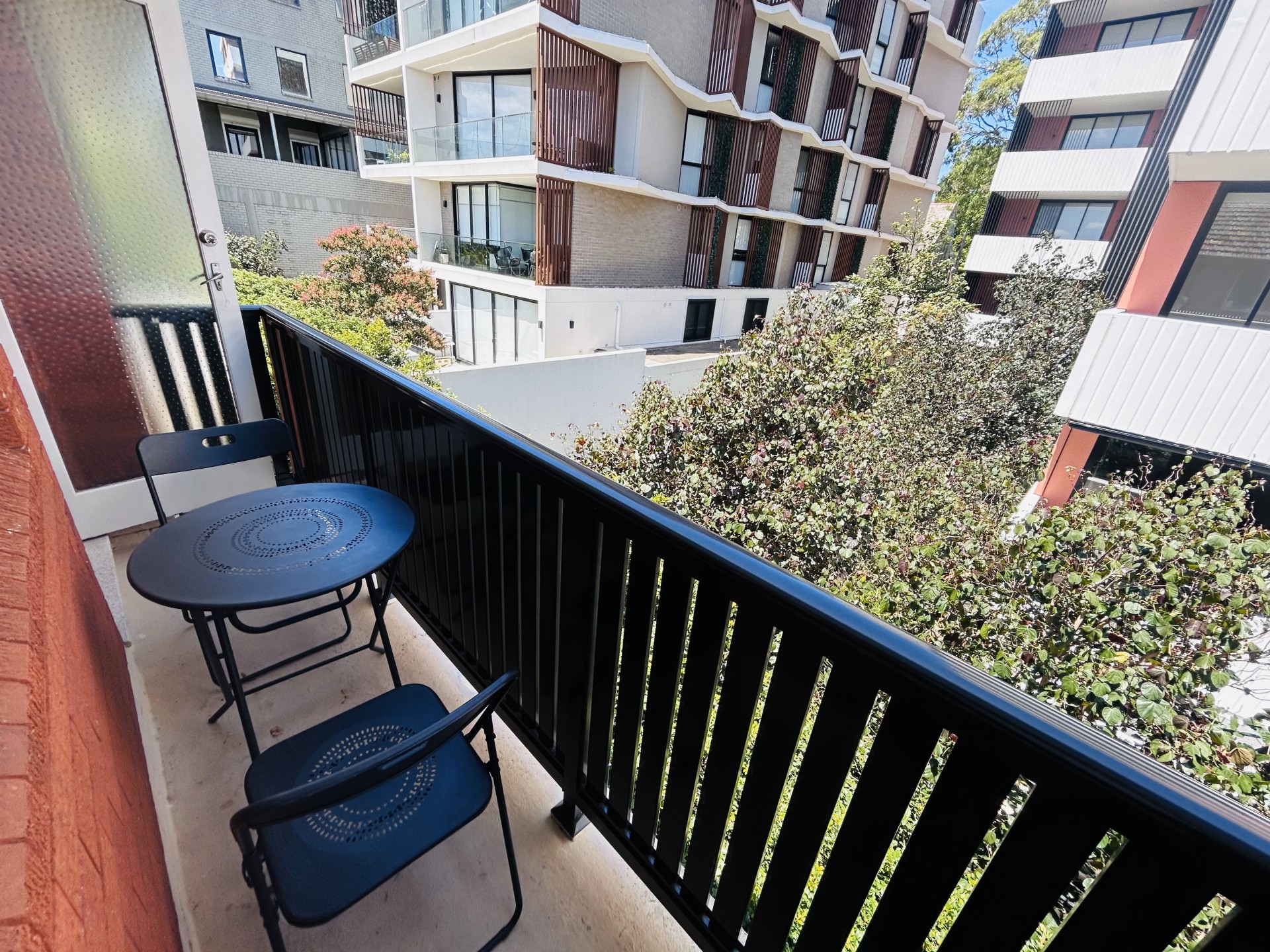 - Small peaceful balcony with leafy views.