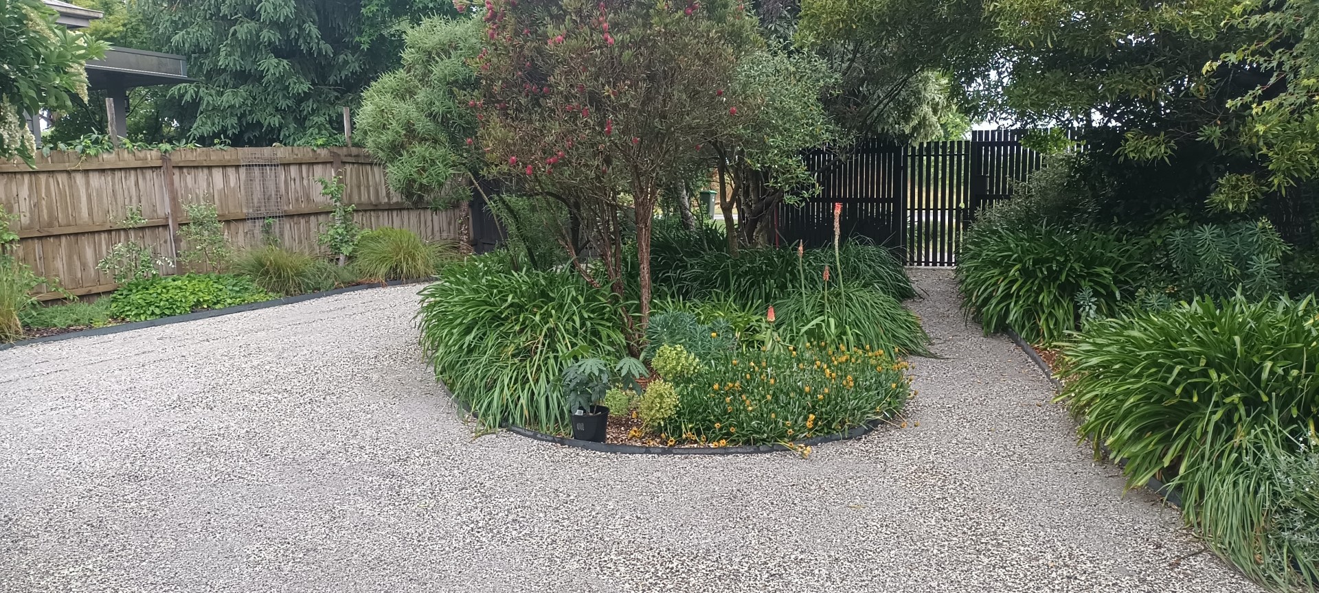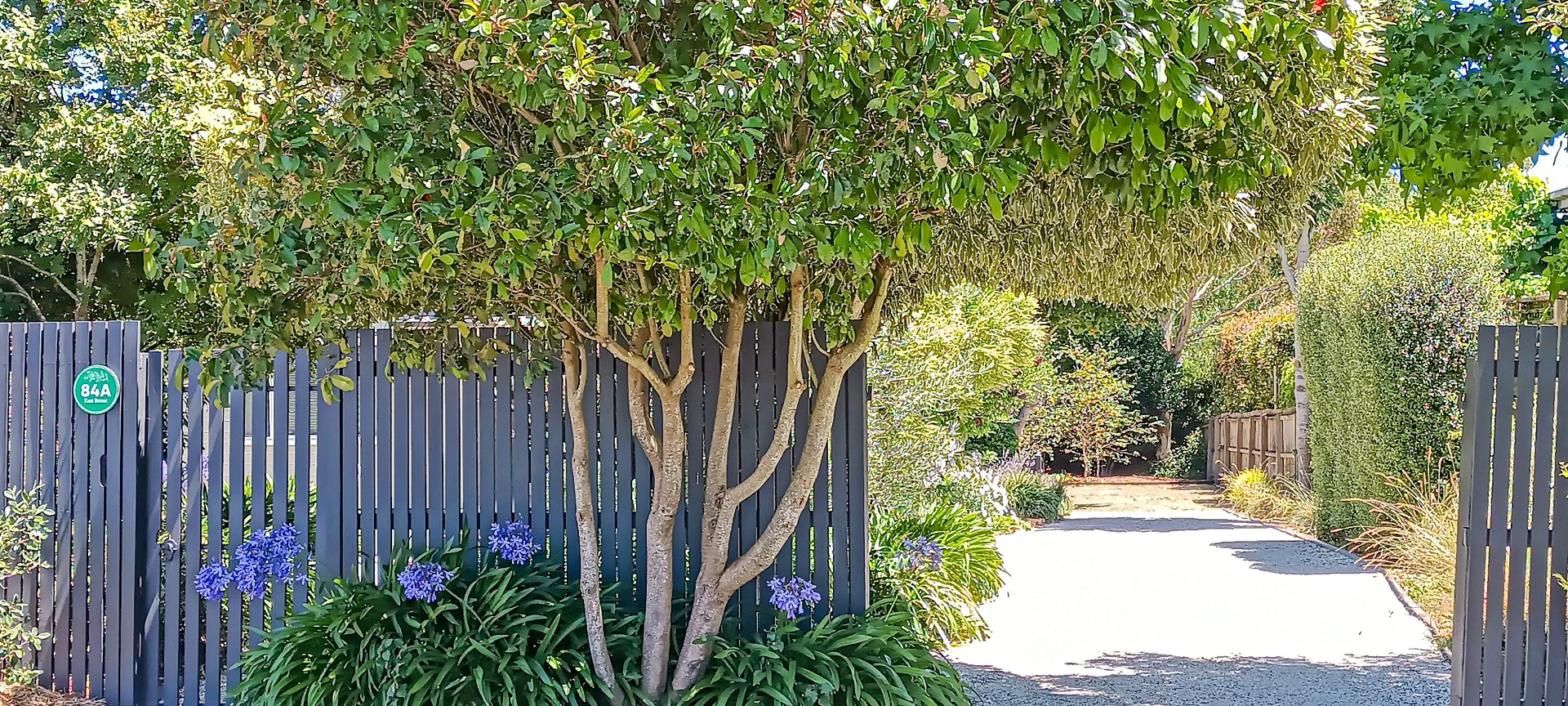 Entry is via a private, gravel driveway past a mature verge garden, including productive apple tree, to a landscaped front garden.