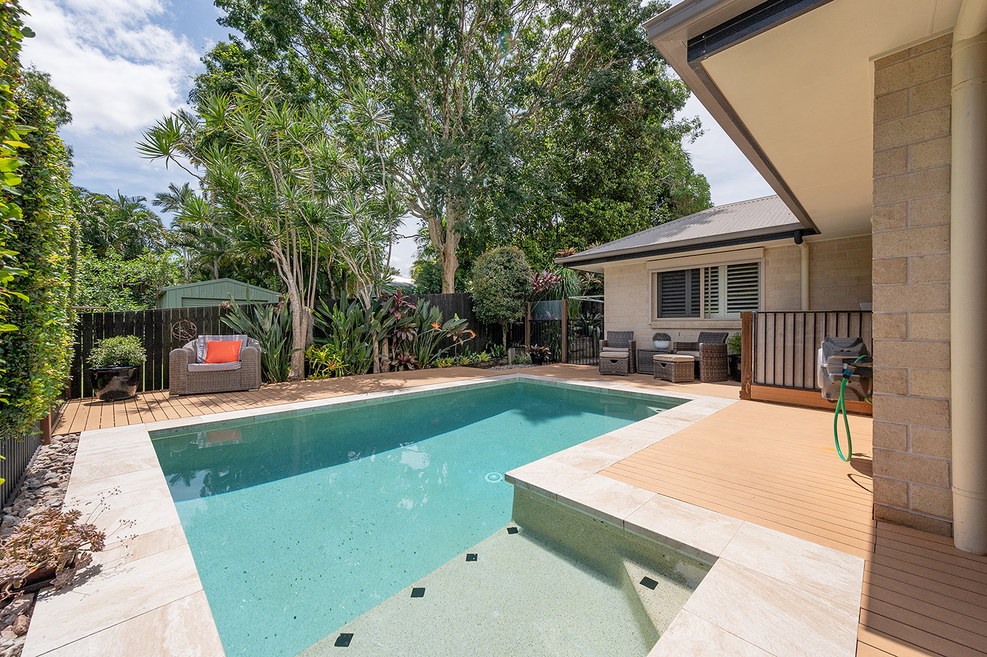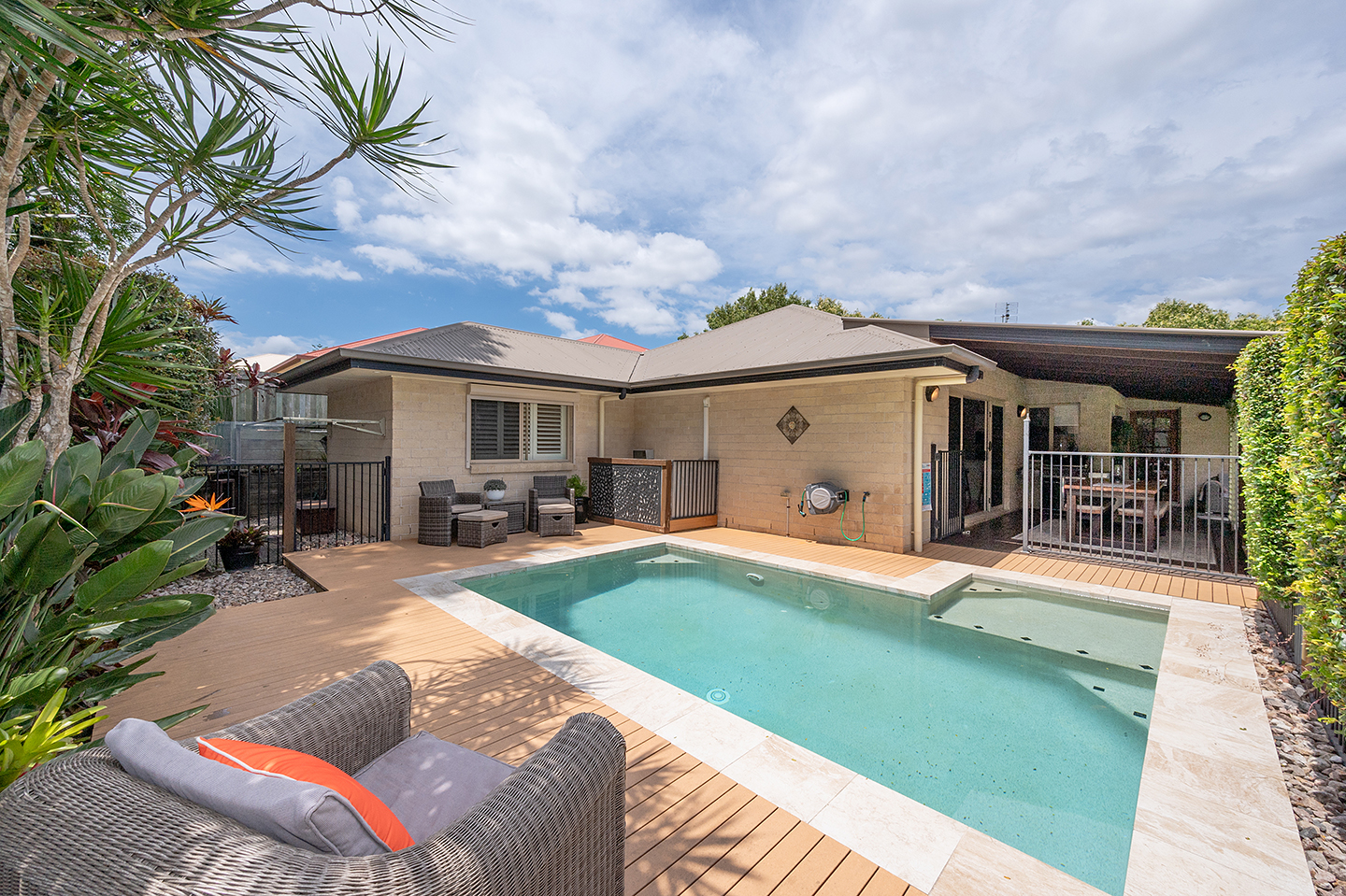 Outside, the home truly shines. The l-shaped back deck is designated into dining & lounging zones, with aluminum shutters making the area partially weatherproof & private. Or, alternatively, the shutters can be opened during the winter months for additional sunshine & light. This outdoor area provides the ideal setting for hosting BBQs or simply relaxing with family and friends whilst overlooking the in-ground plunge pool. The home's position ensures natural light throughout the day, making it a perfect spot to enjoy the outdoors year-round.