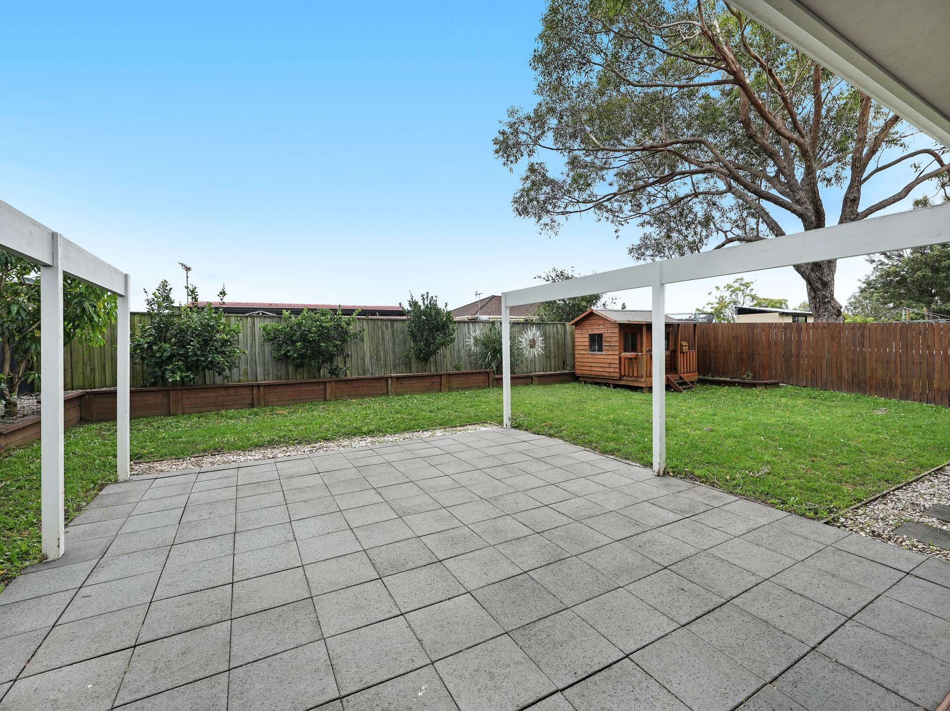 Fully fenced, child- and pet-friendly backyard with paved patio, fruit trees, and cubby house