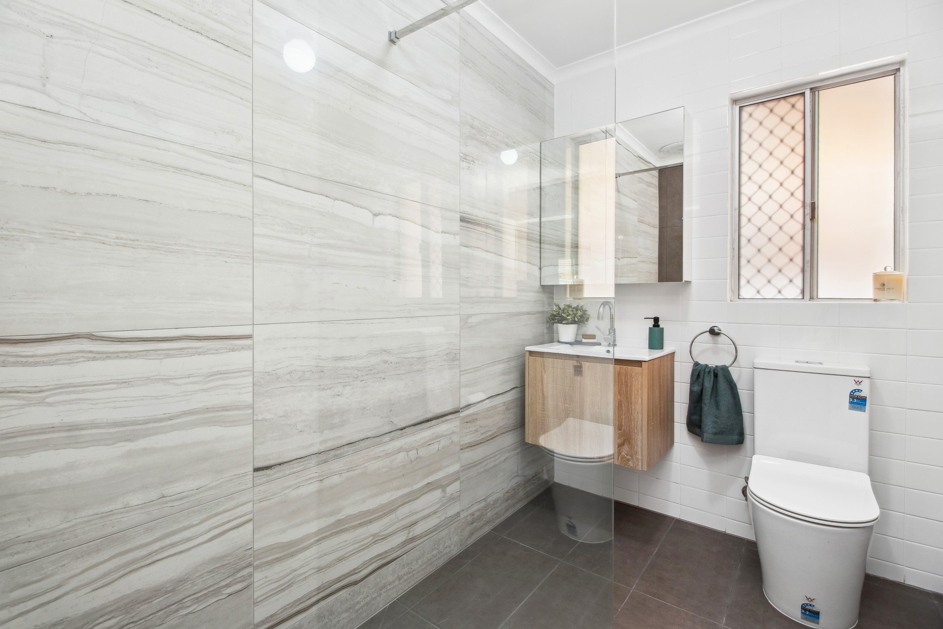 Bathroom: A brand-new, elegantly designed bathroom equipped with walk in shower and modern fixtures and finishes.