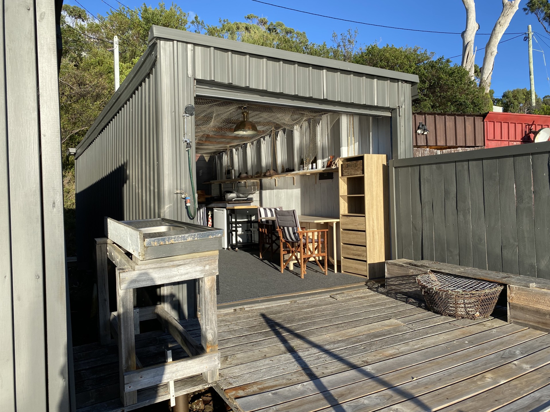 Boat Shed is fully furnished including, kitchen bench and sink, water pump, refrigerator, comfortable lounge (can be converted to a bed), extending table and chairs, cooking gear and devices and a fish cleaning sink on the deck plus an outdoor shower. Features include front and rear decks, connection to the power grid, 1400 litre rainwater tank, a new roof, new roller door, freshly painted inside and out and all appliances and furniture are brand new, never used