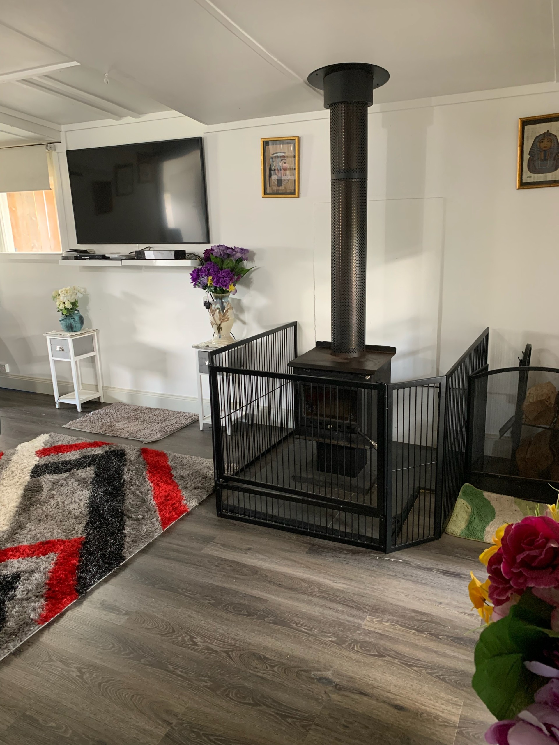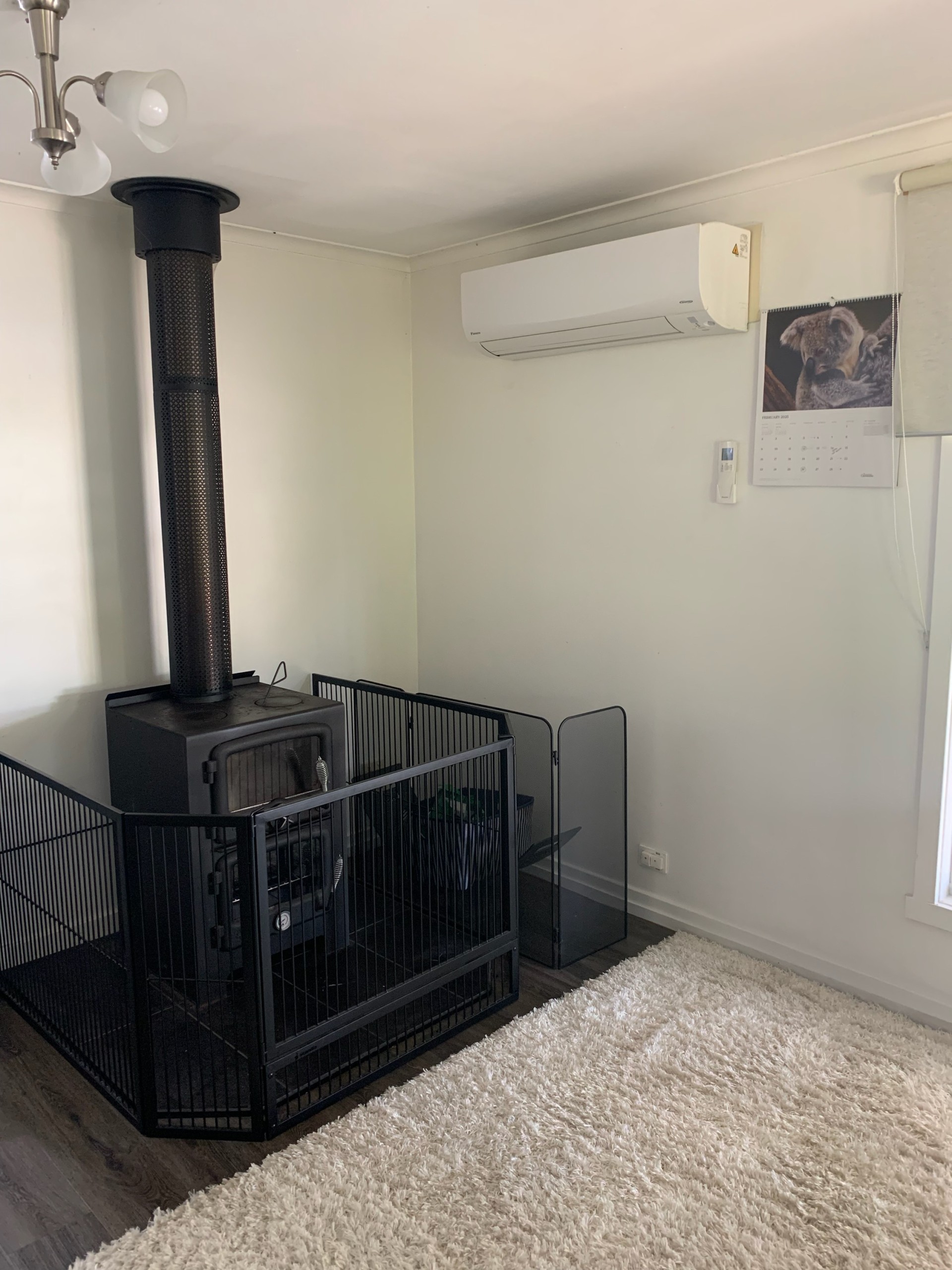Dining room is located at the front of the home fitted with large picture windows and new flywire screen to the front door. A dual-purpose wood heater allows both cooktop cooking and temperature-controlled oven options along with wood heating for the cool winter months. In addition, there is a reverse cycle Daikin heat pump.