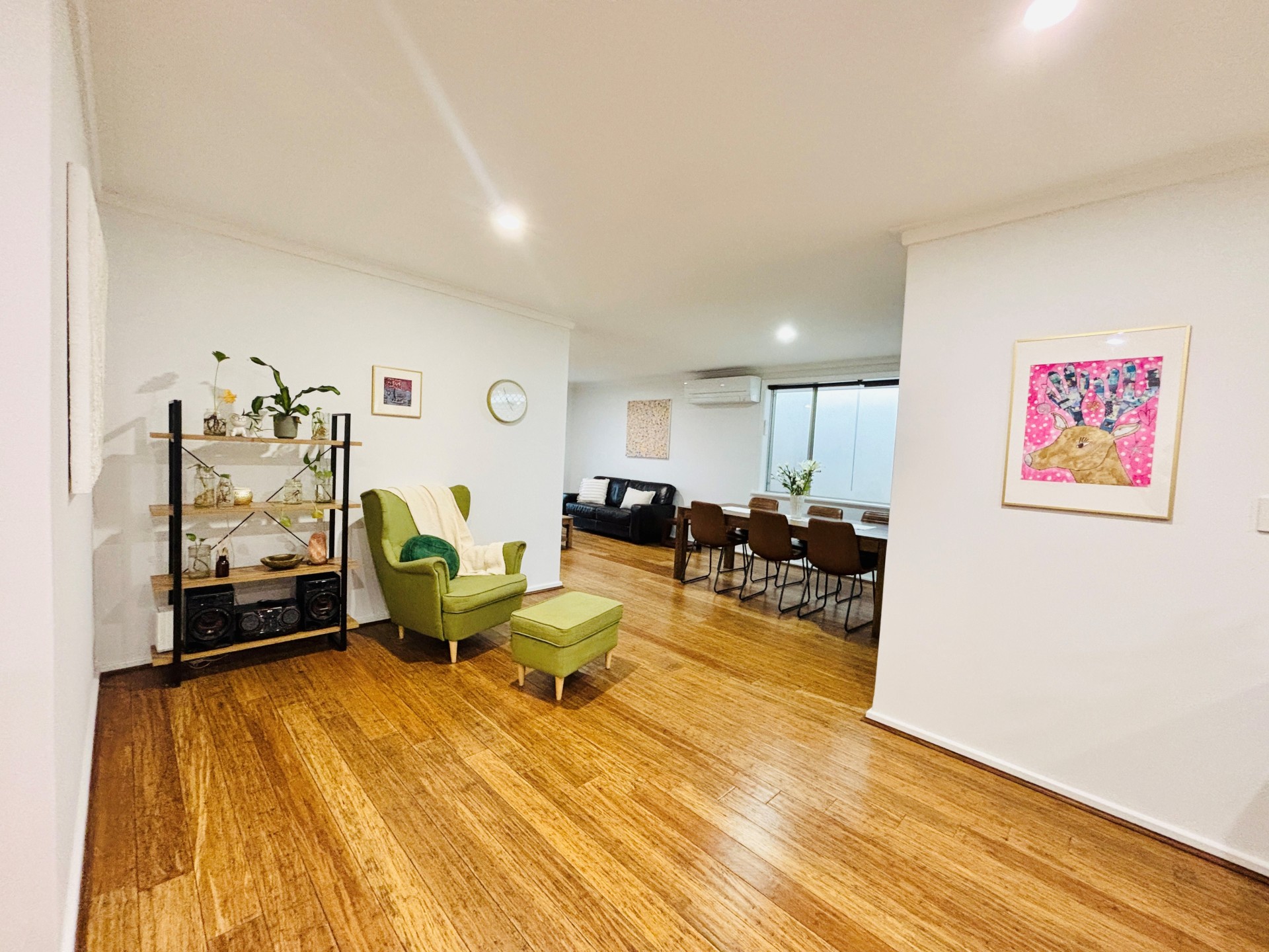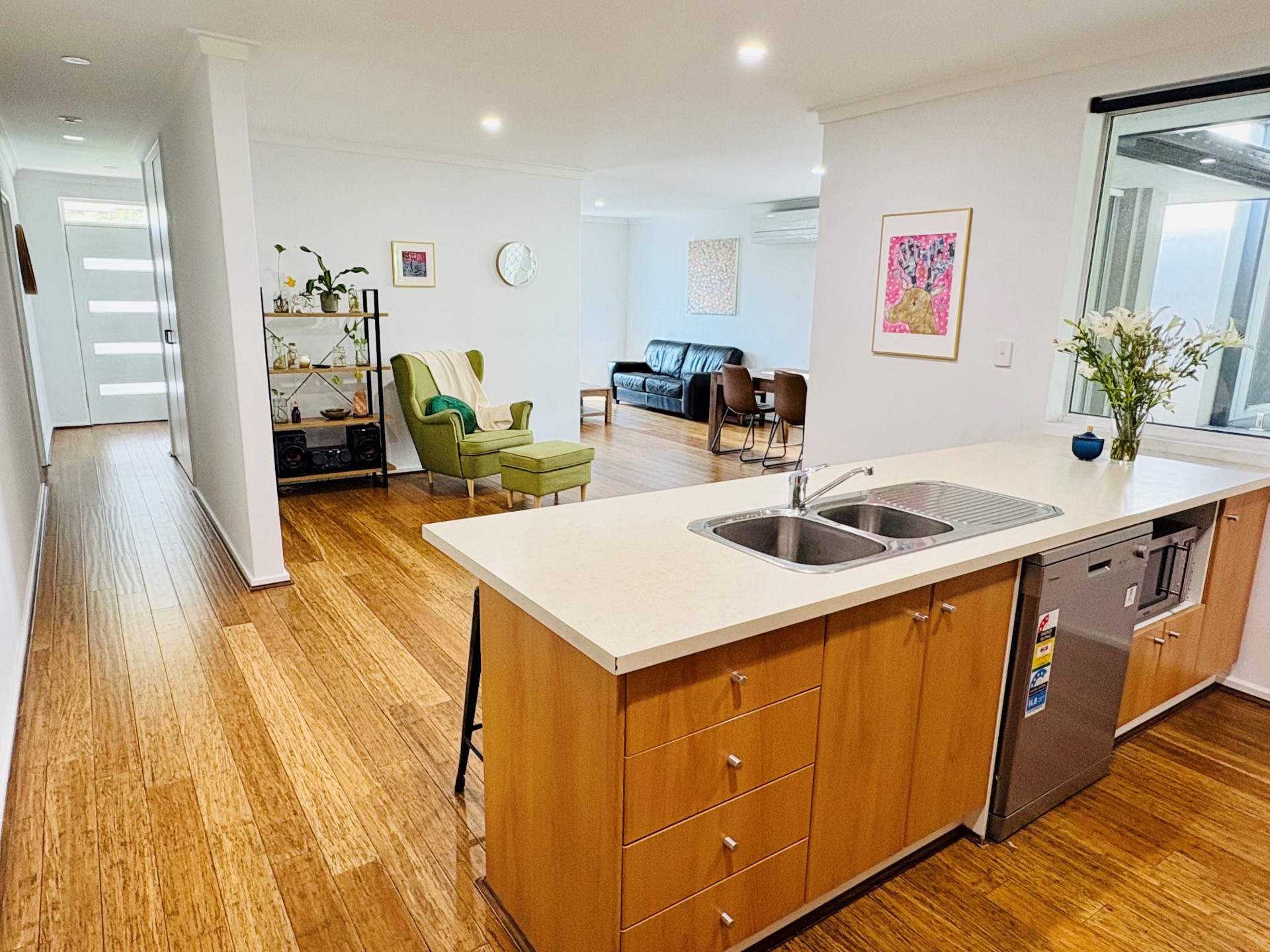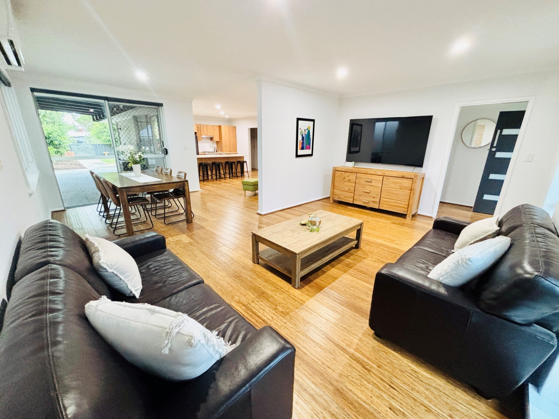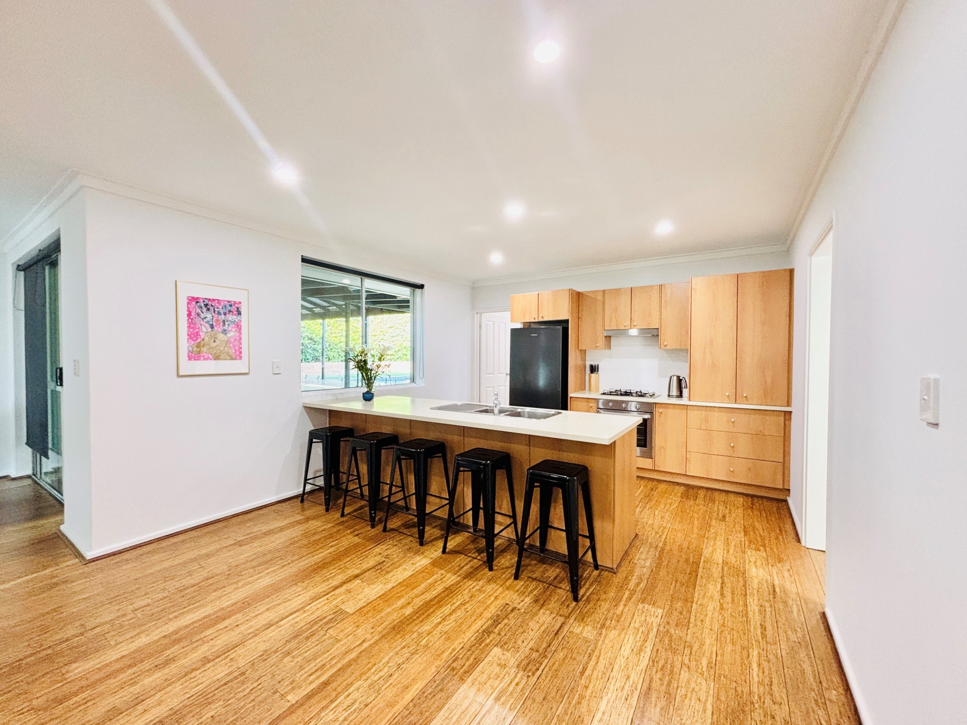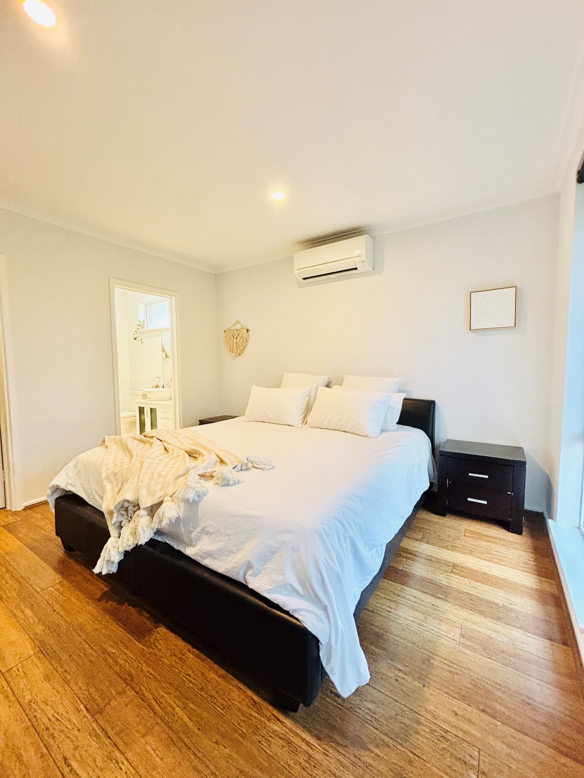 Inside the house has solid bamboo flooring throughout and is cooled by 4x split system air conditioners. The master bedroom has a walk-in robe and ensuite with a heated towel rack. The bathrooms are light and bright. The kitchen is equipped with a gas cooktop and breakfast bar. The renovated laundry features plenty of overhead cupboards for storage.