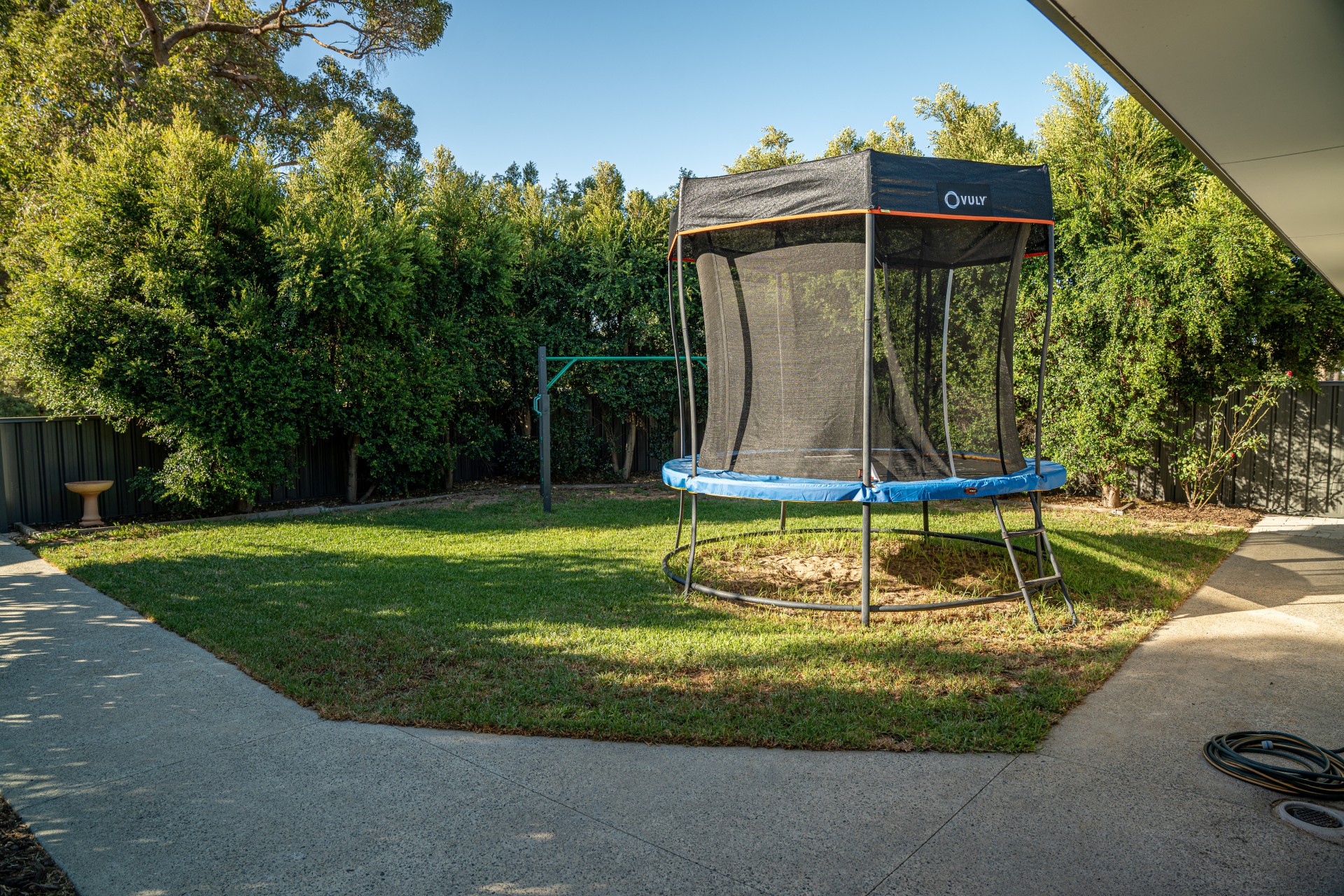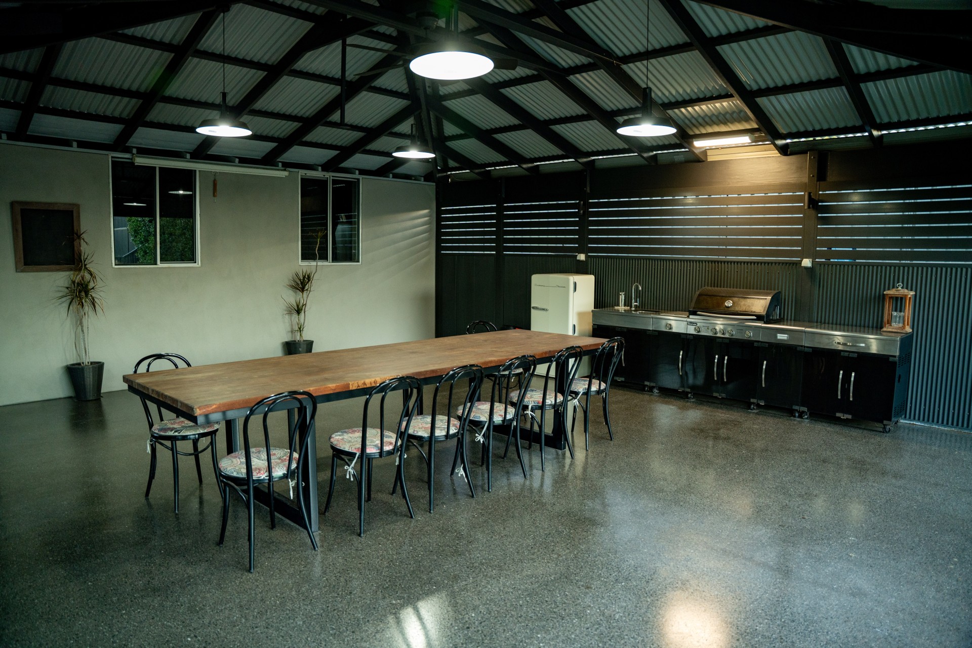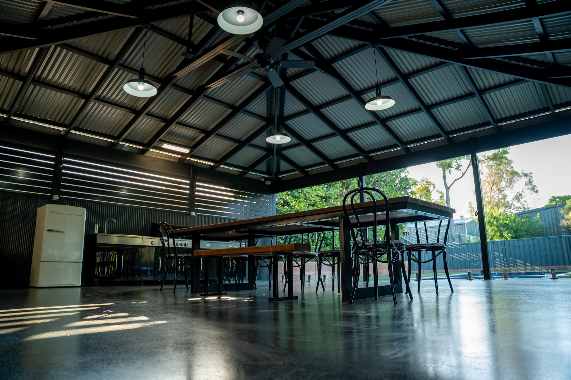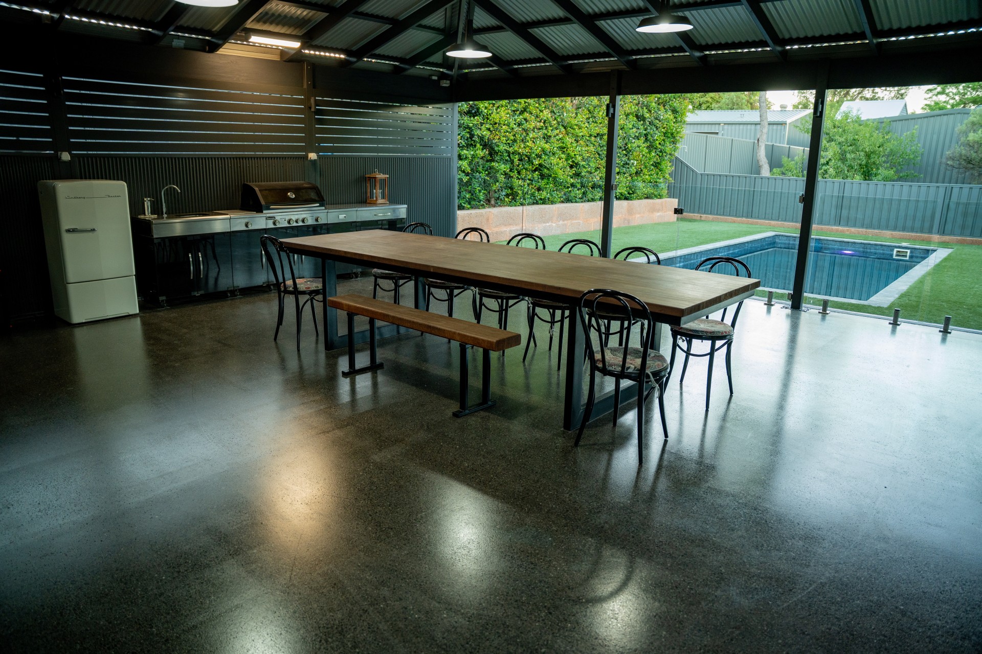 - Split level custom built timber patio that sprawls 110sqm. Comes equipped with an outdoor bbq kitchen, ceiling fan and features a combination of black honed concrete and grey washed aggregate concrete.