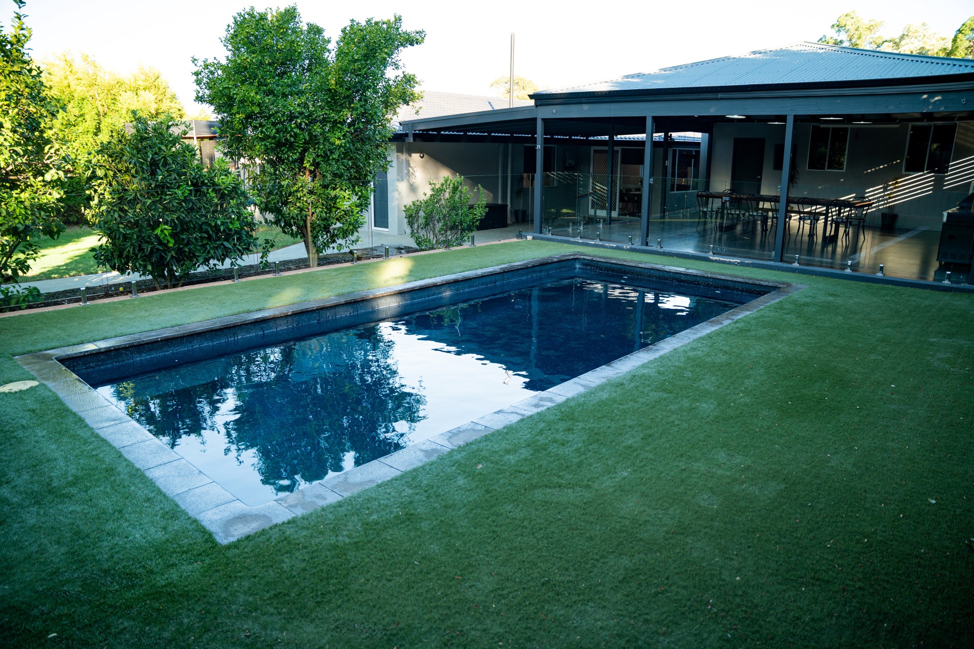 - The 8m x 3.6m Freedom pool has an Astral filtration system and variable speed pump. It is surrounded by artificial grass (concrete underneath) and has the convenience of an outdoor shower. A putting green is located behind the patio in the pool area for the golfers.