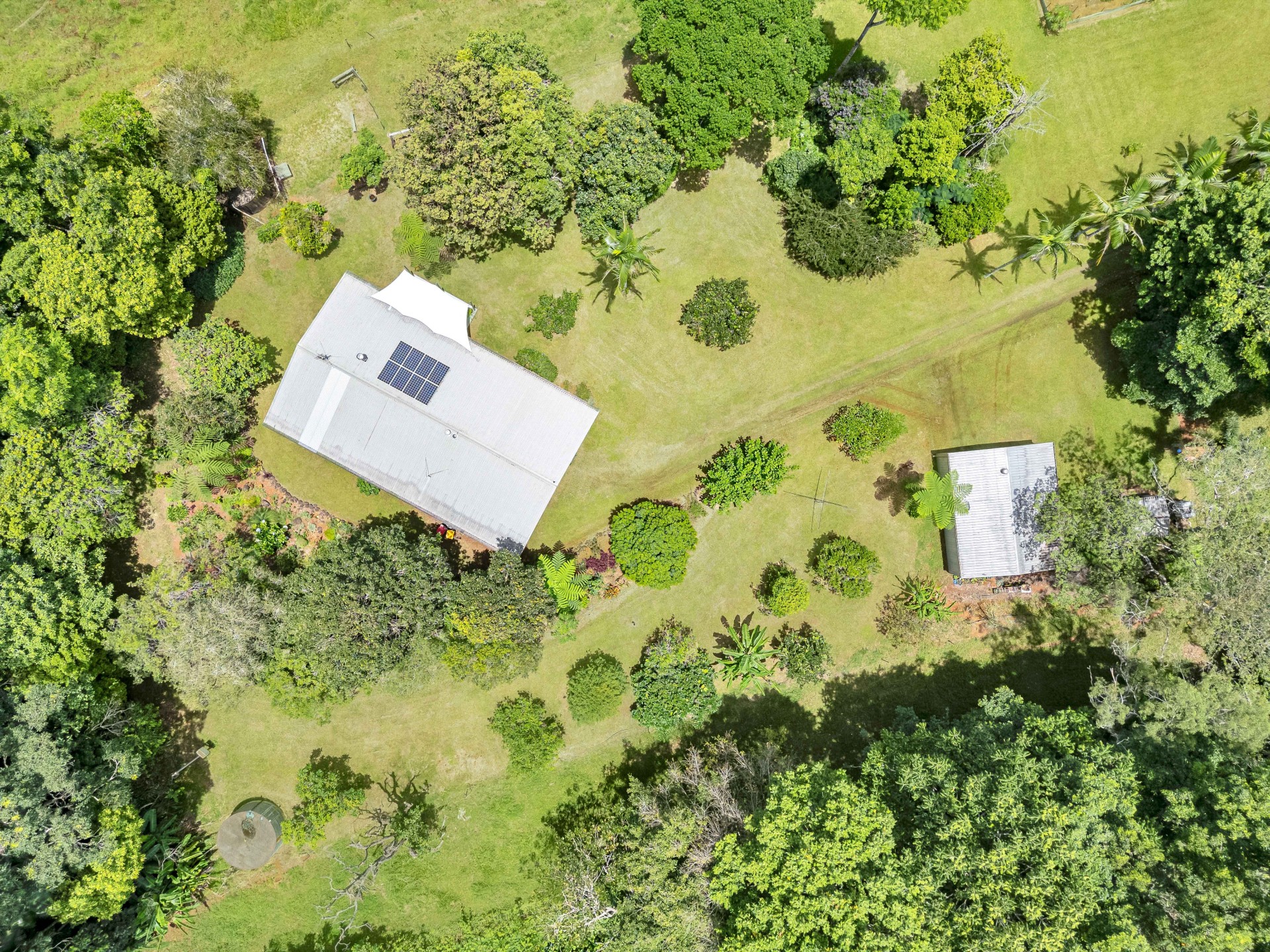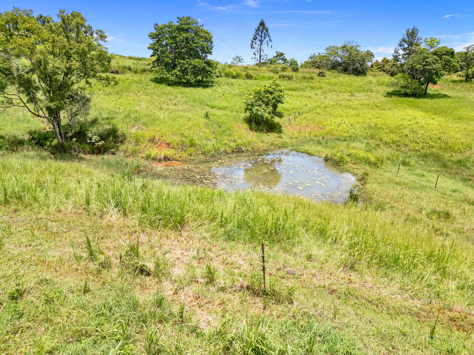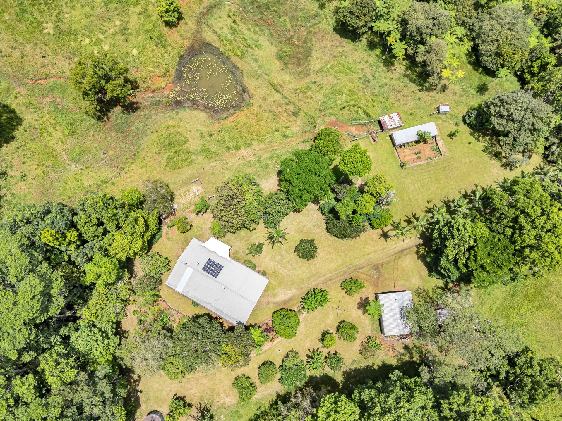 This property is ideal for those seeking space, privacy, and a self-sufficient lifestyle, featuring rich red soil and a spring-fed dam. A variety of citrus, tropical fruit trees and established gardens surround the home.