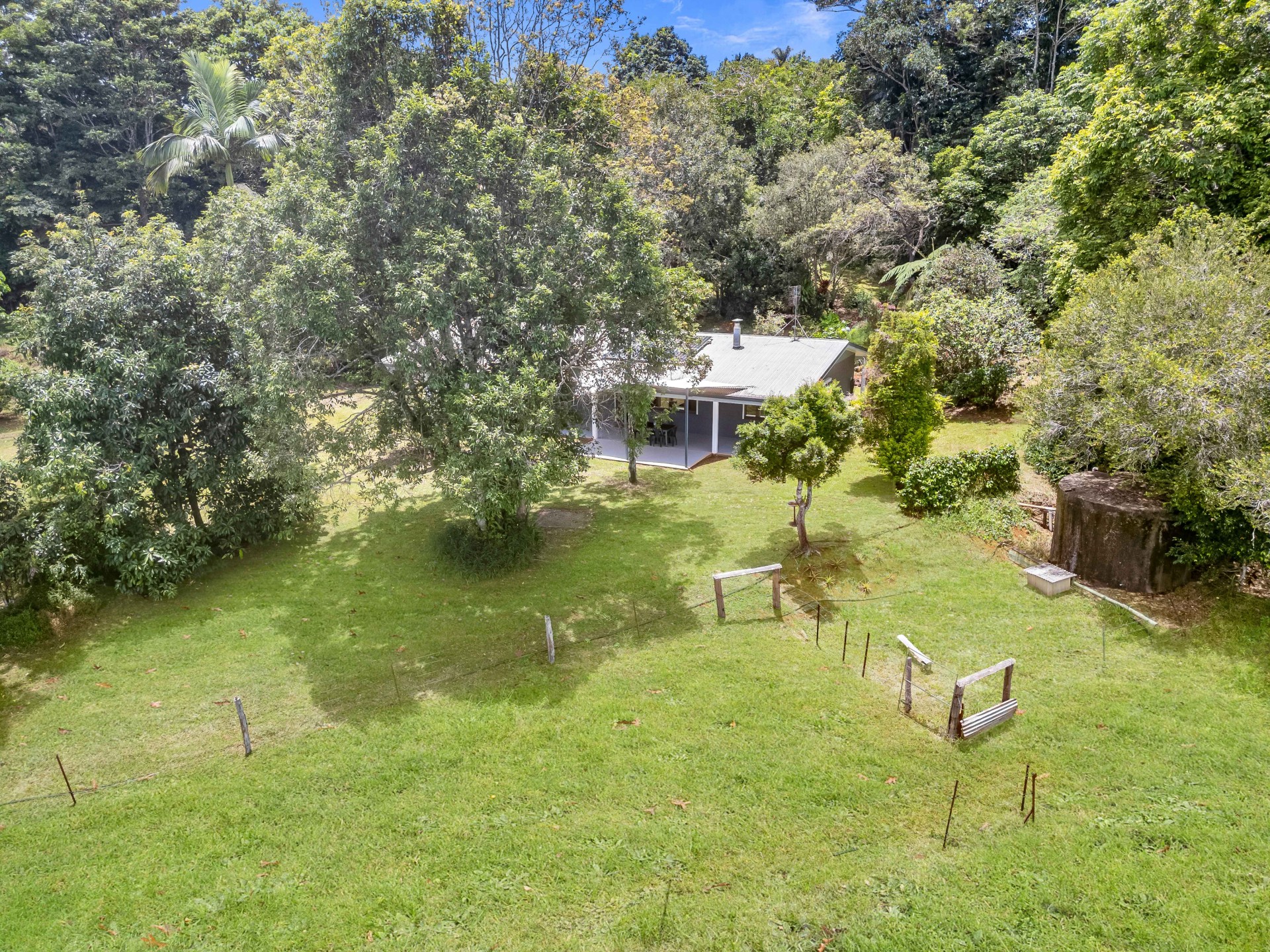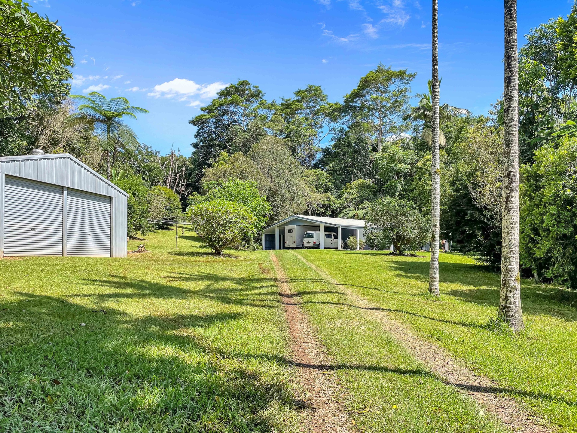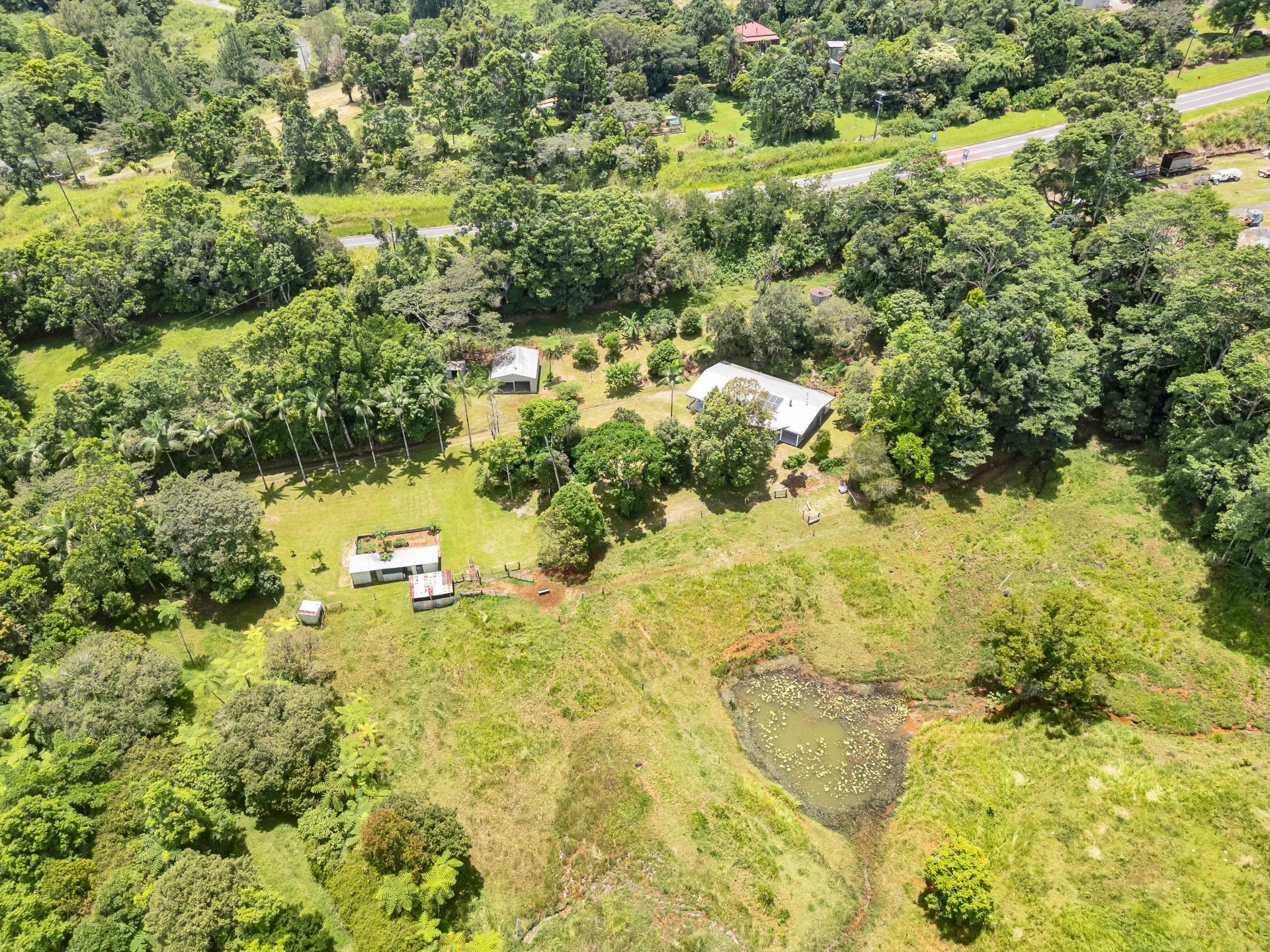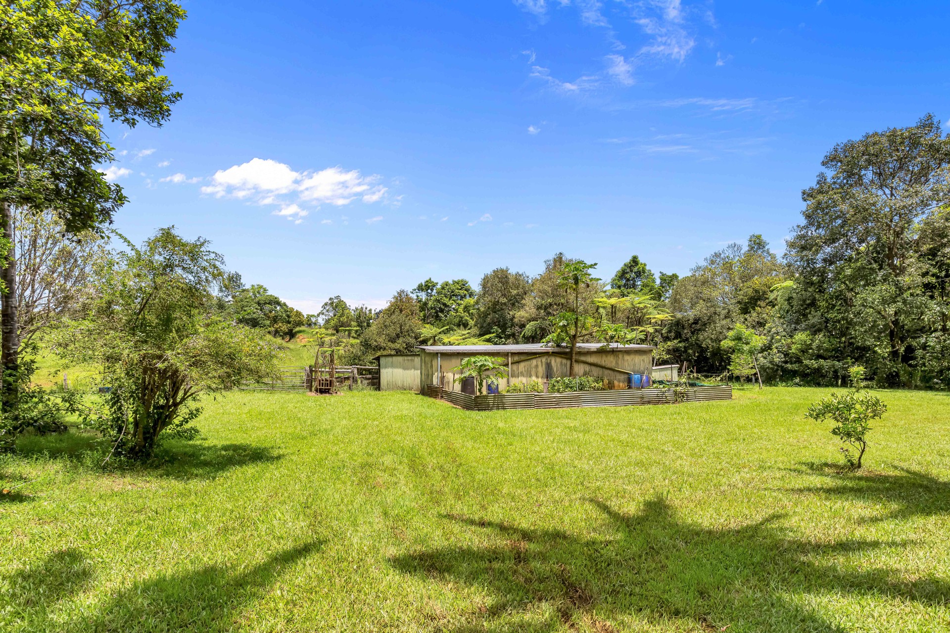 The property spans 3.09 hectares (7.5 acres) of undulating, well-drained land, featuring grazing areas and natural rainforest. The land is fenced into four paddocks and lanes with modest useable cattle yards and loading ramp. Adjacent are storage sheds, a chicken pen, and a vegetable plot.