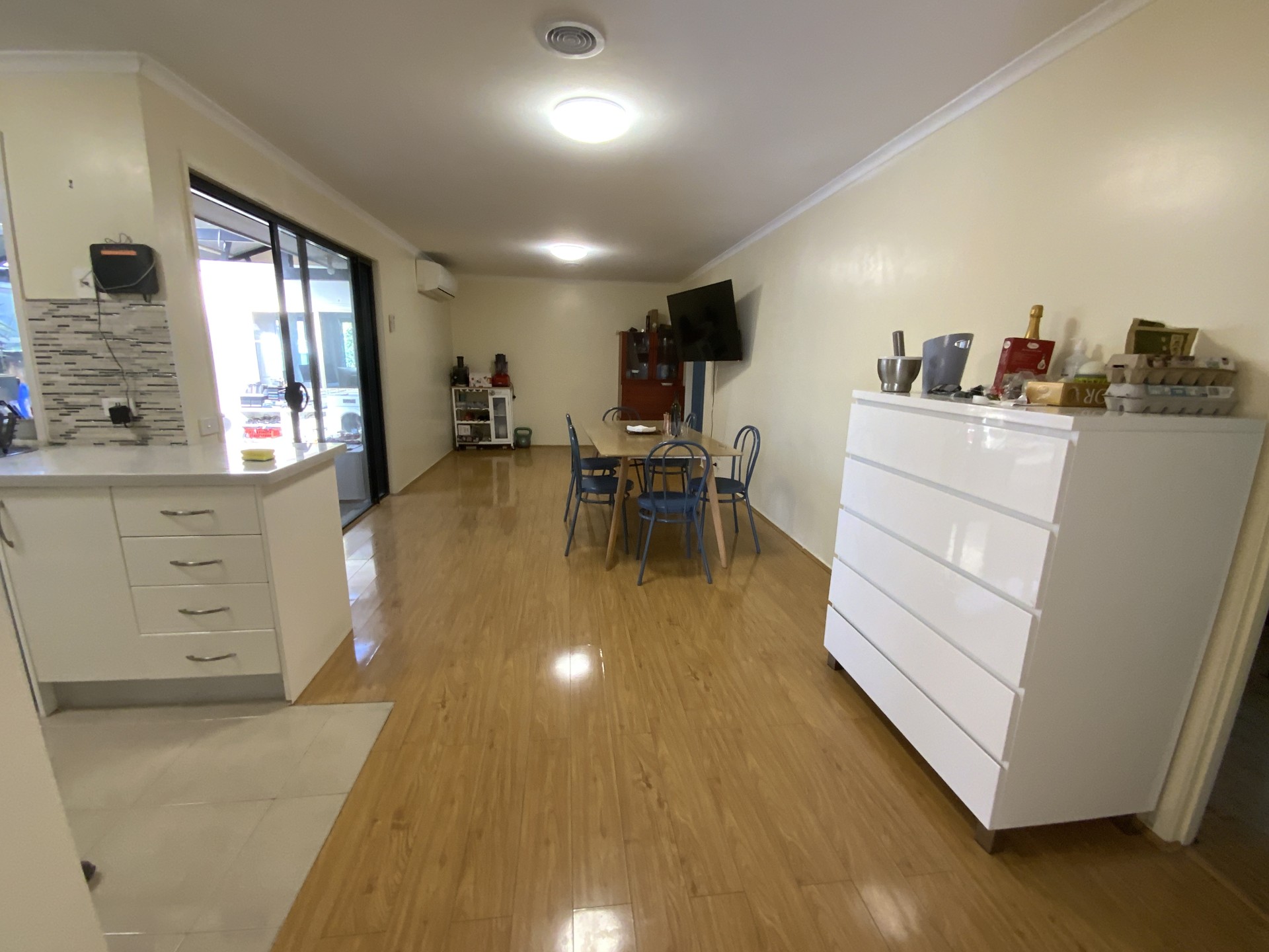 The kitchen views the meals and family area, and looks into the very large enclosed pergola.