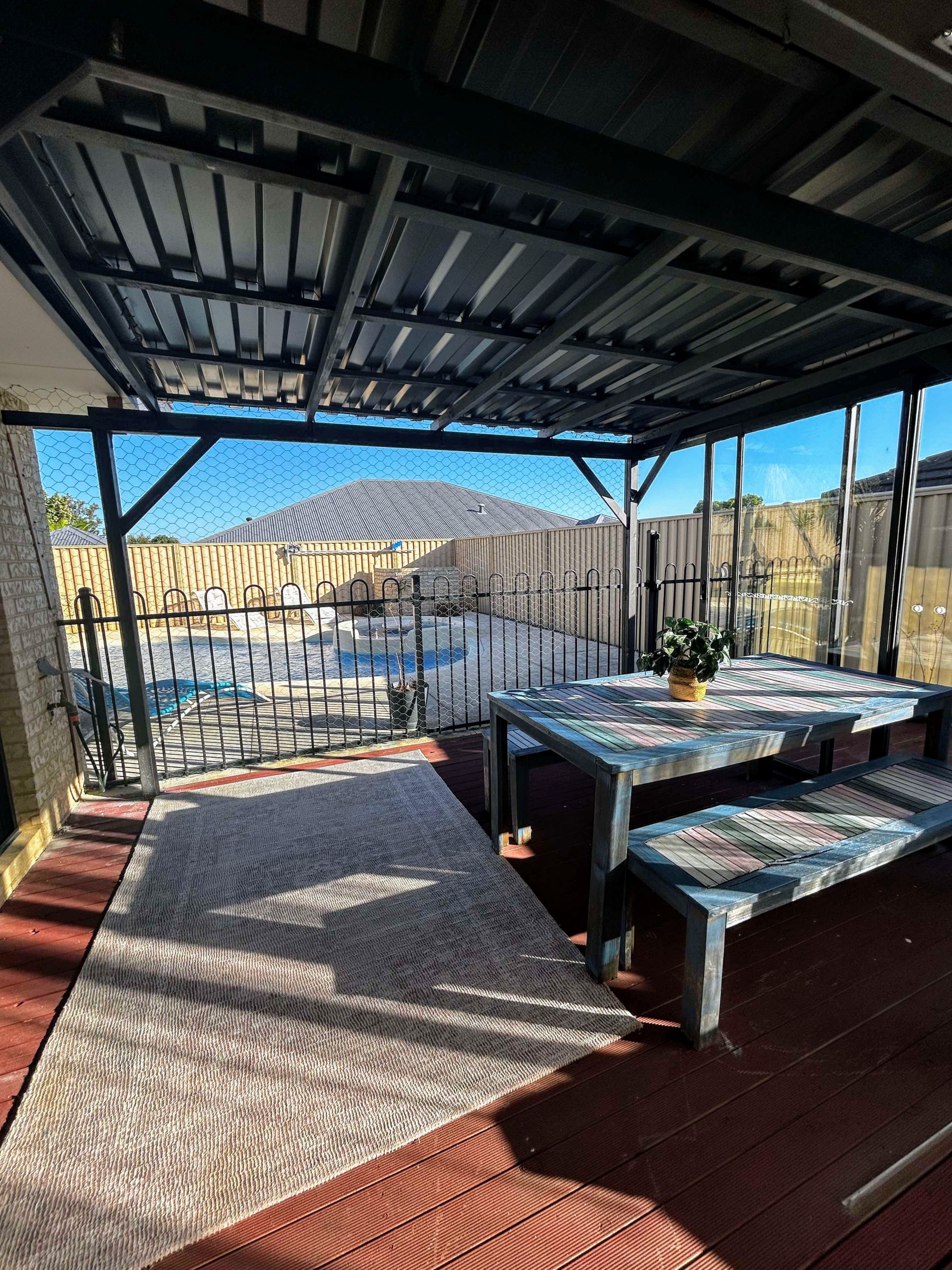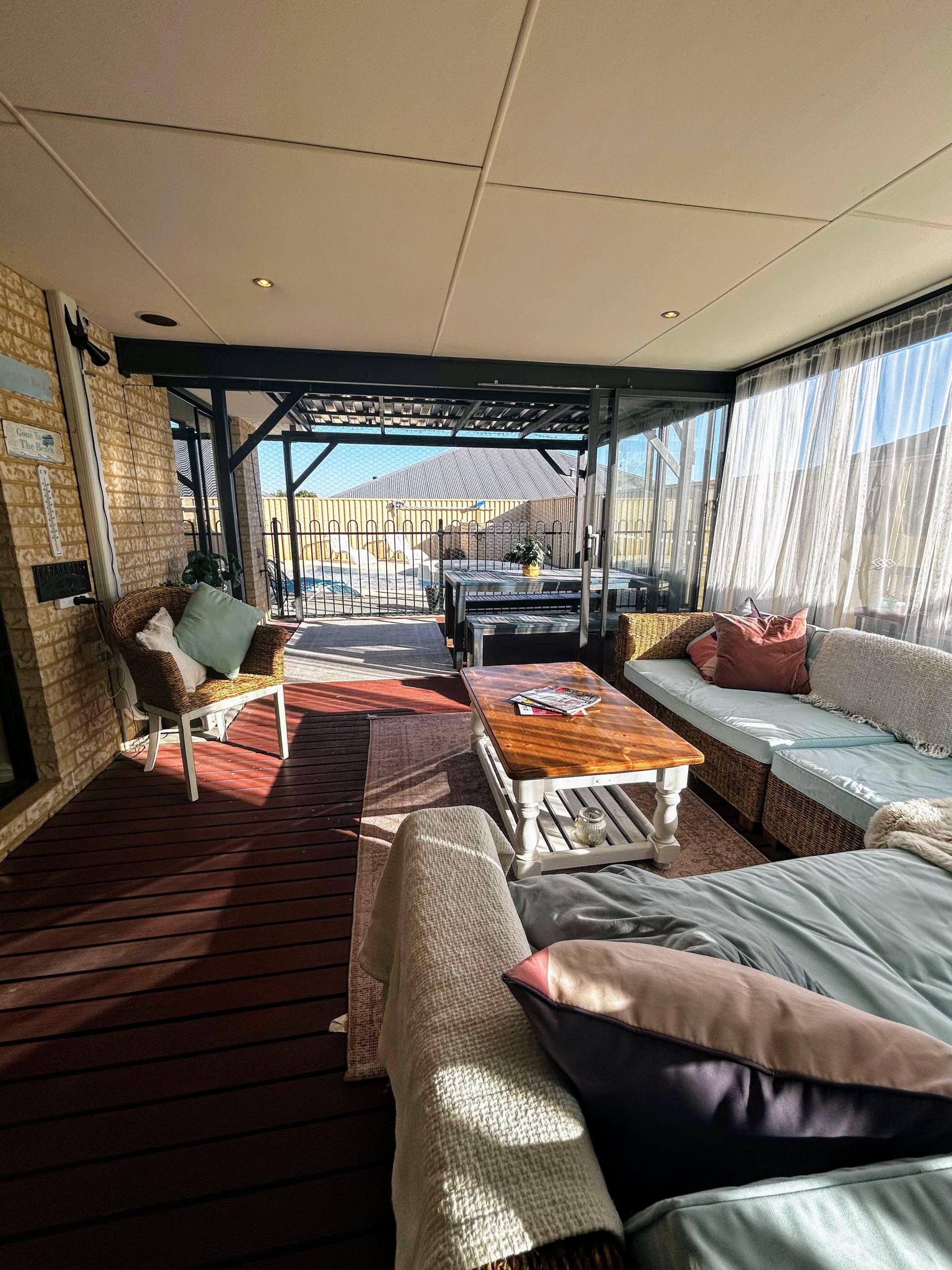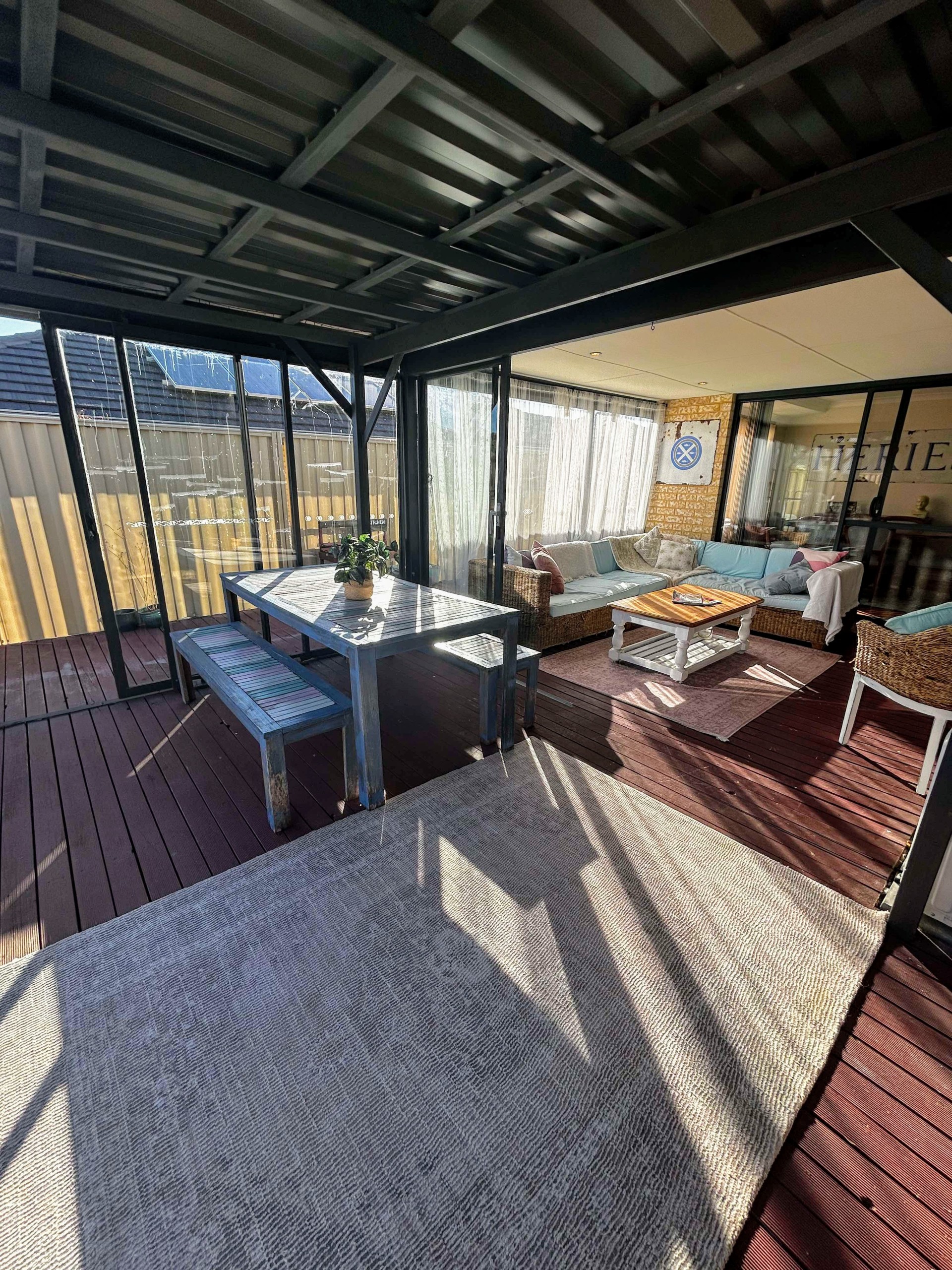 The decked and enclosed alfresco is large enough for both sitting and dining.