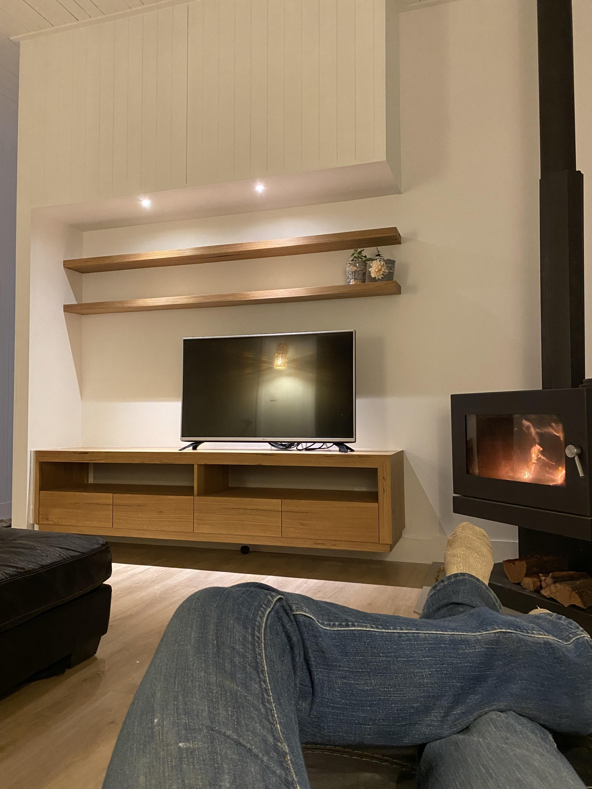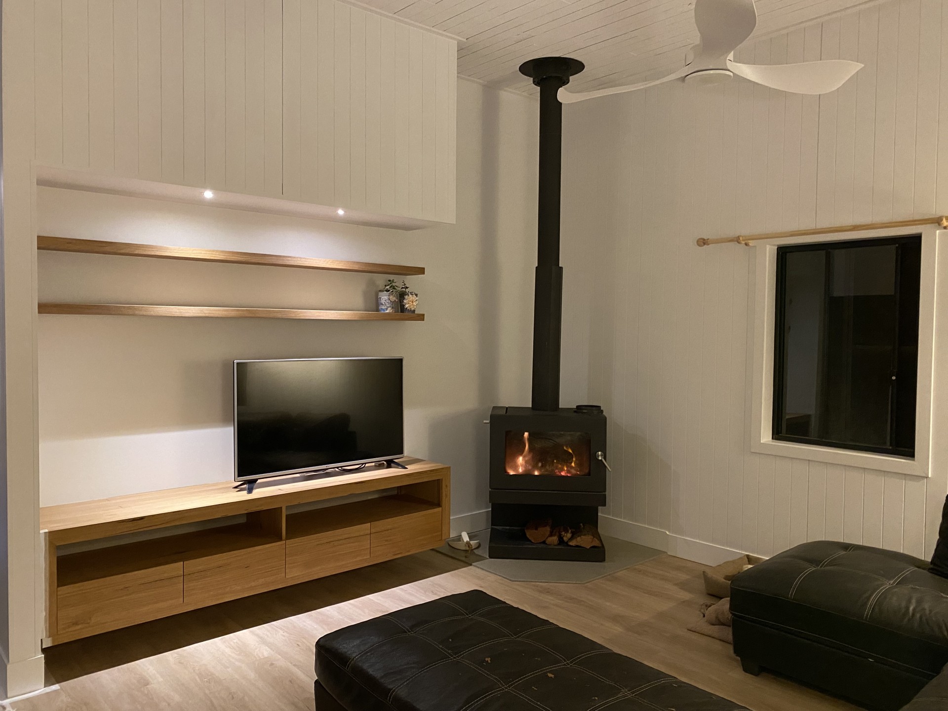 The family room houses built in entertainment unit and local blackbutt timber picture shelving, and a roaring wood heater that heats the whole home on those chilly winter nights.