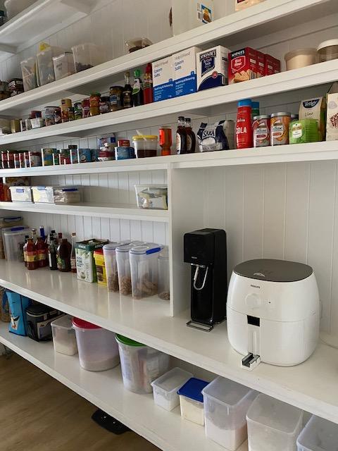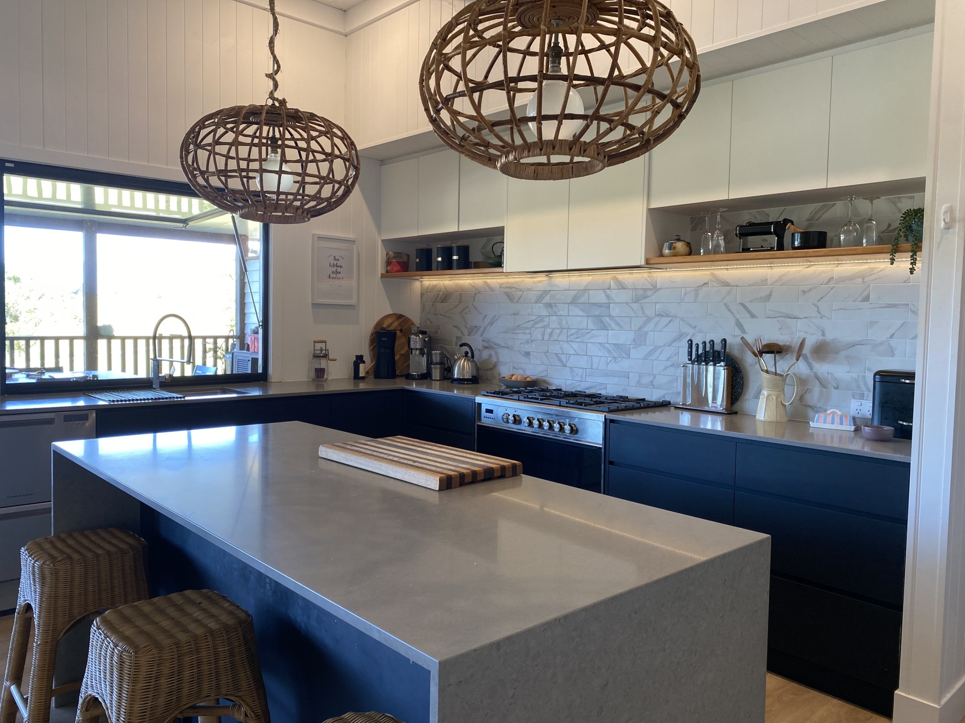 An entertainers kitchen with stone waterfall bench tops, 900mm dual fuel oven/stovetop, dish drawer dishwasher, a walk-in pantry reminiscent of the cattle station storerooms of yesteryear, and a gas strut window opening out to a stone top outdoor servery on the insulated undercover deck.