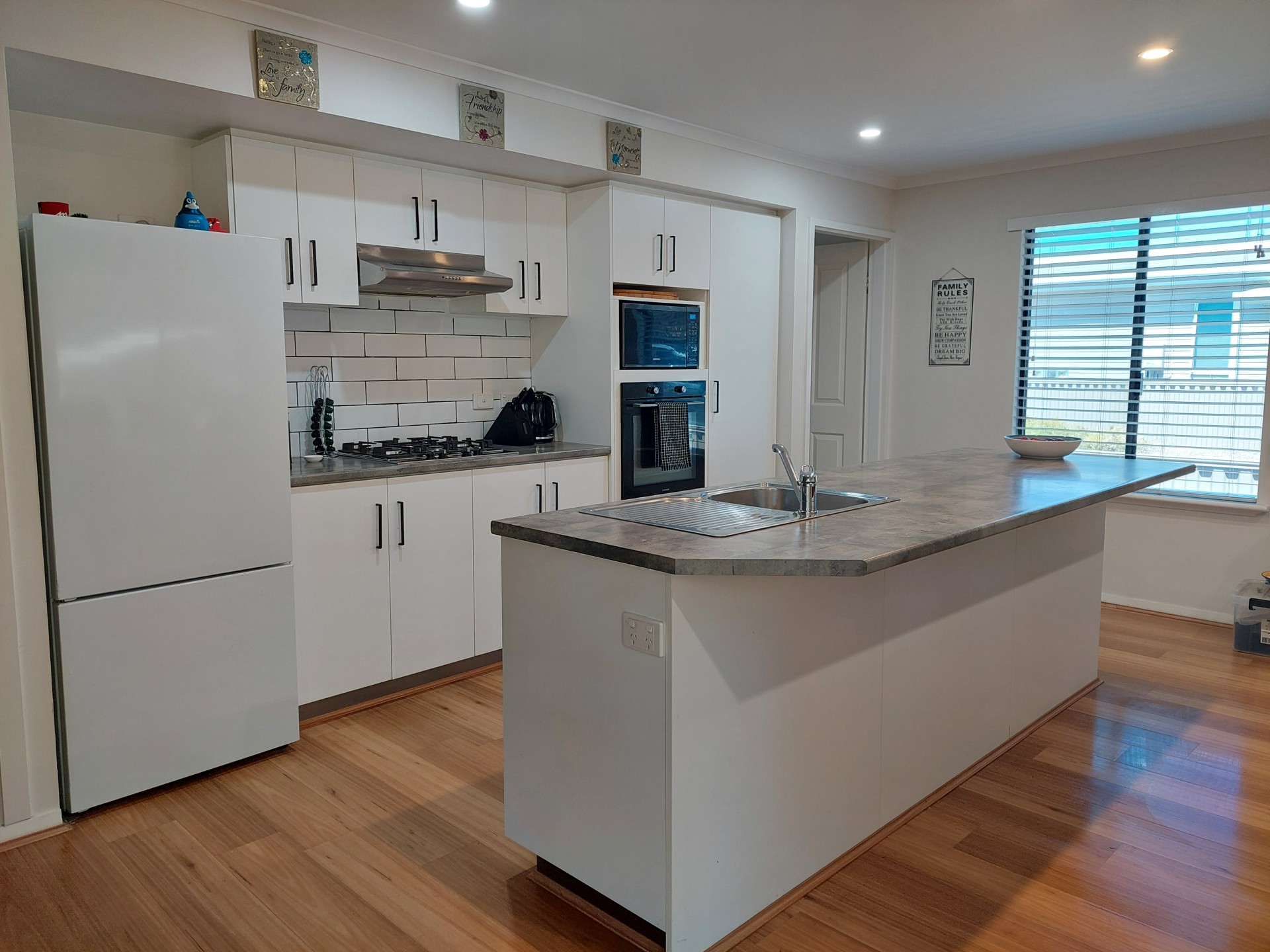 Positioned on one of the larger blocks in the complex this home of modern design features a large open plan kitchen with near new Bosch appliances including cooktop, oven and dishwasher, a large island bench separates the dining area where there is room for an 8 piece dining table. The area also flows to the family / lounge area; in addition via wooden French doors that open onto a semi enclosed Jarrah floor deck area enclosed with glass panels and roller blinds.
