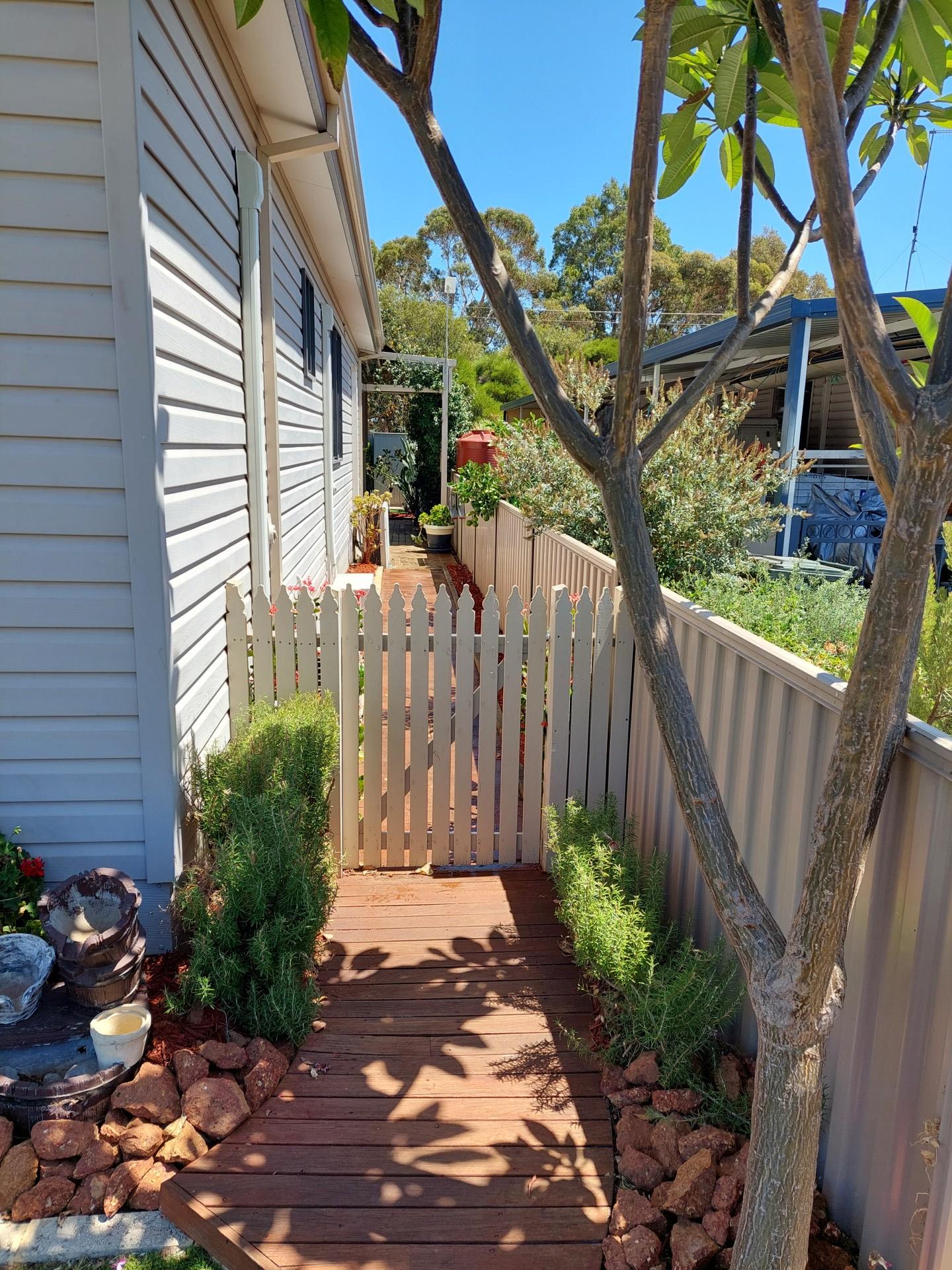 Looking out from the rear deck there is an easy care backyard, artificial lawn, plants are roses, natives, Bird of Paradice. with a backdrop of large trees. Blue Rens frequent the area.