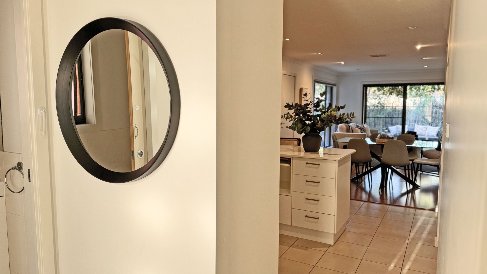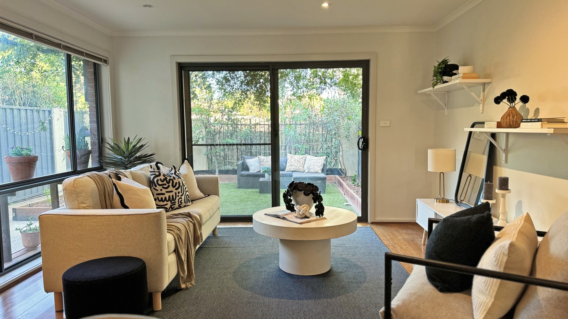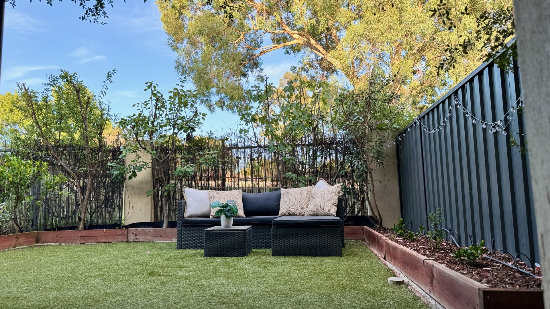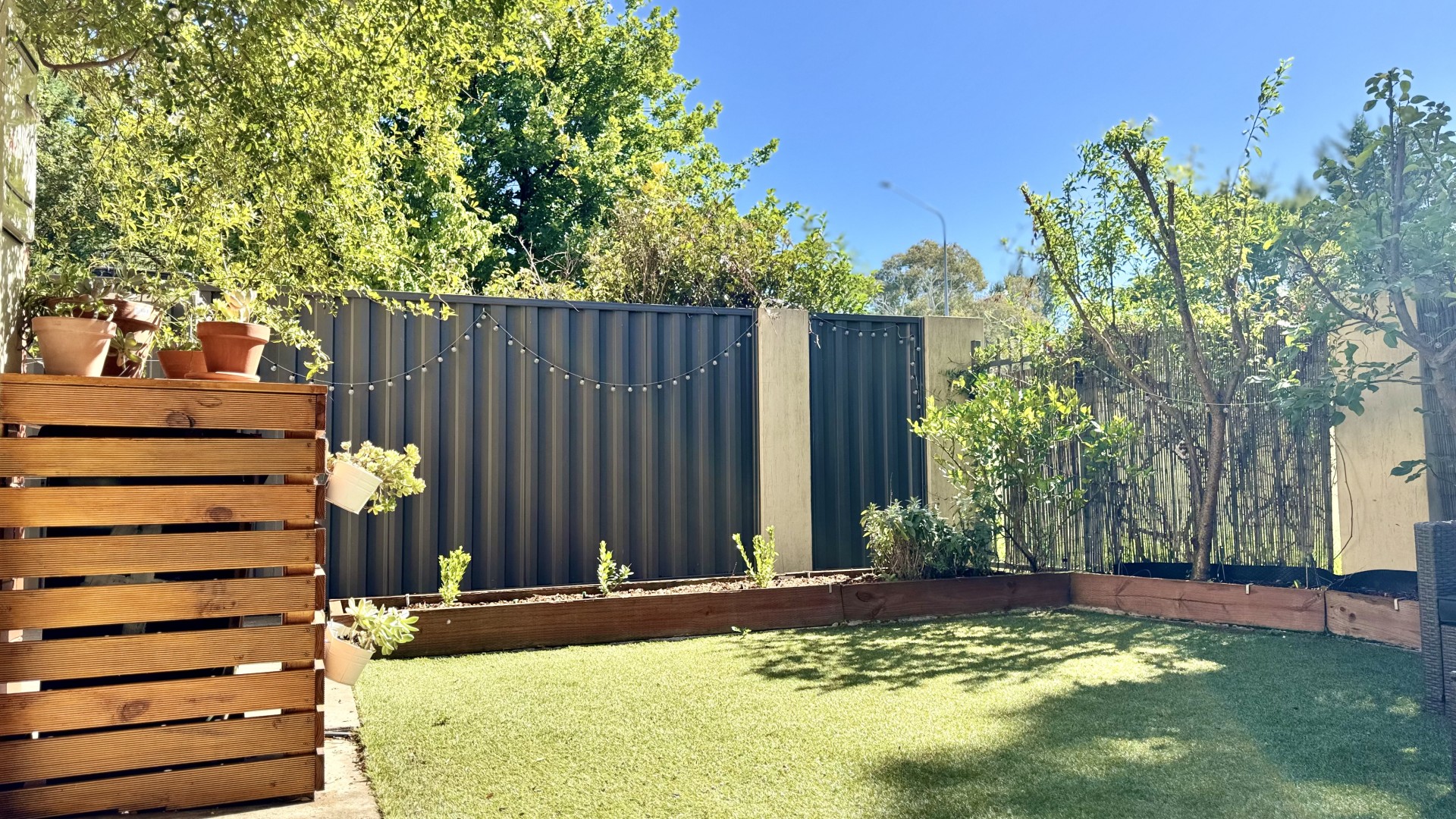 The sunny and low-maintenance backyard is perfect for relaxation and entertaining guests, featuring established fruit trees and shrubs, fully auto-irrigated garden beds and an artificial turf, means no mowing! A sliding door from the living area seamlessly connects the indoors with this green and peaceful outdoor space. Nearby trees provide the perfect balance between sun and shade during summer, and warmth during winter.