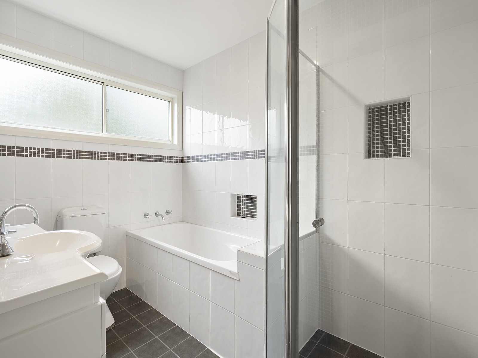 " Two stylish bathrooms with semi-frameless shower, en suite with large bathtub