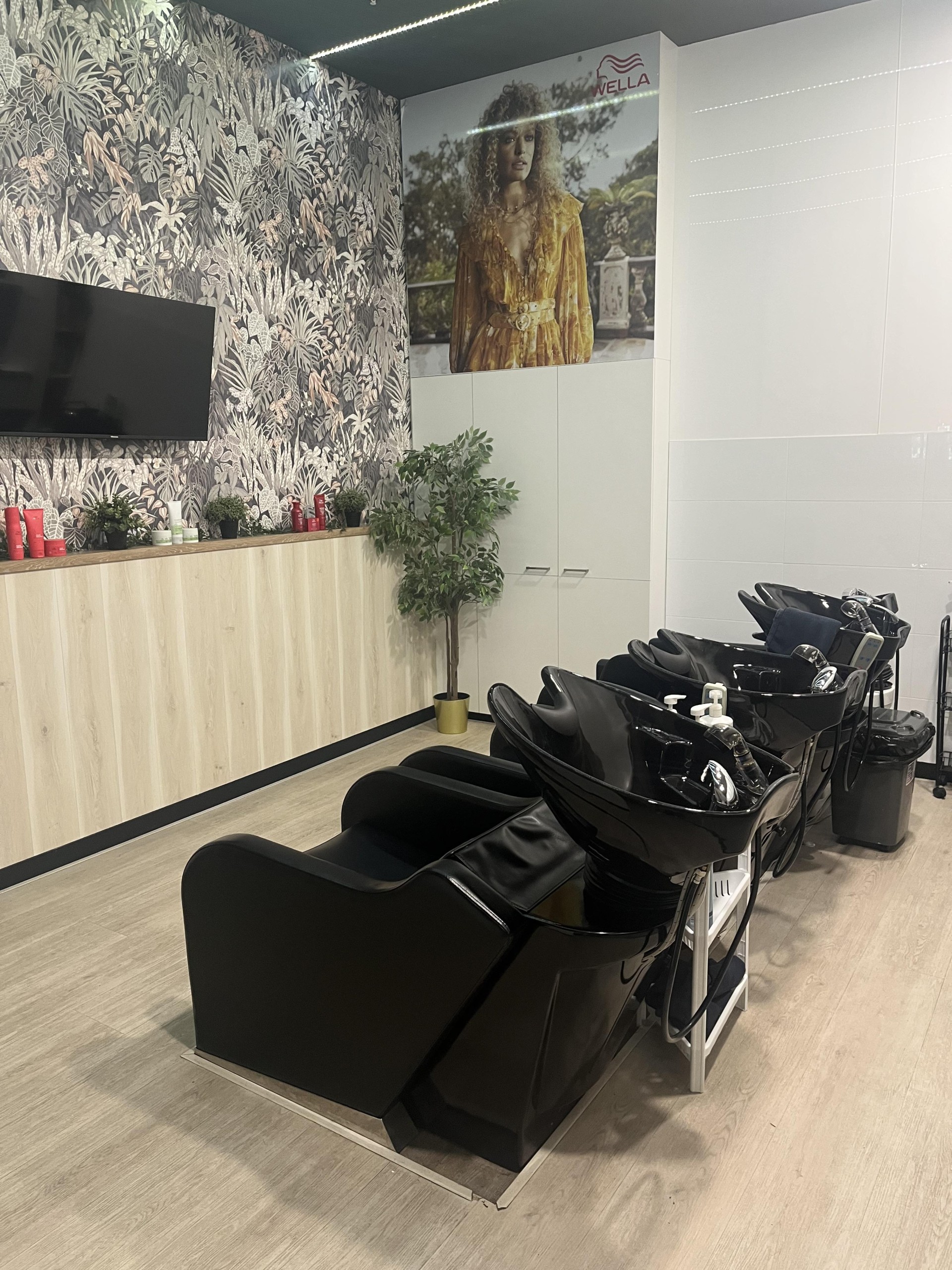 Four wash basins in the rear of the salon ensuring privacy and comfort for all clients.