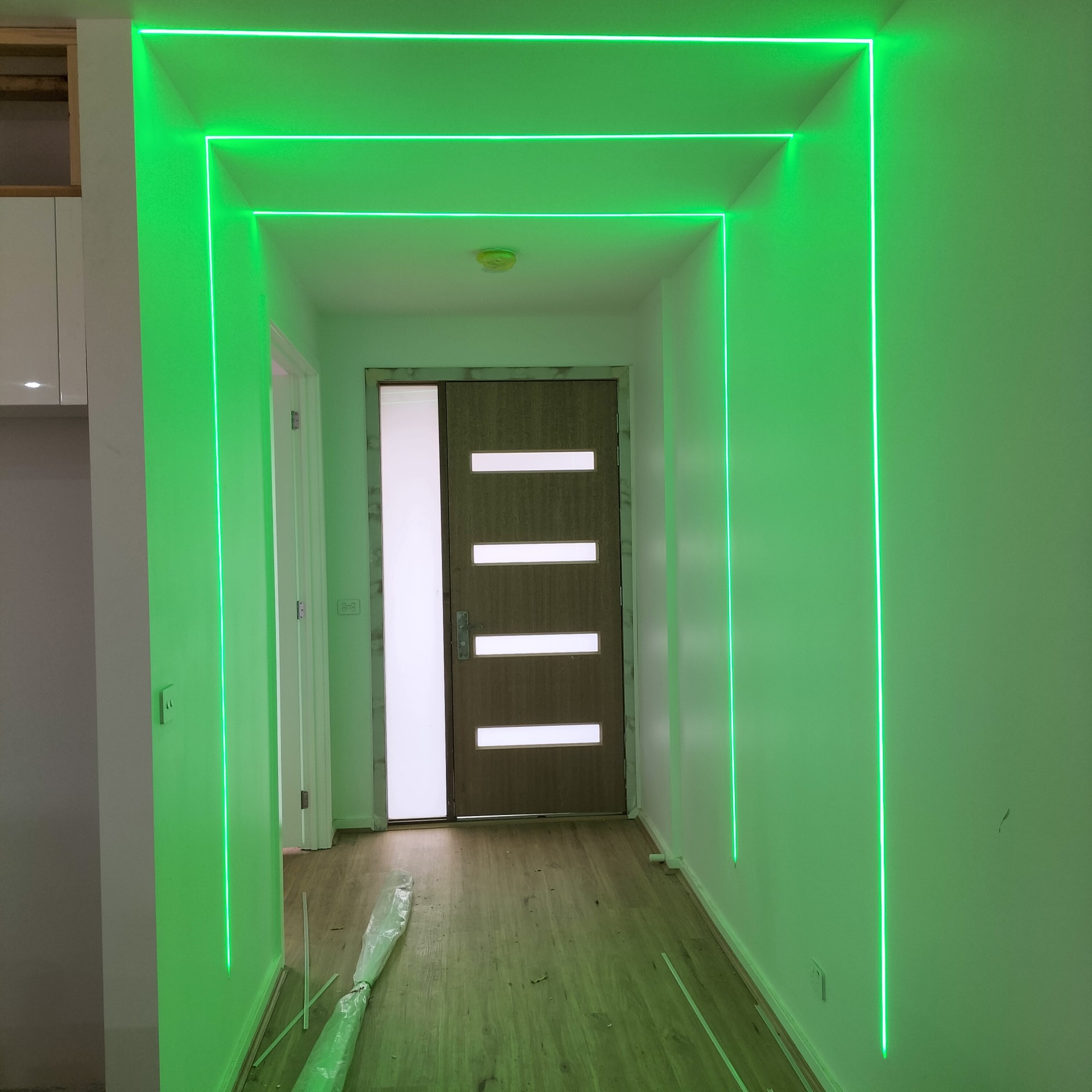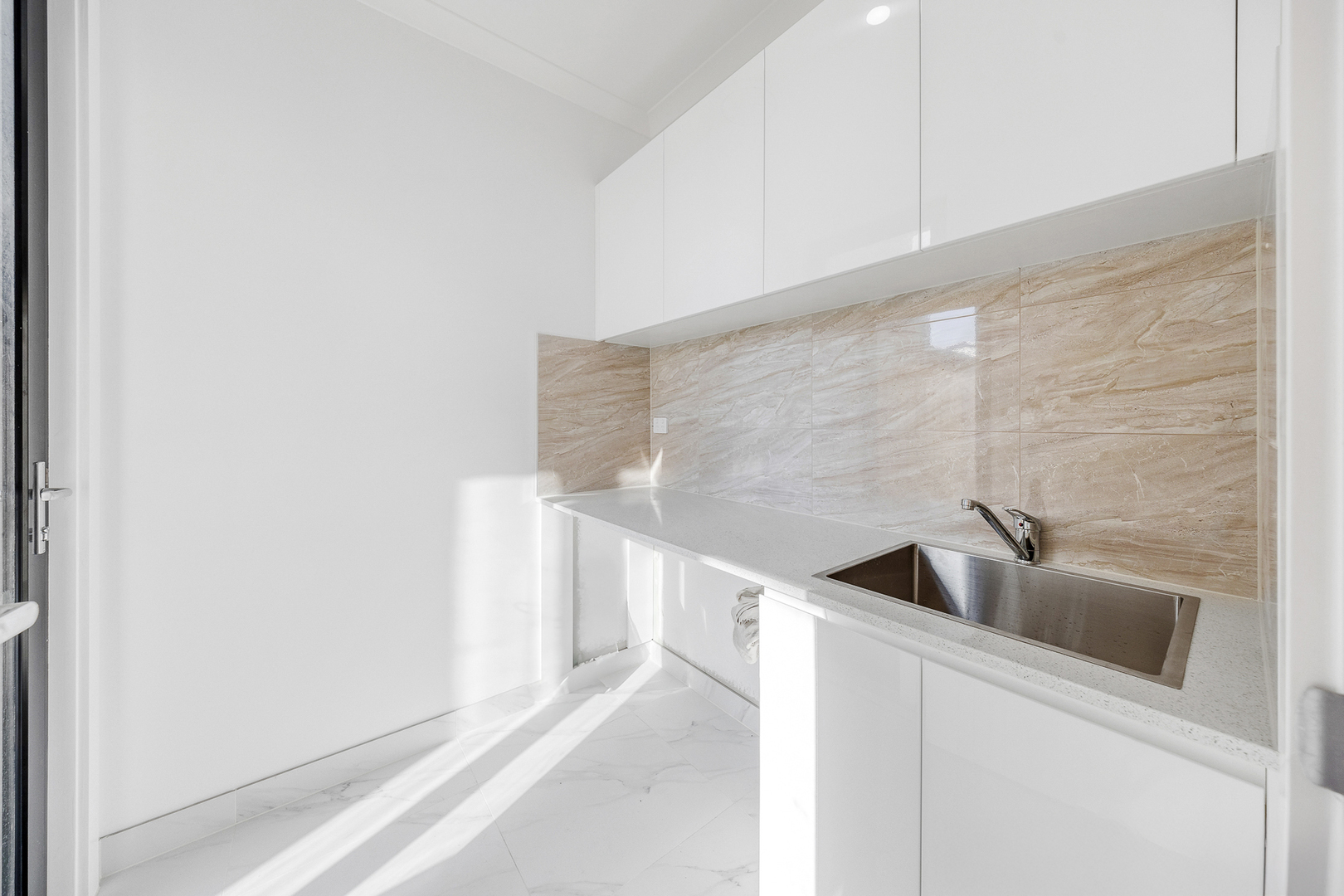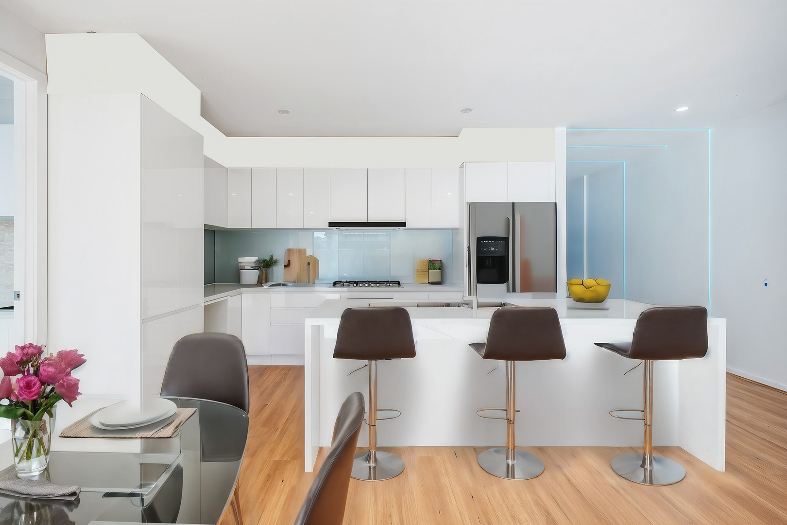 - High ceilings and quality finishes, including chic timber-look hybrid flooring, LED downlights, and ambient lighting at the entrance, creating an inviting modern atmosphere.