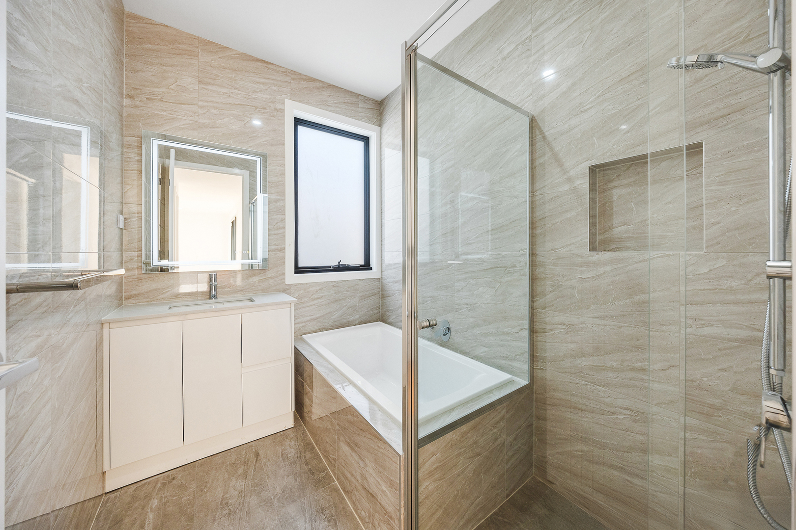 - Stylish main bathroom featuring a deep-set bathtub and a separate shower, plus an extra powder room for guest convenience.