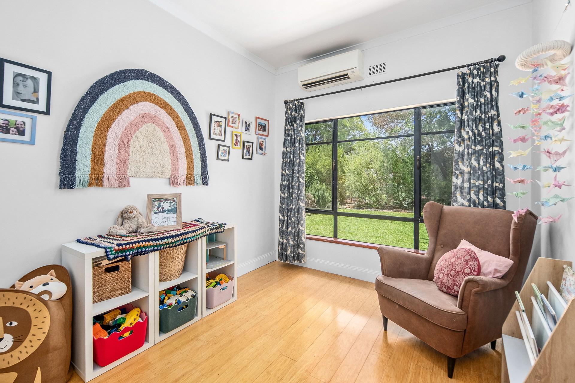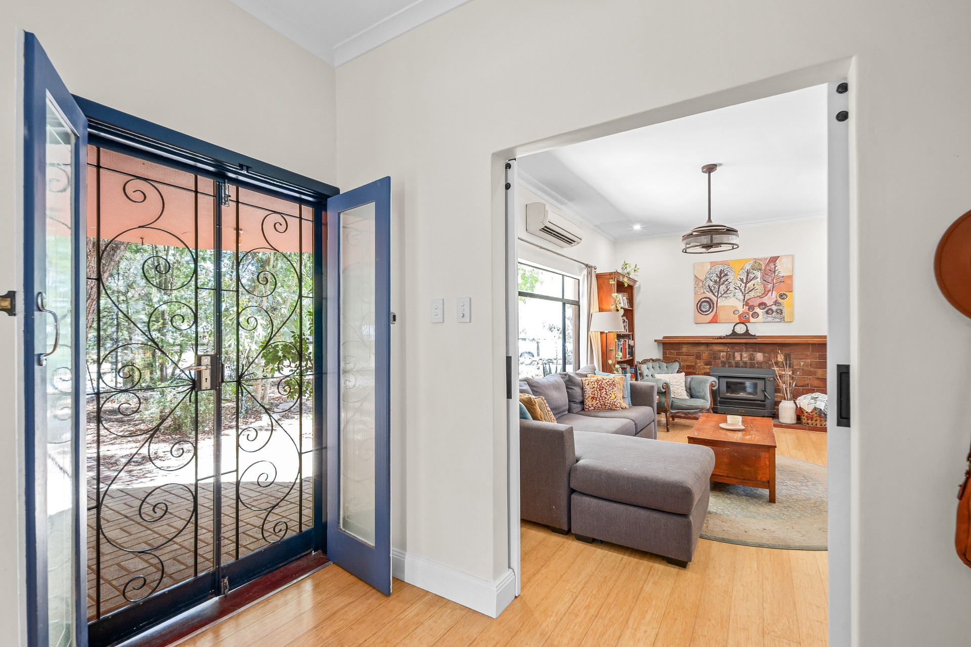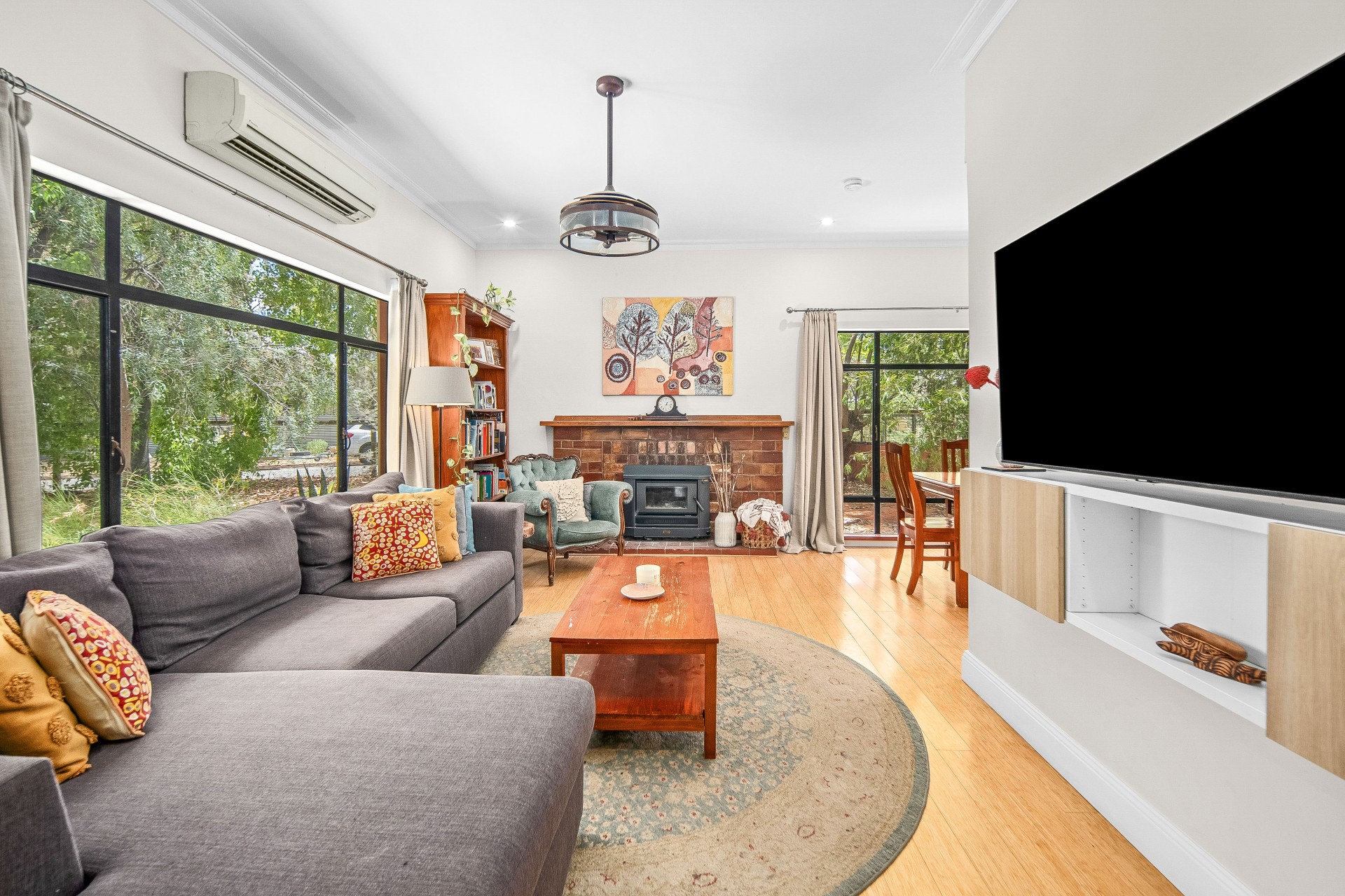 -A Coonara fireplace embedded in a brick mantle in the lounge adds warmth and charm, making this home a welcoming retreat in all seasons.