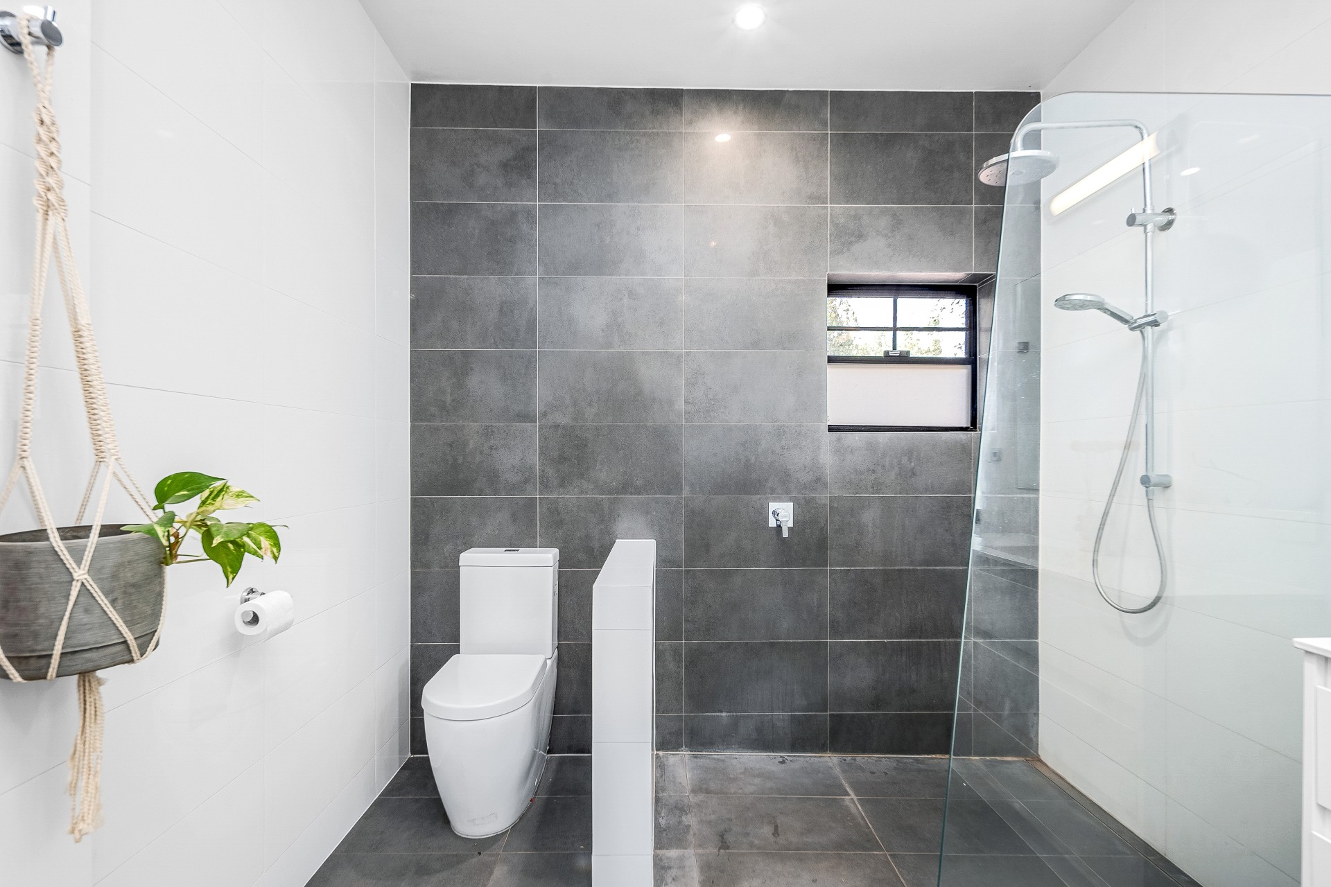 -The spacious, renovated bathroom features quality finishes and a toilet, offering a stylish and functional space for the family.