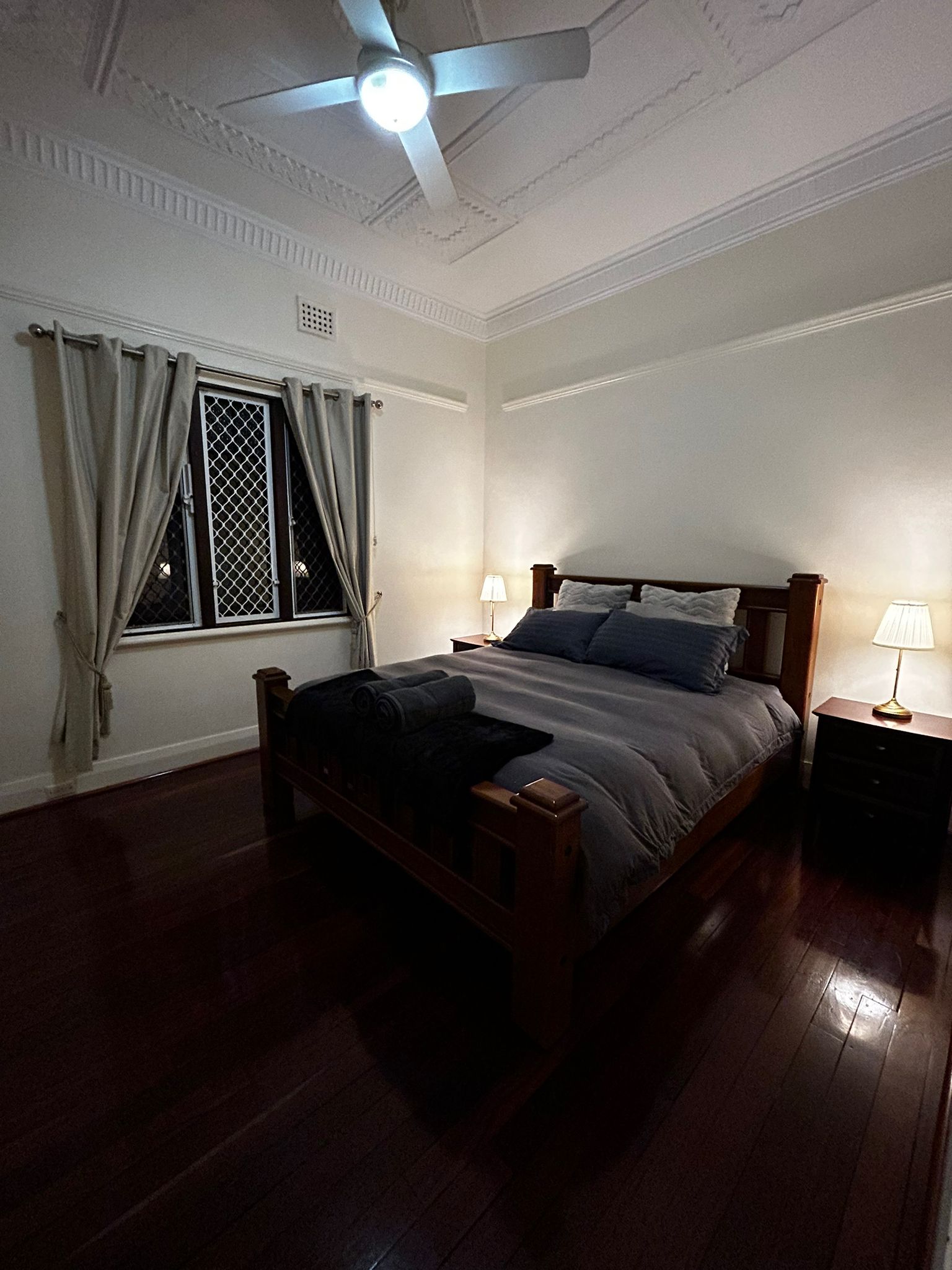 The beautifully maintained heritage-style cottage combines simplicity and elegance. Inside, find rooms lined with polished floorboards, accentuated by high, ornate ceilings that evoke grandeur and space. Comfort is paramount with cozy, well-appointed bedrooms featuring plush beds for a restful night. The clean, straightforward decor enhances the serene ambiance. The highlight is our massive backyard, adorned with marquee lights and lush grass, offering ample space for lawn bowls, soccer, or cricket - perfect for relaxing Perth evenings or active afternoons. Experience a blend of classic charm and modern comfort for a memorable stay.