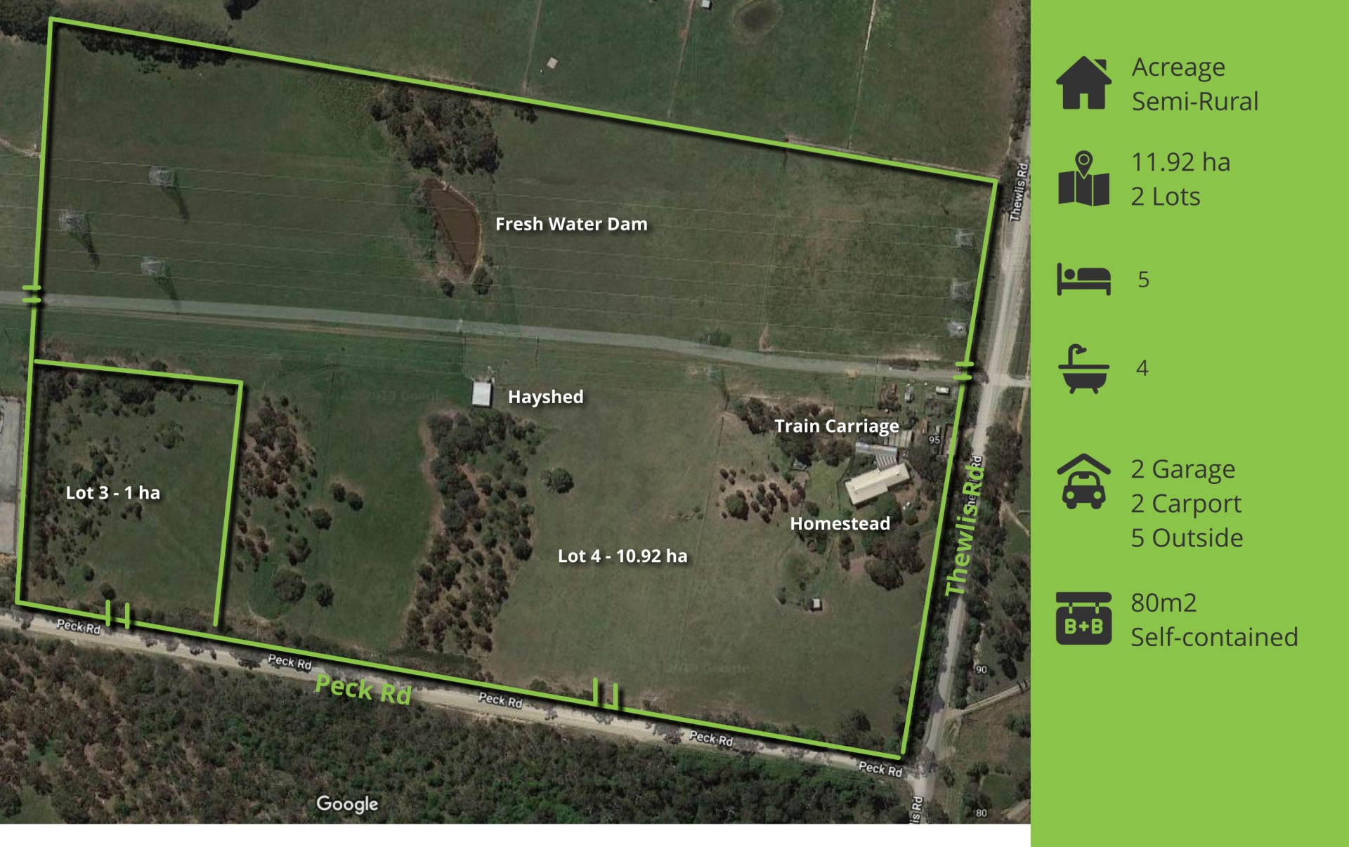 o Lot 3: 1 ha (2.47 acres) - Flat, vacant block with Peck Road access and building envelope.